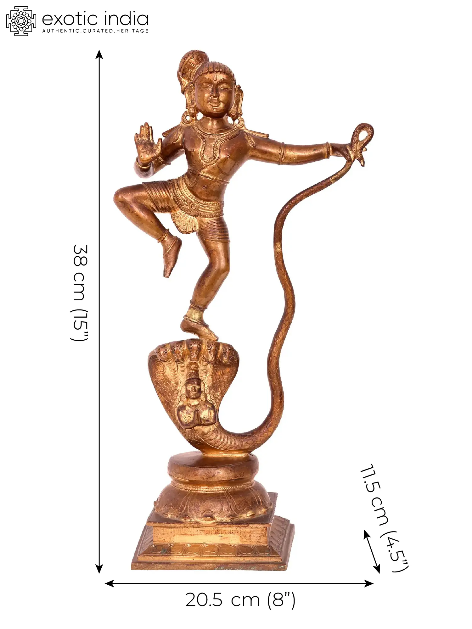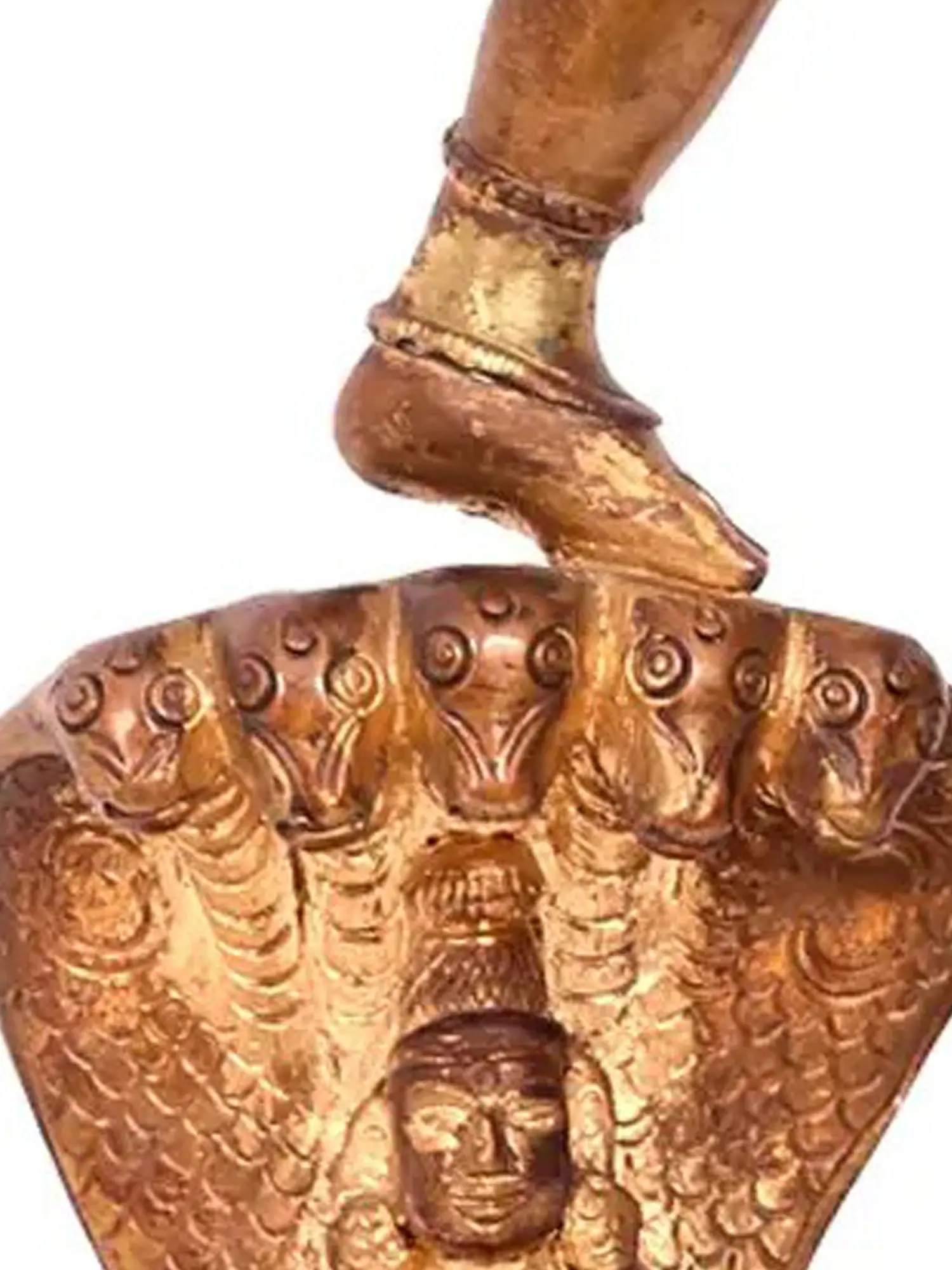Crafted in Panchaloha bronze from “Swamimalai” using the ancient “Madhuchista Vidhana (Lost-Wax) technique”, this artwork symbolises Krishna’s role as the sustainer and preserver of the universe, the triumph of divine goodness over negativity and the protection of the environment.