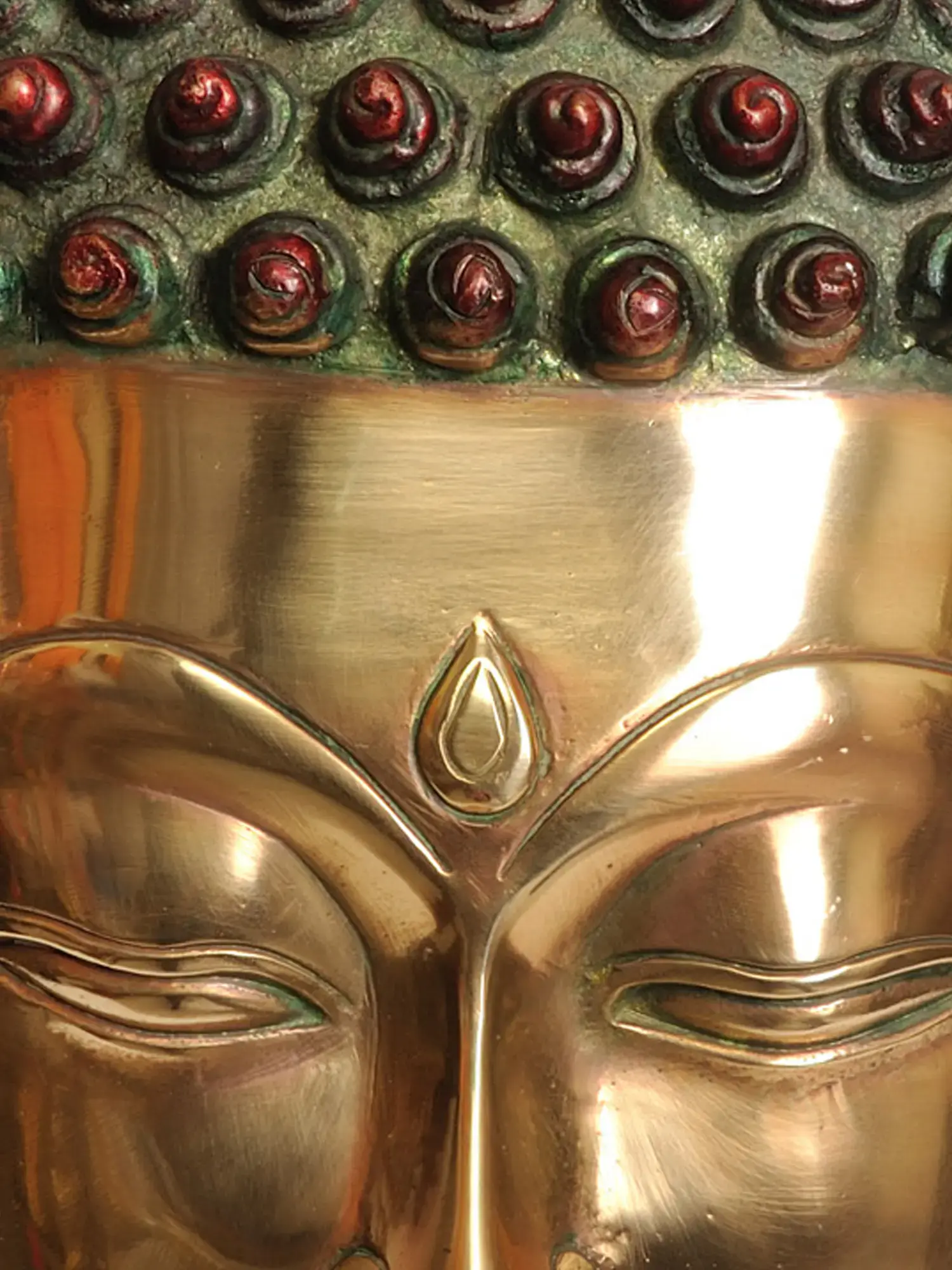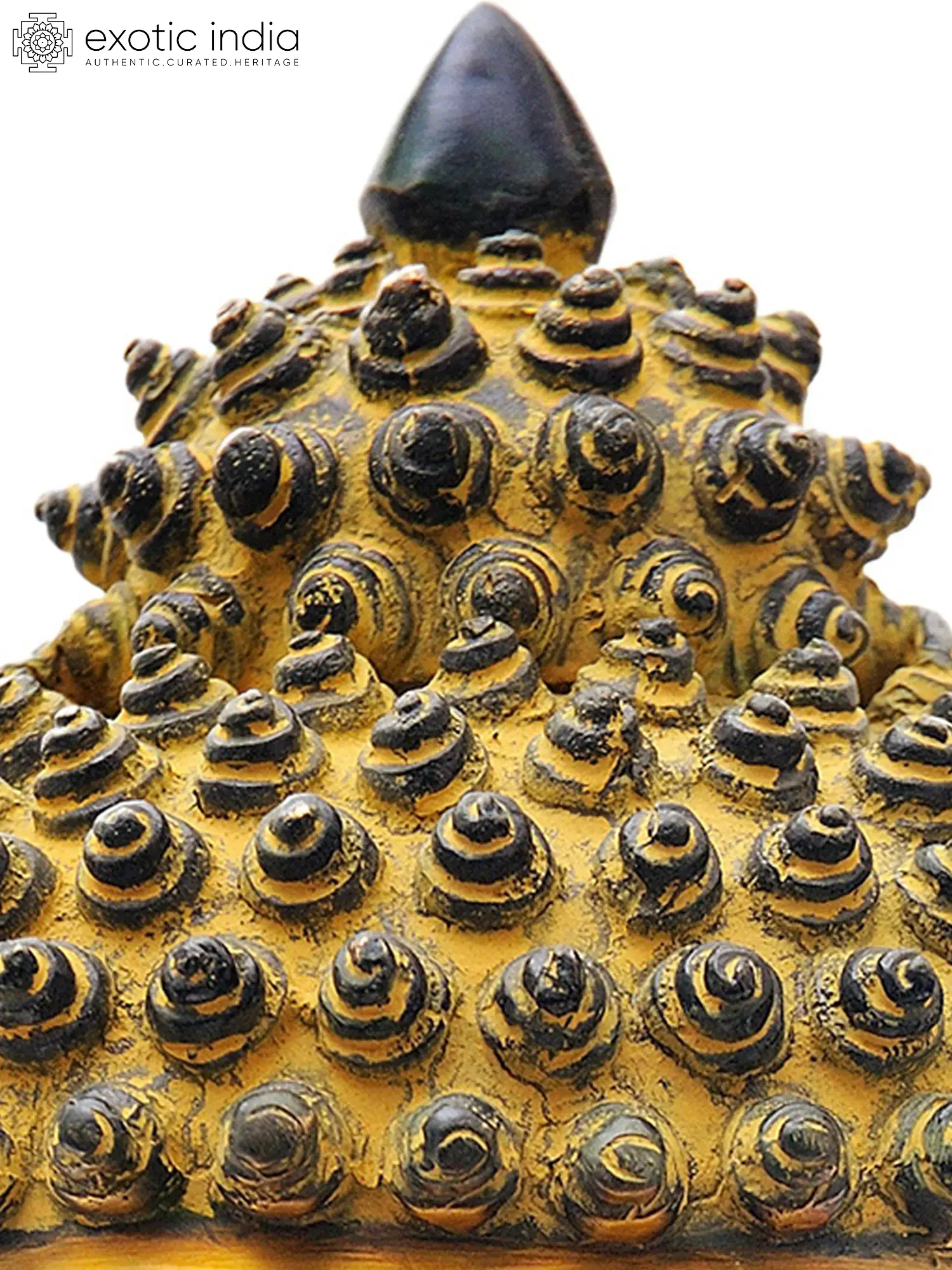 This magnificent Large Size Lord Buddha Head in Brass is a testament to artistry and spirituality. Meticulously handmade, it boasts a stunning lacquer finish in a harmonious blend of gold and dark brown. The golden face symbolizes grace and wisdom, inviting tranquility and enlightenment. The Buddha's serene countenance, eyes half-closed in deep contemplation, exudes an aura of inner peace. The intricate detailing of snail-like circular dots in the Buddha's locks adds a touch of elegance and authenticity. This brass masterpiece not only captivates the eye but also resonates with the soul, serving as a profound representation of serenity and enlightenment.