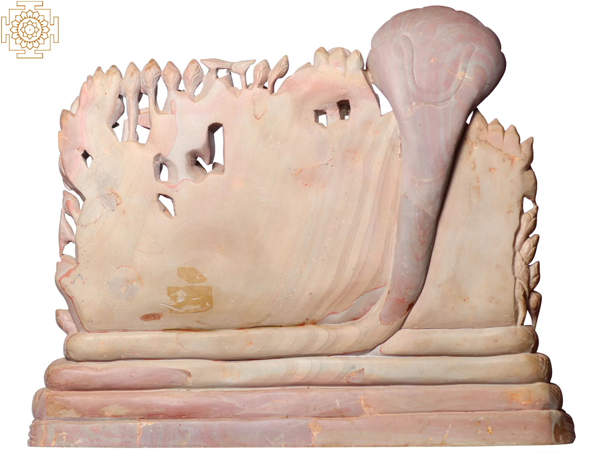 Behold a breathtaking testament to divine serenity and cosmic artistry, this exquisite statue captures Lord Vishnu in his eternal slumber, Anantashayana. Reclining upon the coils of the great serpent Shesha, whose five hoods unfurl to form a celestial canopy, Vishnu embodies the principle of preservation and the boundless expanse of the universe. The intricate details of the pink stone are a marvel, each scale on Shesha, each fold of Vishnu's divine form, and the delicate adornments meticulously carved by master artisans from Odisha, a region renowned for its ancient stone carving traditions. The posture of Anantashayana, also known as Vishnupada or Hari-Nidra, signifies the meditative state from which the cosmos is maintained. During the dissolution of the universe, it is said that Vishnu alone remains, resting on Shesha, awaiting the opportune moment to recreate the world. This profound concept of cyclical creation and destruction, a cornerstone of Hindu philosophy, is beautifully rendered in this sculpture. The serene expression on Vishnu's face, with his eyes gently closed, suggests a deep inward focus, the source of all creation. Flanking the divine couple are celestial attendants, their graceful forms adding to the opulence and sacredness of the scene. Notably present is Goddess Lakshmi, the embodiment of wealth, prosperity, and beauty, who is often depicted massaging Vishnu's feet. Her presence signifies the material and spiritual abundance that emanates from the divine union. The surrounding lotus motifs, often associated with purity and spiritual awakening, further enhance the sacred aura of the piece. The symbolism is rich; the lotus emerges from Vishnu's navel in some interpretations, signifying the birth of Brahma, the creator. This particular depiction beautifully encapsulates the essence of divine repose as the genesis of all existence. ––––––––––––––––––––