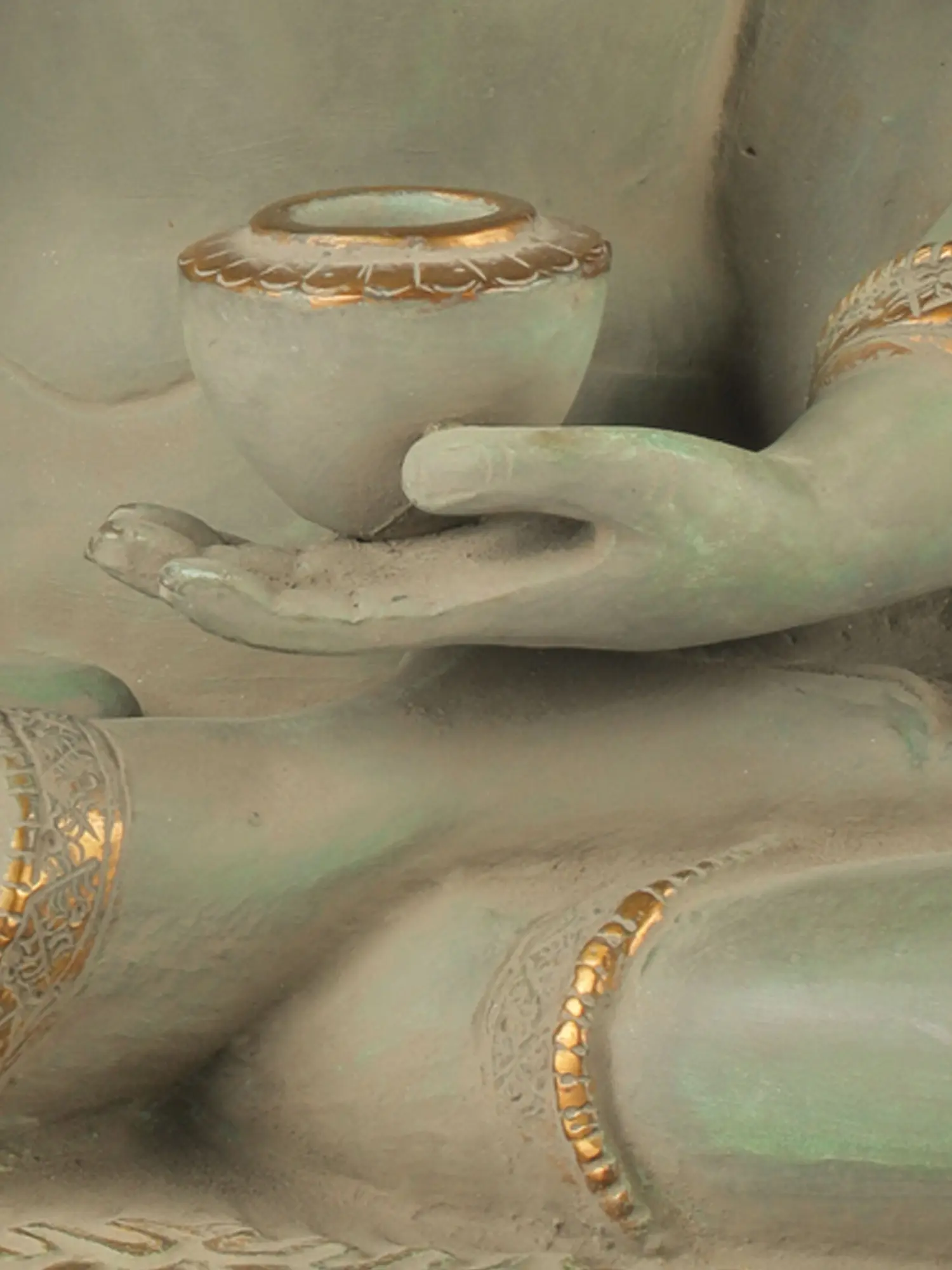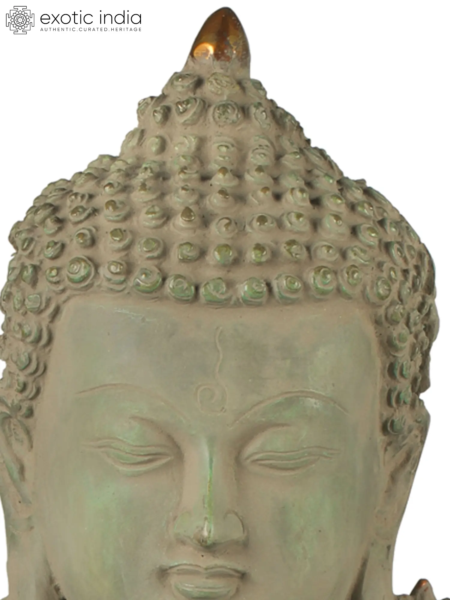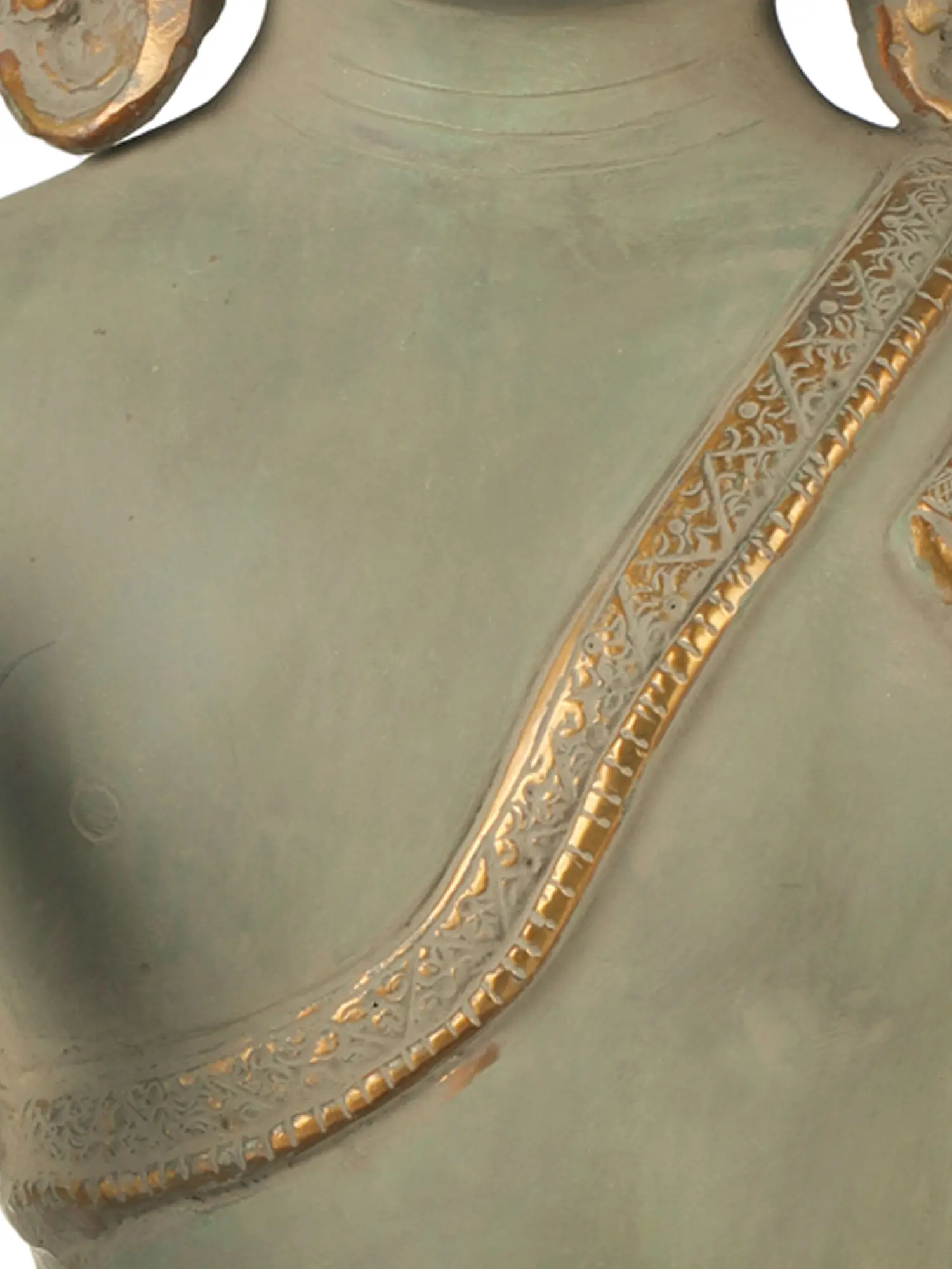 Handcrafted in India, a land steeped in spiritual heritage, this statue is a testament to the enduring artistry of traditional brass casting. The artisans have meticulously rendered every detail, from the intricate coils of the Buddha's ushnisha (the cranial protuberance symbolizing his wisdom) to the gentle curve of his serene expression. The robe is adorned with delicate gold accents, hinting at the opulence of spiritual realization and the preciousness of the teachings being imparted. The soft, verdigris-like patina lends an antique charm, suggesting a lineage of devotion and a timeless connection to the past.