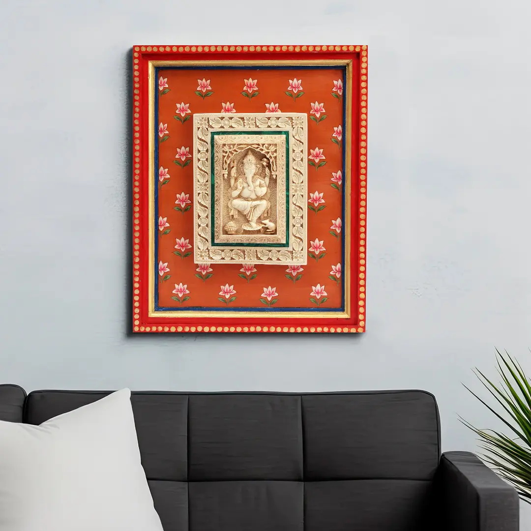 In a captivating fusion of wood and resin, Lord Ganapati comes alive, an eternal deity enshrined in a mesmerising wall hanging frame. Crafted with reverence, this divine masterpiece exudes an aura of eternal grace. The noble visage of “Lord Ganapati”, with his benevolent eyes and elephantine countenance, beckons with serene wisdom. The warm wood and translucent resin combine, creating an ethereal aura, as if the very essence of divinity is captured within. This resplendent creation captures the soul of the elephant-headed god, offering a glimpse into the mystical realm, where obstacles vanish, and blessings flow, all encased in artistry and devotion.