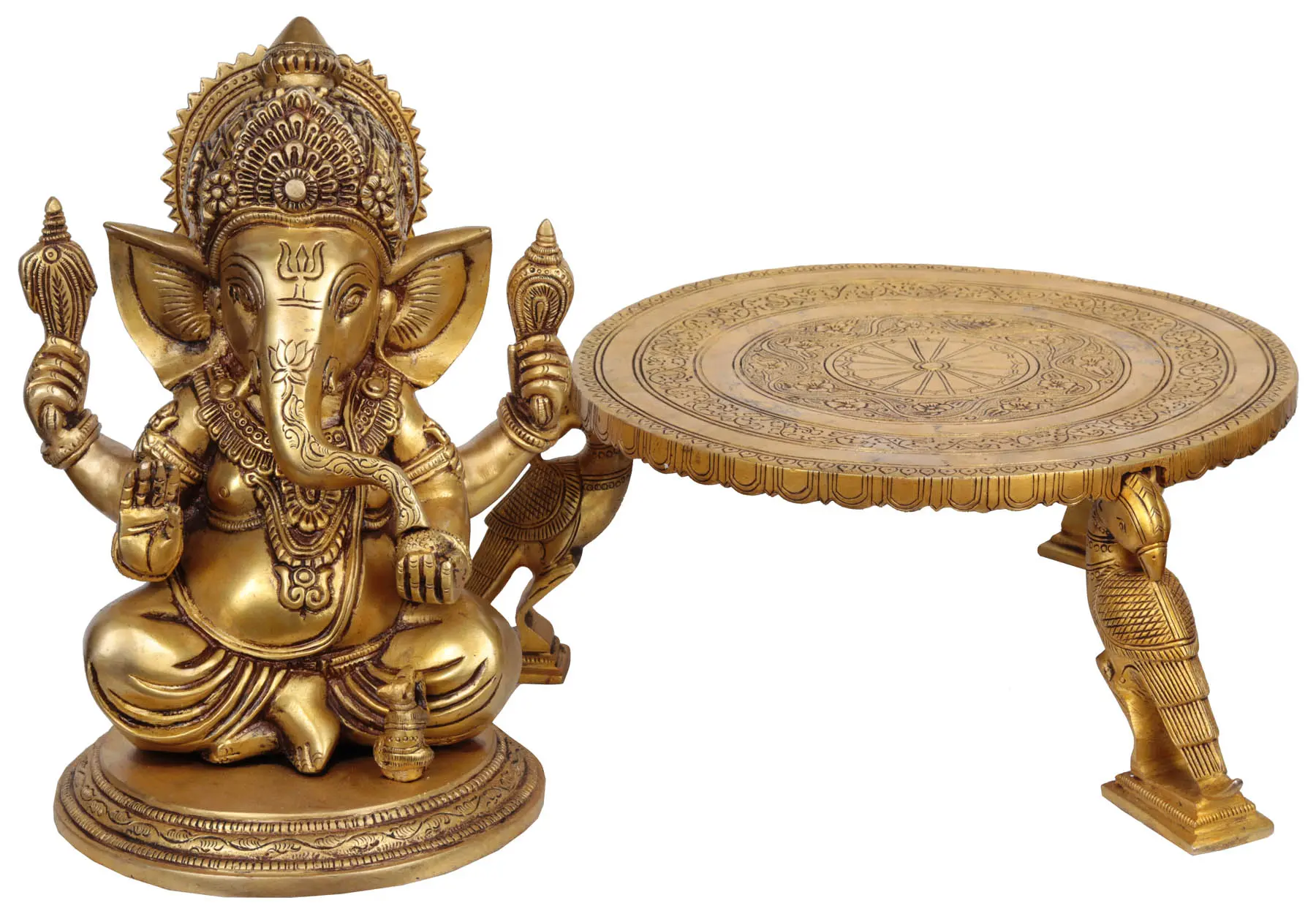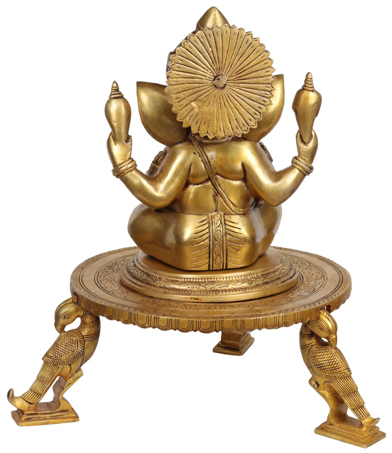 Done up in brass and poised on an exquisite chowki held up by parrot-shaped legs, this brass statue of Ganesha is a symbol of Oriental life and beauty.