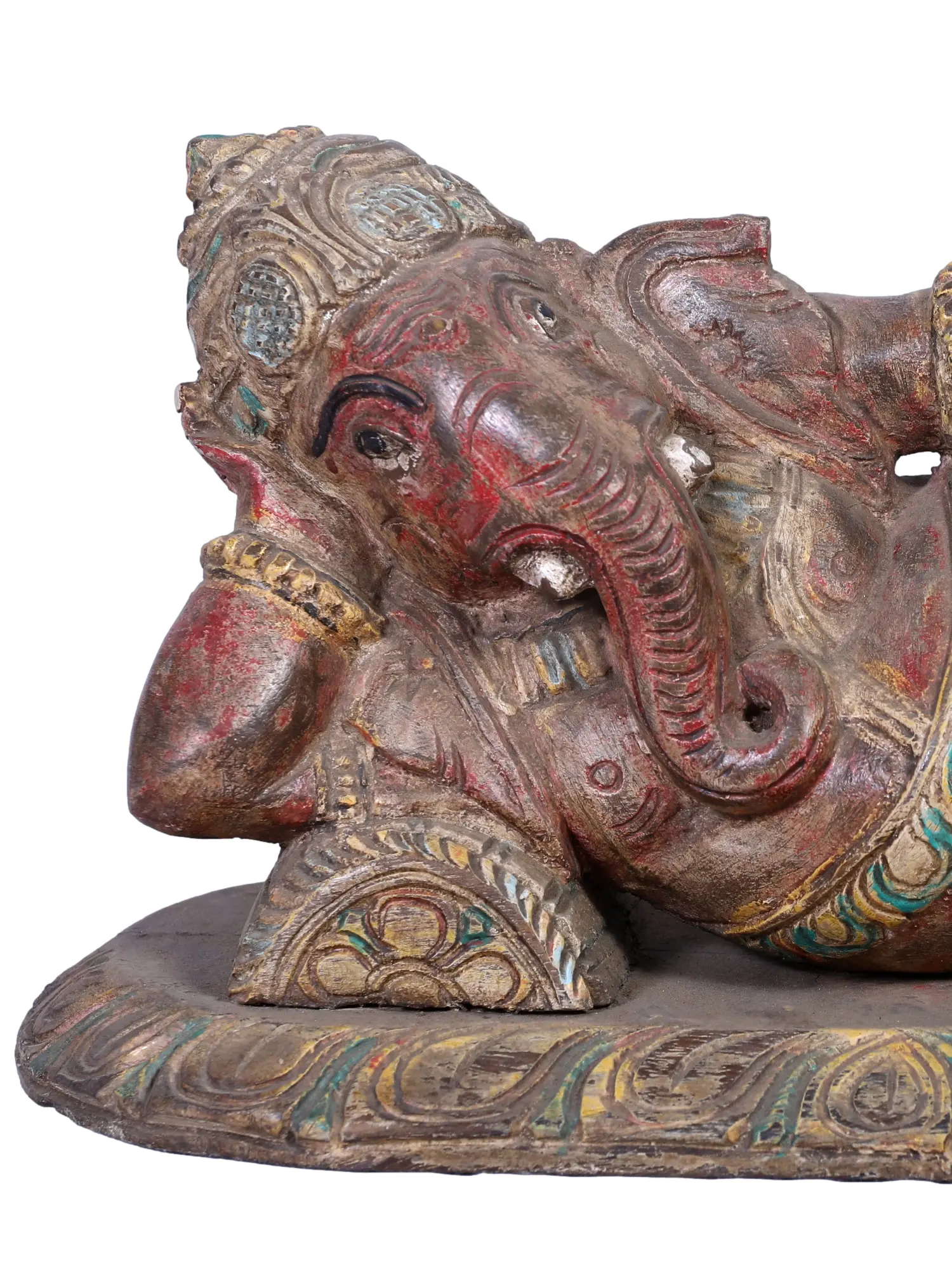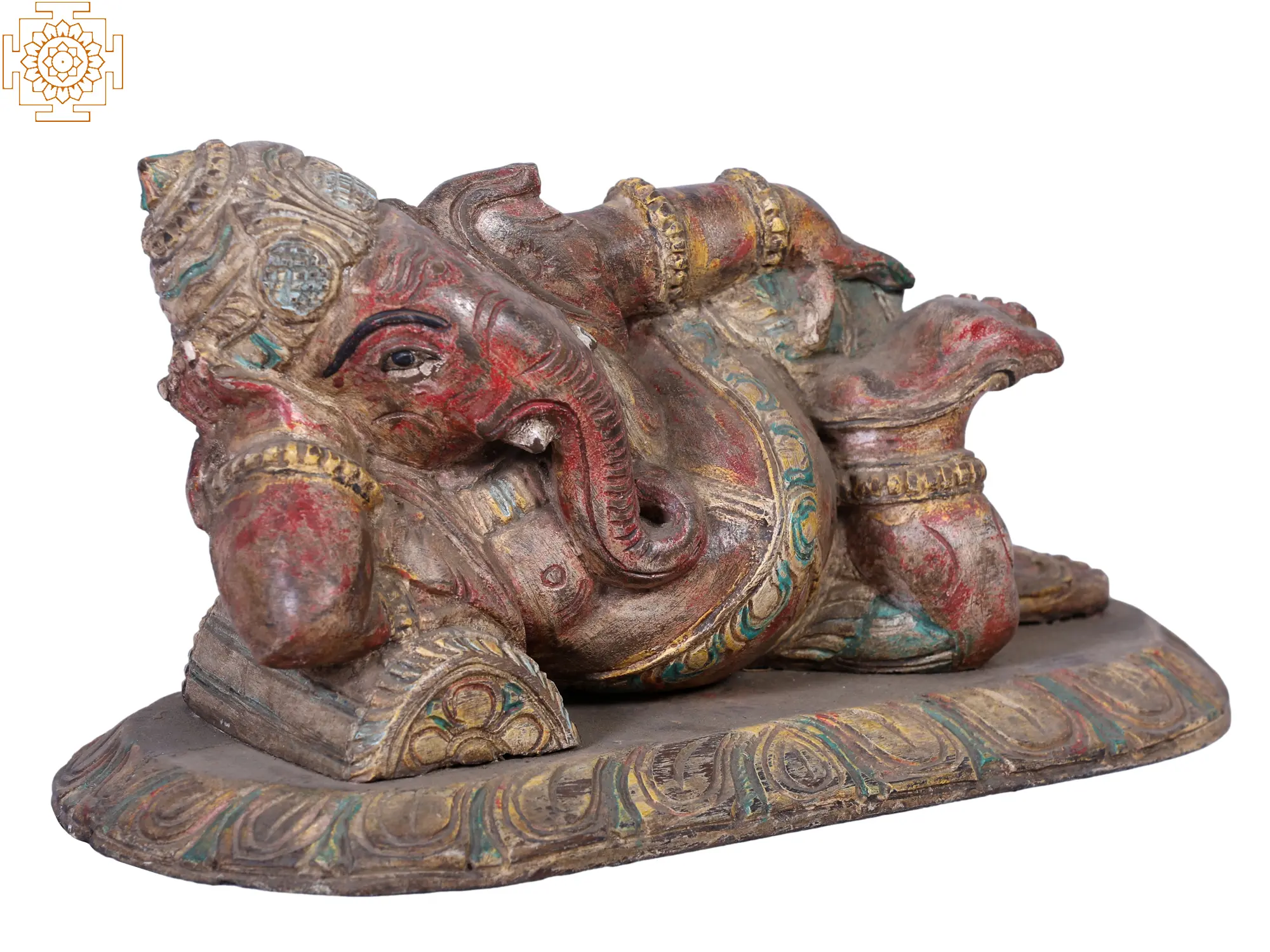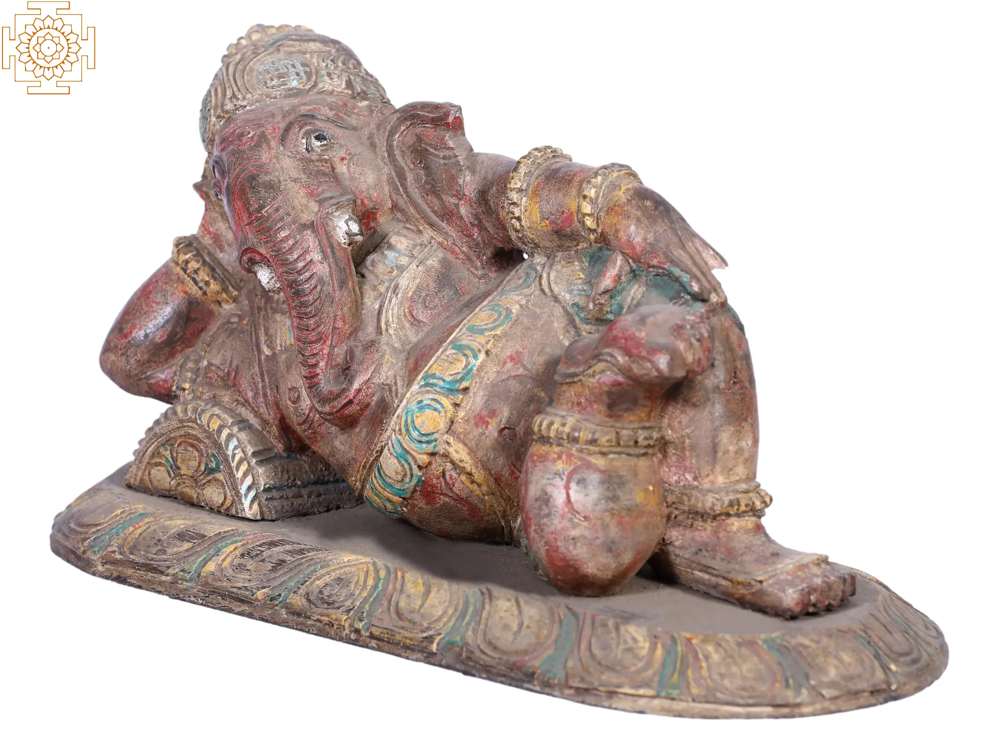 Carved from rich, sacred wood, “Lord Ganesha”, the harbinger of Success, rests in divine serenity upon his intricately detailed Asan. His mighty presence exudes tranquillity, his right hand cradling his thoughtful head, while his left rests gently upon his lap. With a grand trunk that symbolises wisdom and an ample belly representing abundance, Ganesha embodies the essence of life’s dualities. His eternal aura radiates a profound calm, inviting all who gaze upon him to bask in his benevolent presence. In the heart of the wood, he resides as an enchanting masterpiece, a symbol of hope and solace, forever inviting us to embrace life’s blessings with open hearts.