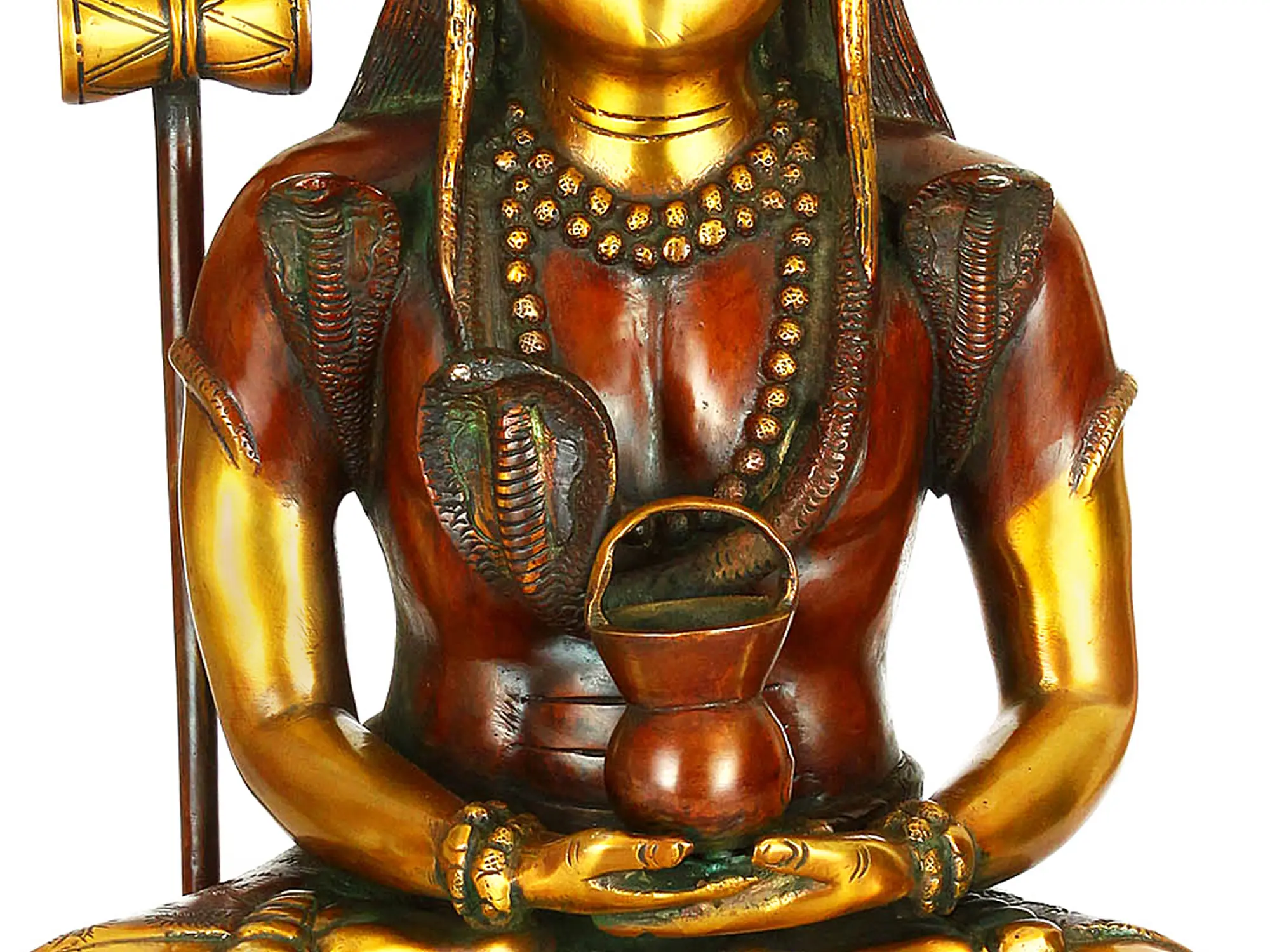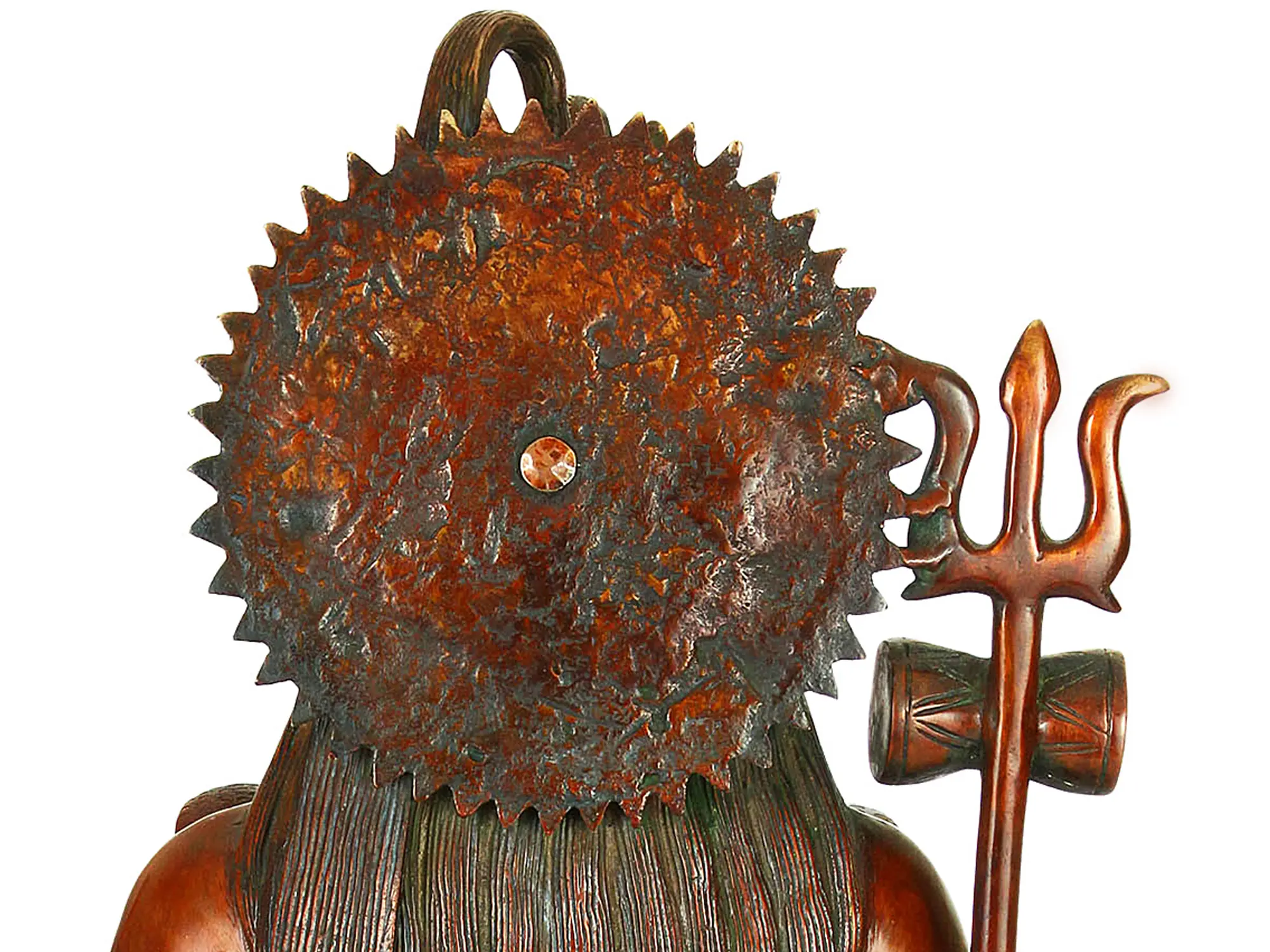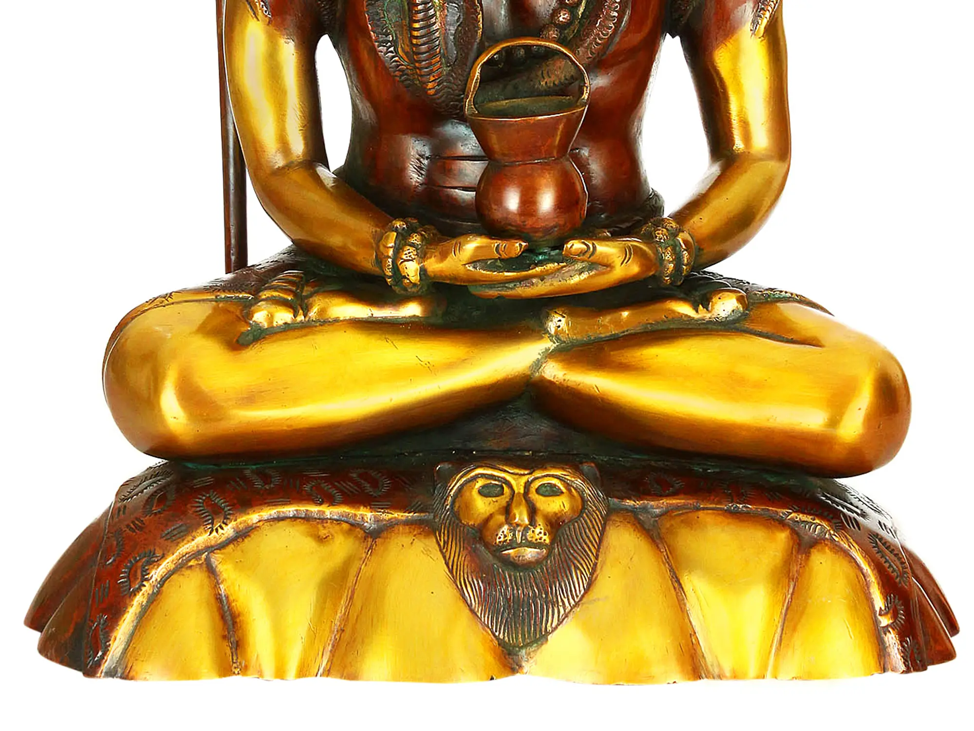 Notice the intricately crafted details that adorn this portrayal of Shiva. Coiled around his neck is Vasuki, the king of serpents, a symbol of kundalini energy and Shiva's control over primal forces. The Rudraksha beads, his sacred necklace, are seeds believed to possess healing properties and protective powers. In his hands, Shiva holds a begging bowl, reminding us of his renunciation of material possessions and his commitment to a life of simplicity and devotion. Behind Shiva, the halo is shaped like sunrays and the face of a lion is depicted in the pedestal. The lion is Shiva's mount, Nandi, and represents strength and courage. To his side stands his Trishul, or trident, is a symbol of Shiva's power to destroy evil and ignorance. It represents the three Gunas, qualities that govern the universe. The Trishul is also accompanied by his Damru, a drum that symbolizes the rhythm of creation and destruction. The combination of these elements contributes to the overall harmony and the powerful spiritual effect.
