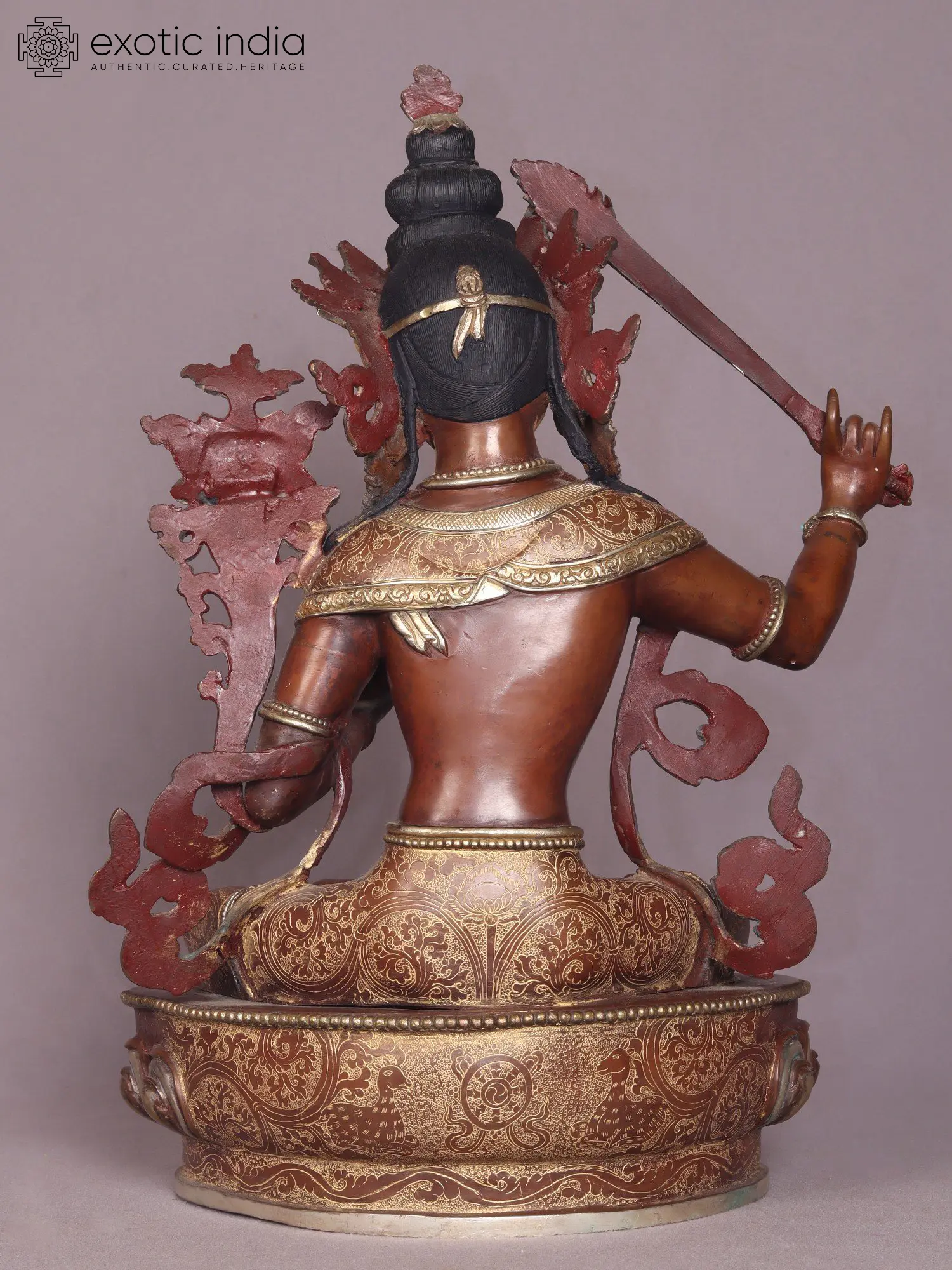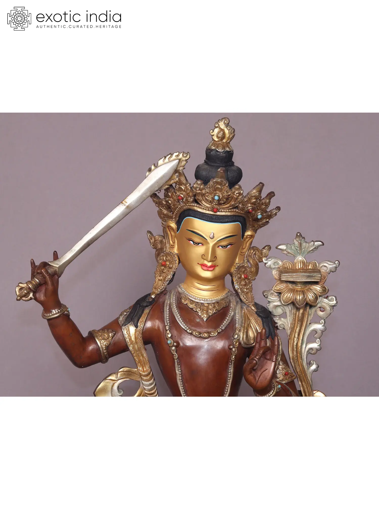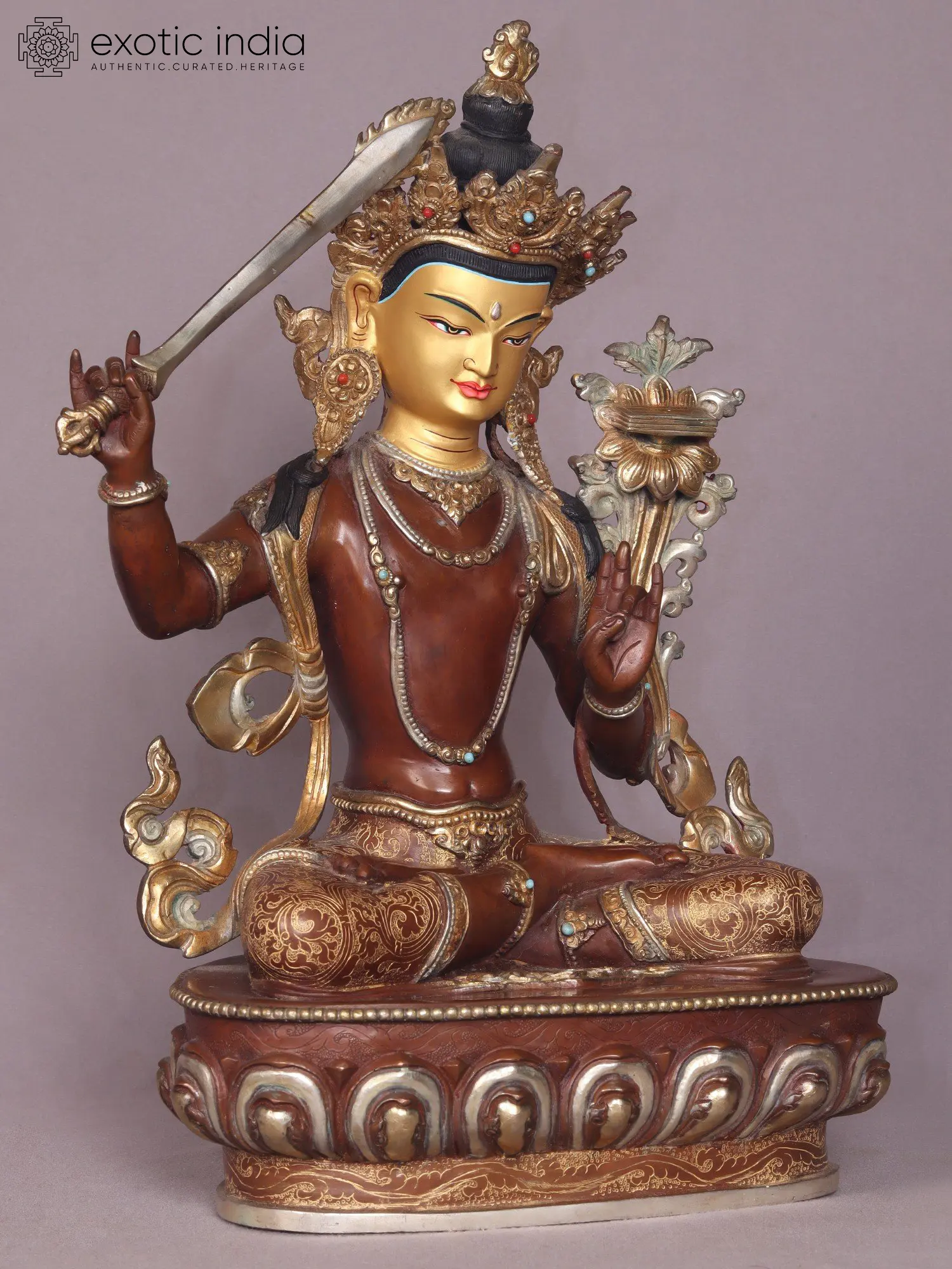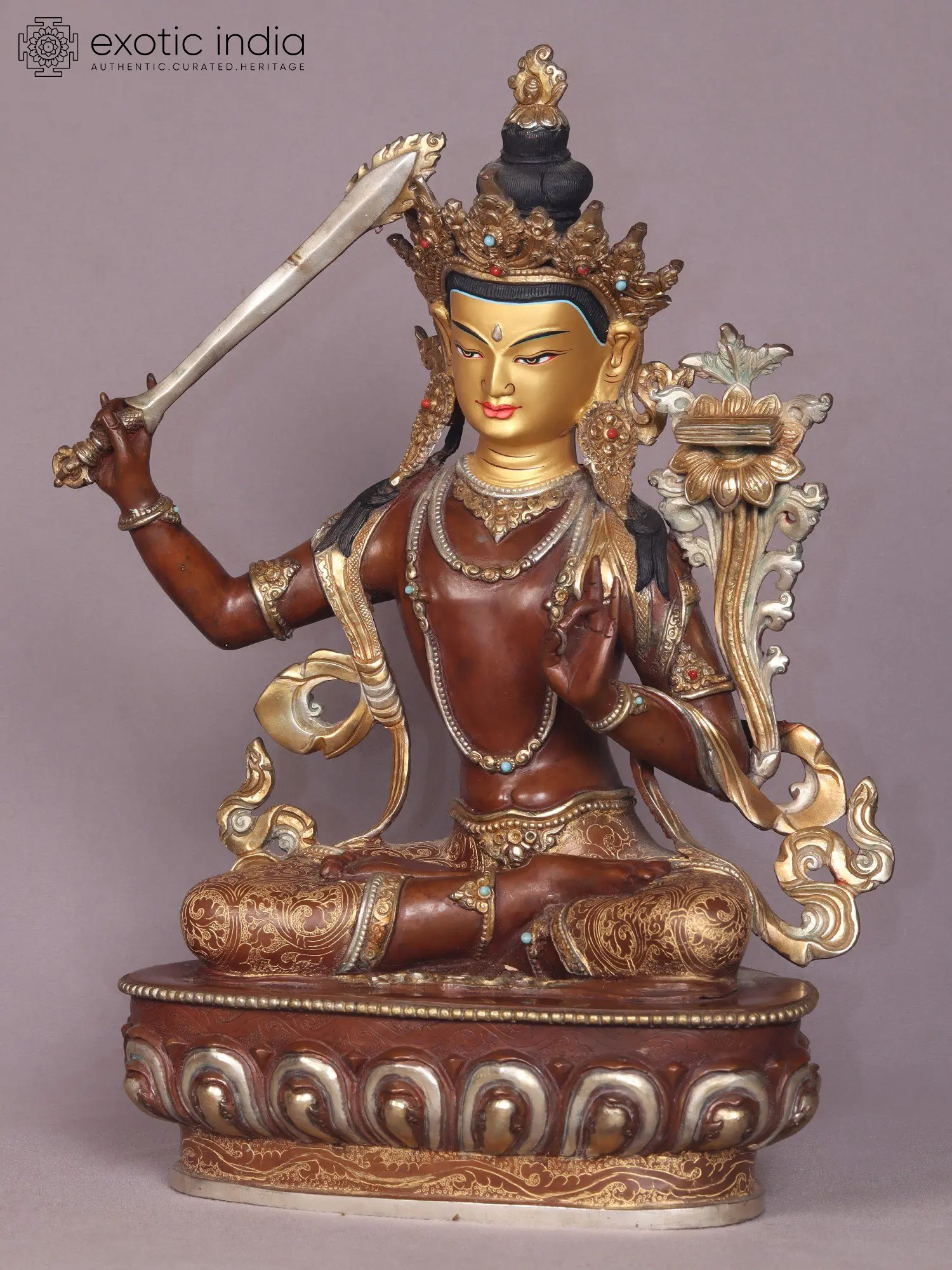 Manjushri, the Bodhisattva of Wisdom, wields a profound symbolism. His right hand firmly grasps the Prajna khadga, also known as the Sword of Wisdom, a potent instrument believed to dispel the obscurity of ignorance with its radiant emanations.