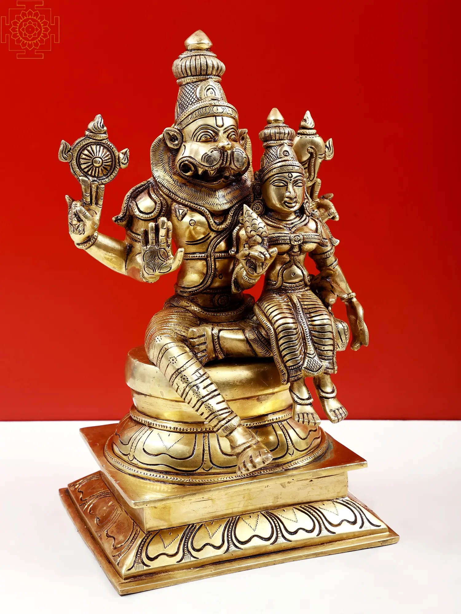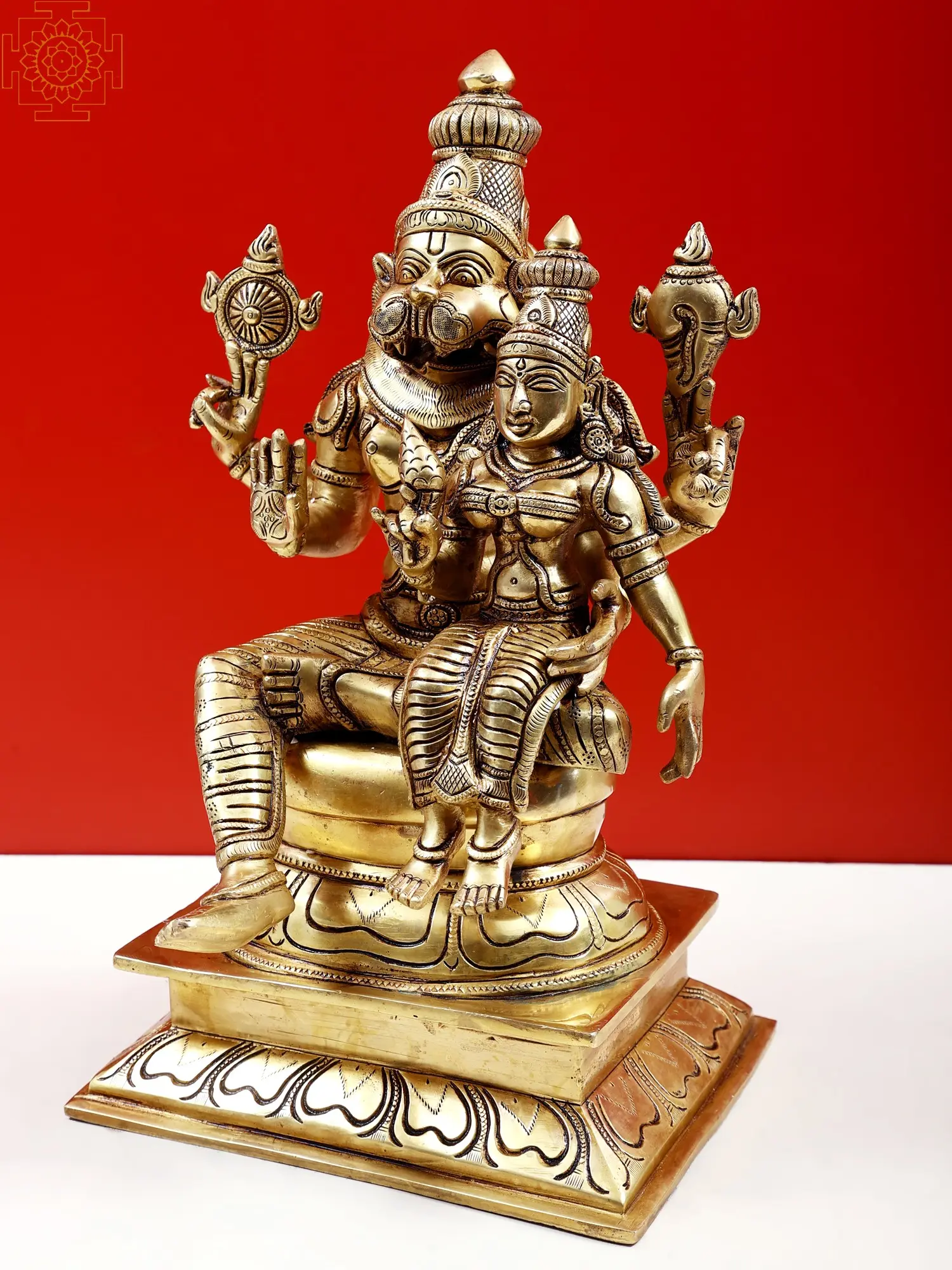The depiction of Narasimha with Lakshmi combines the formidable aspect of Lord Narasimha, an incarnation of Vishnu, with the divine presence of Goddess Lakshmi. Narasimha is depicted with a lion’s head and a human body, symbolizing his unique form of protecting his devotees. Goddess Lakshmi, the consort of Vishnu, adds a sense of grace and prosperity to his portrayal. Together they represent a harmonious balance of strength and benevolence, power and grace. Devotees seek blessings from this divine union for protection, prosperity, and spiritual well-being. The combination of Narasimha’s fierce energy and Lakshmi’s nurturing presence creates a scared representation that reflects the duality of divine force in Hinduism.