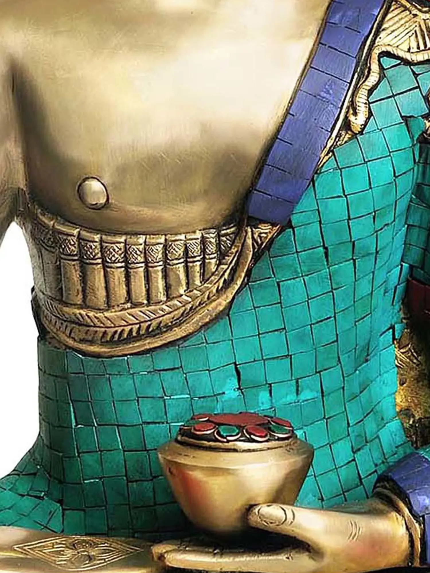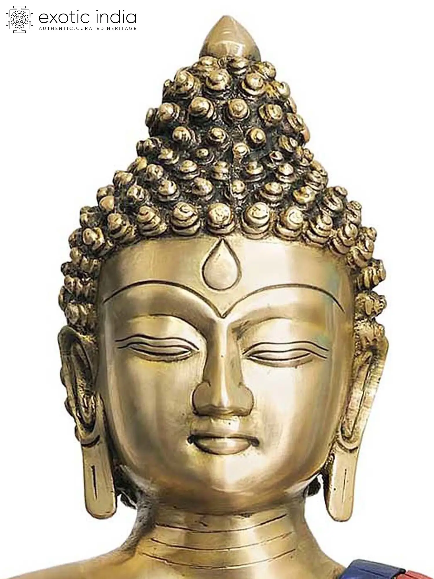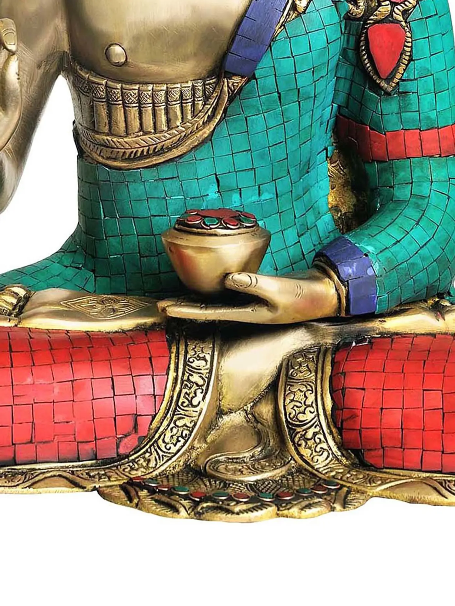 This handcrafted statue is more than just a representation of the Buddha; it is a testament to the rich artistic traditions of India. The brass medium lends a warm, golden hue to the Buddha's form, creating a captivating visual impact. The remarkable inlay work elevates the piece to another level of artistry. Each stone is carefully placed and meticulously fitted, demonstrating the dedication and patience required to create such a masterpiece. The vibrant colors of the inlay, arranged in a geometric pattern, accentuate the folds of the Buddha's robes and the lotus pedestal. These vivid colors create a stunning contrast with the golden brass, resulting in a visually striking and spiritually uplifting work of art.