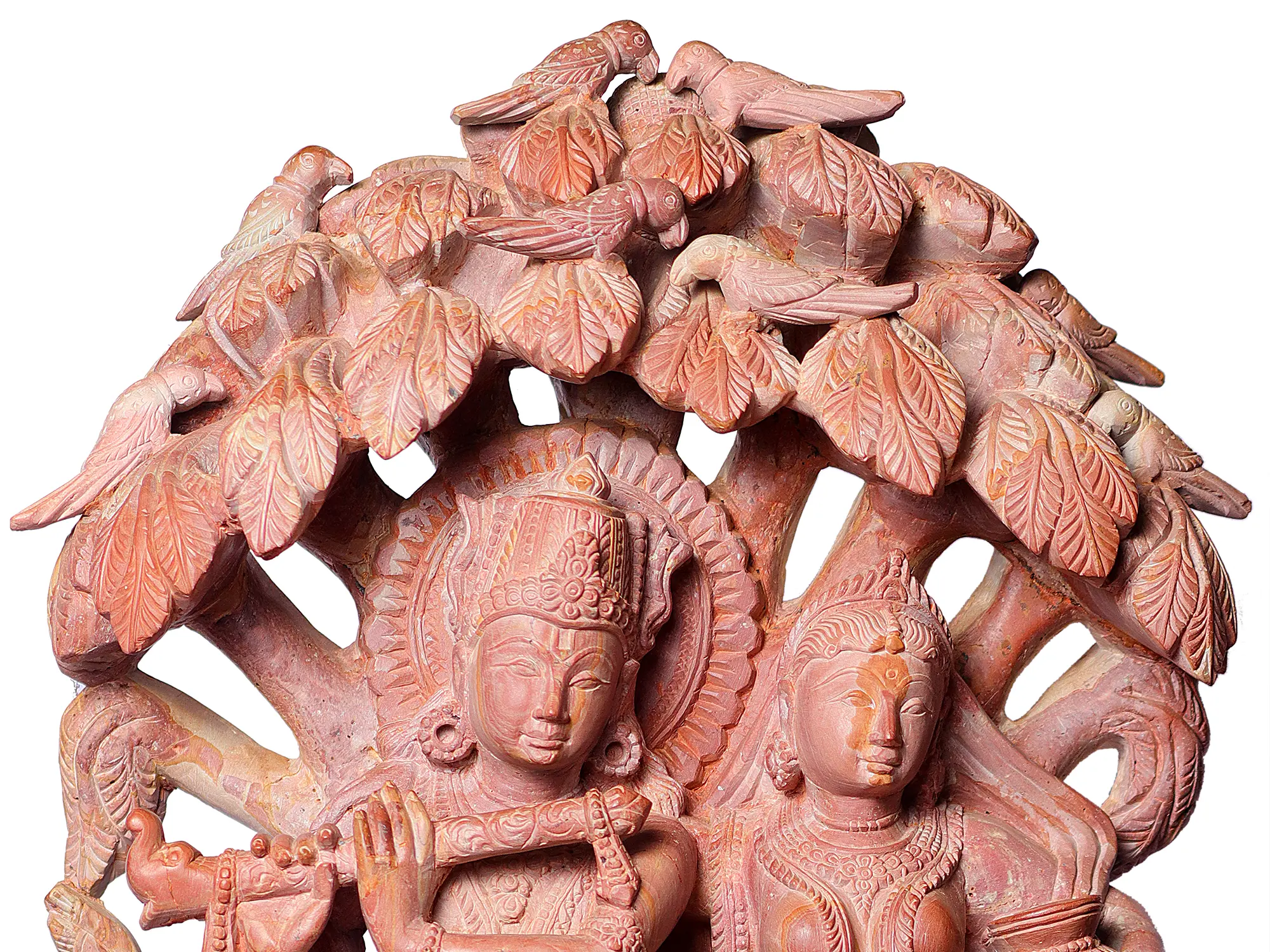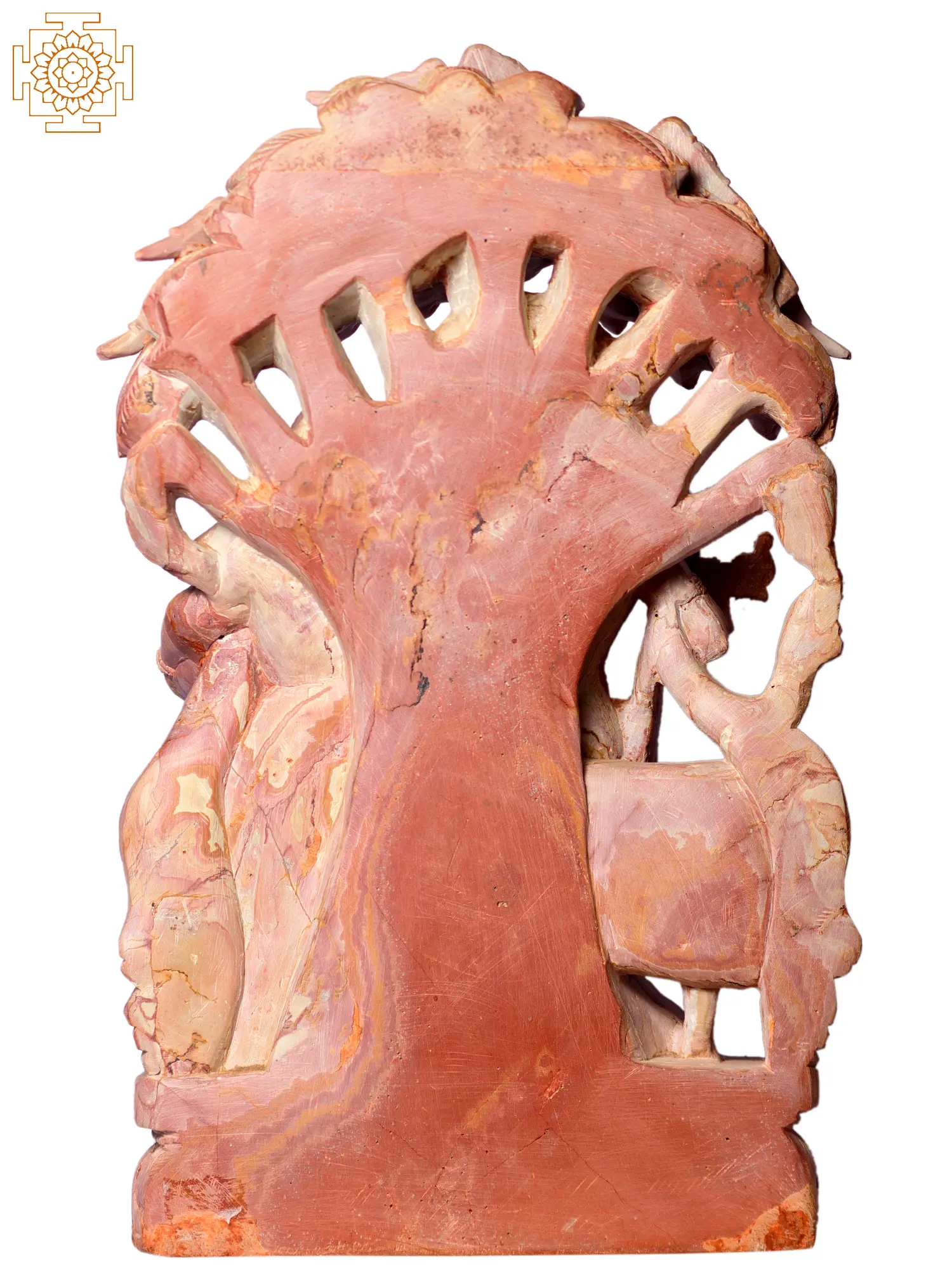 This exquisite stone sculpture captures a moment of profound spiritual love and divine play. At its heart are Radha and Krishna, the eternal lovers of Vrindavan, immortalized in rich, earthy tones. Krishna, the playful divine cowherd, stands with his iconic flute raised to his lips, its melody said to enchant all of creation. Radha, his beloved, stands beside him, her presence a testament to devotion and pure love. Together, they are depicted beneath the protective embrace of a grand tree, its branches adorned with intricately carved leaves and perched birds, a symbol of nature's witnessing of their celestial union.