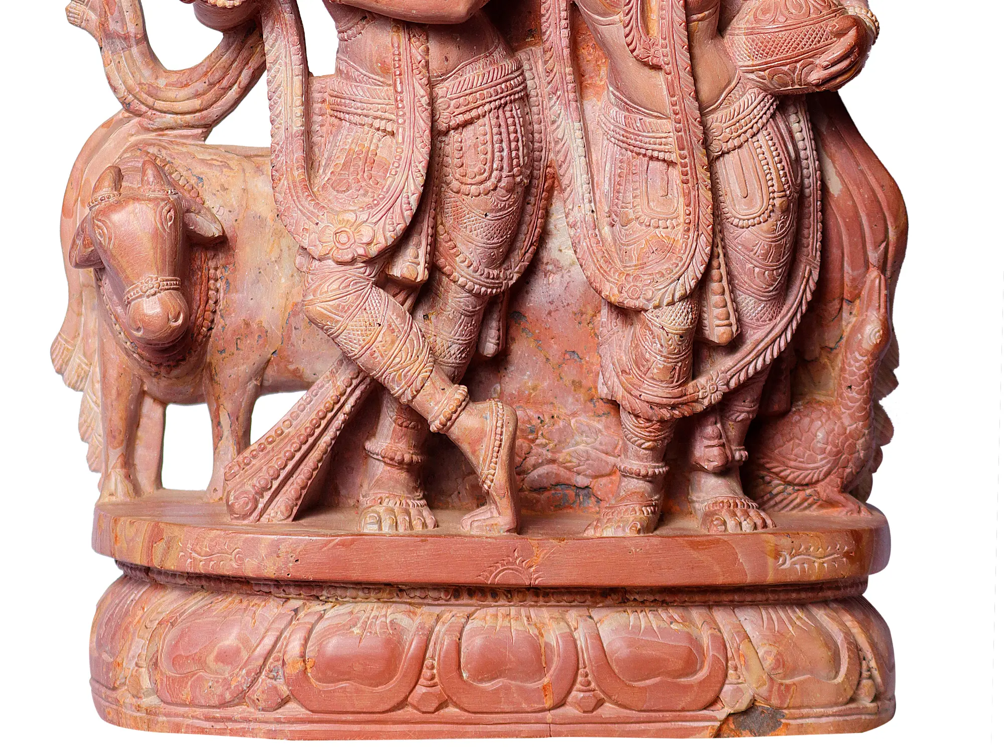 13" Dancing Radha Krishna | Red Stone Statue | Hand Carved