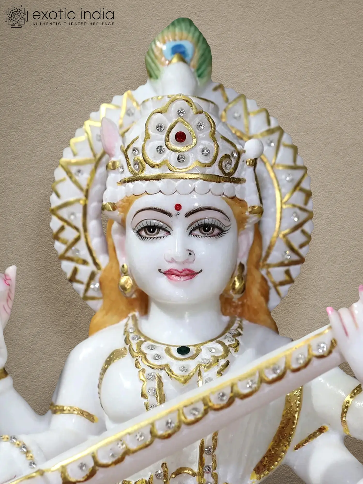 36" Large Standing Goddess Saraswati Playing Veena | White Marble Statue