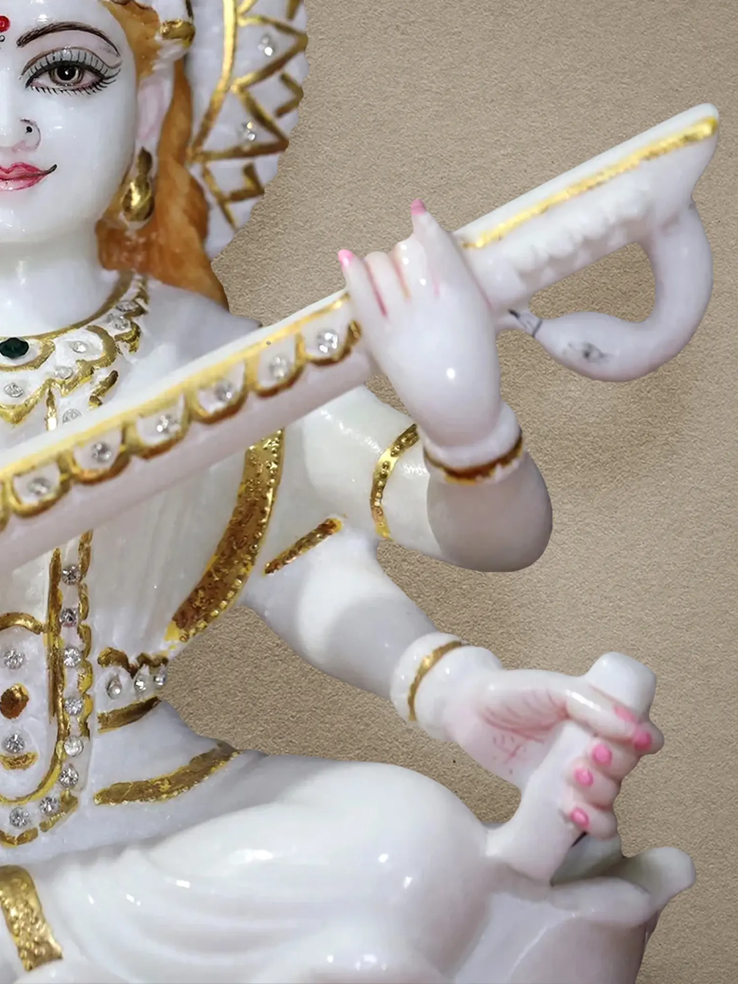9" Statue Of Goddess Saraswati Holding Sitar | Super White Makrana Marble Statue