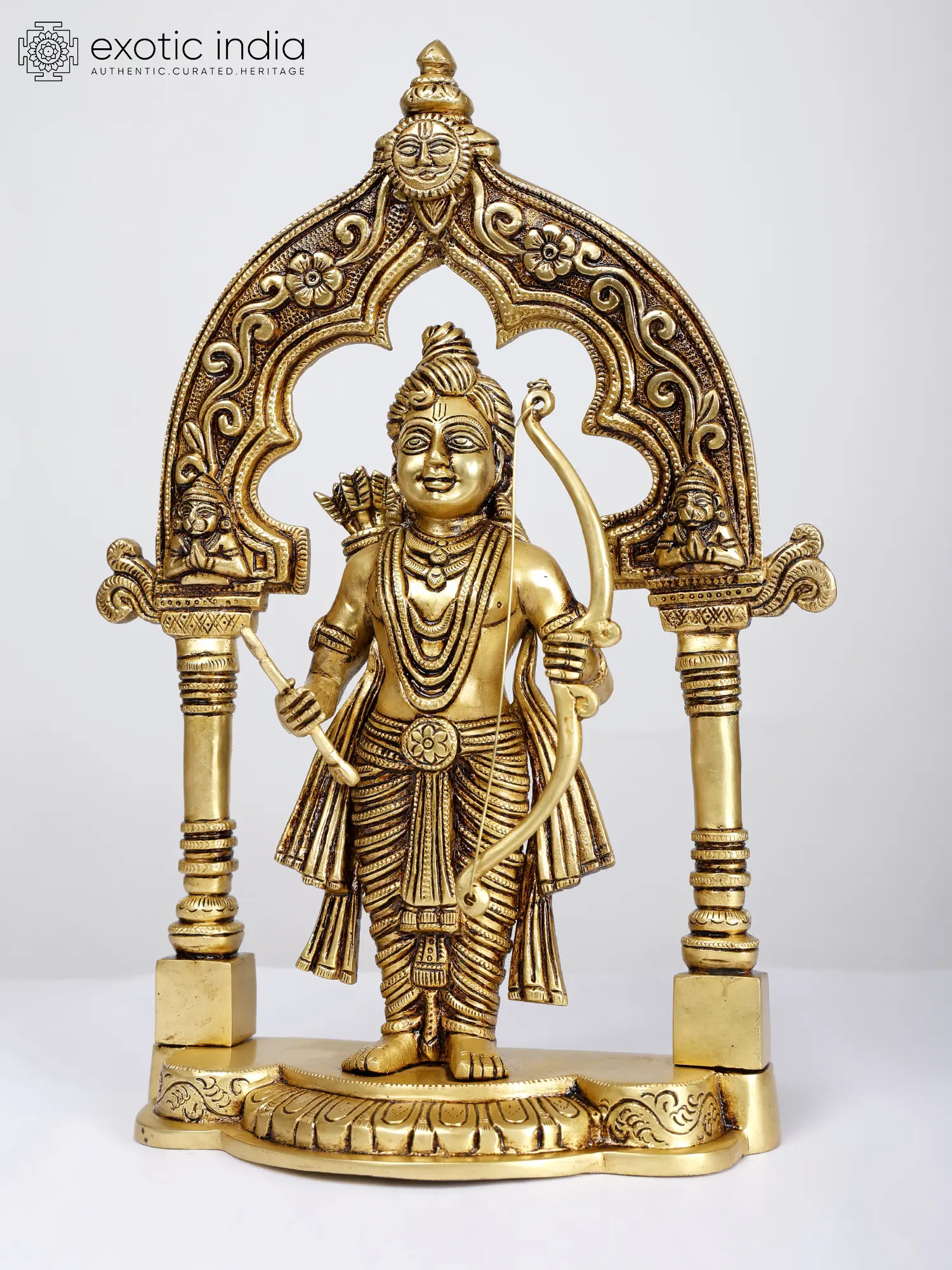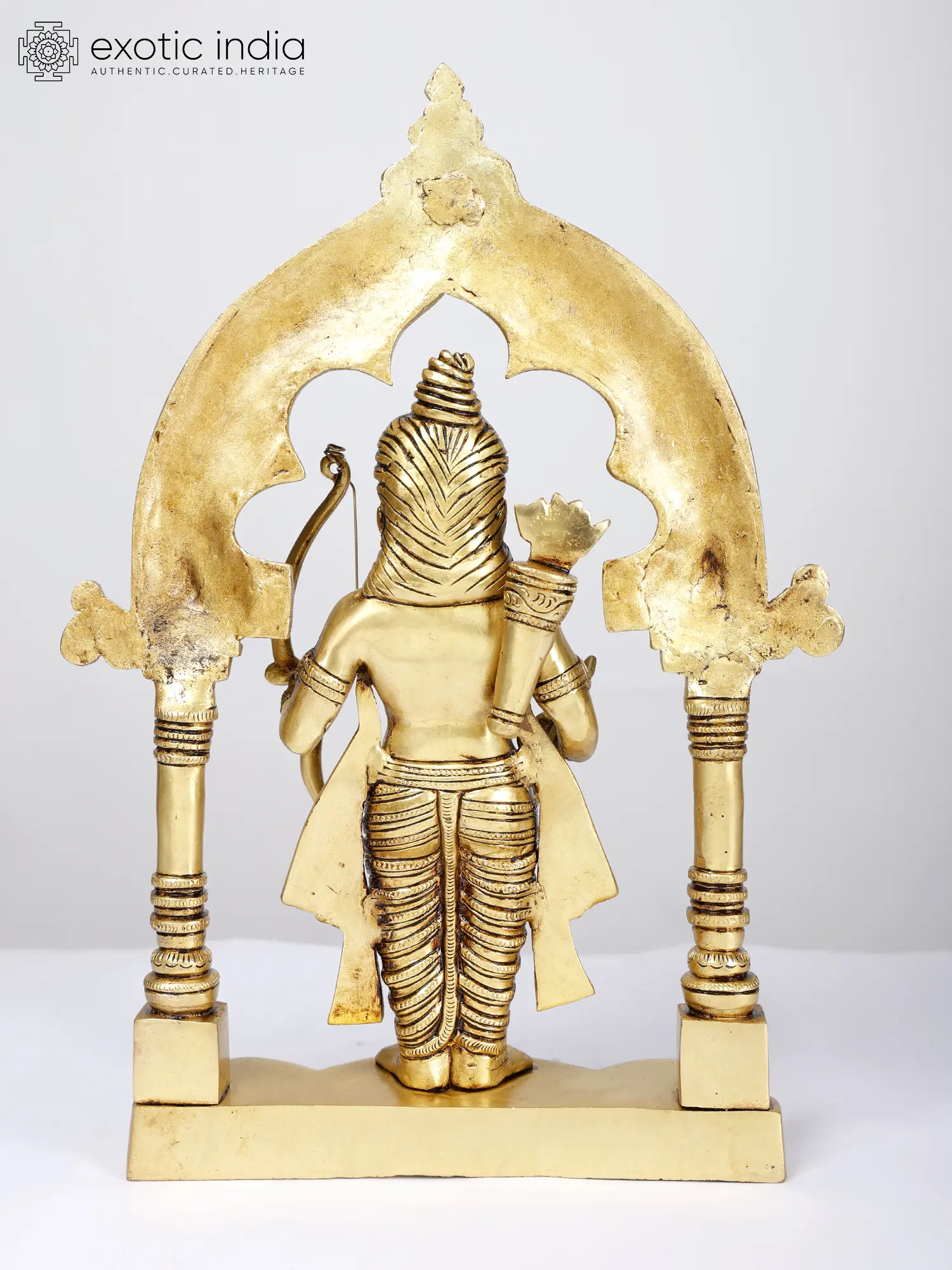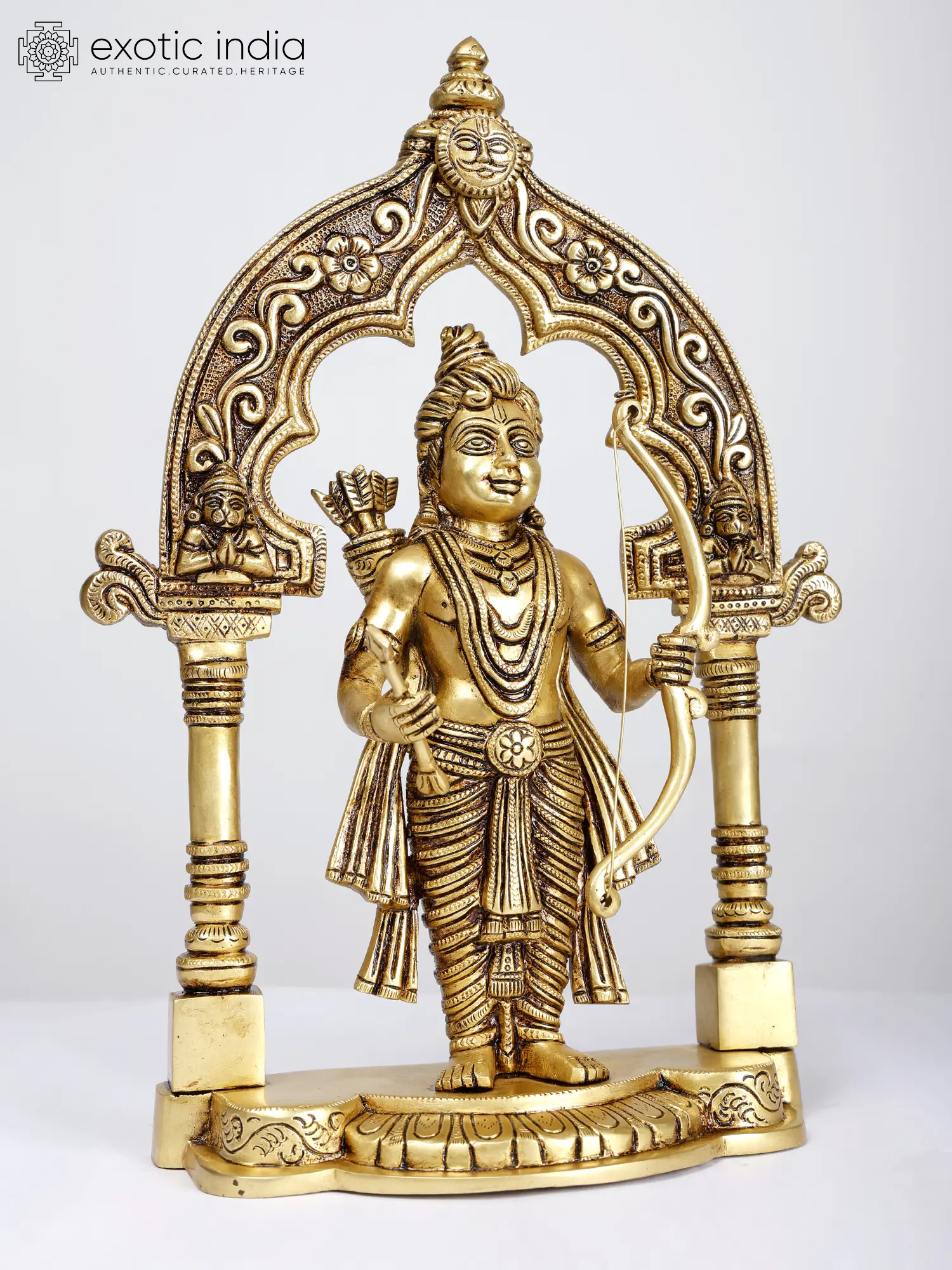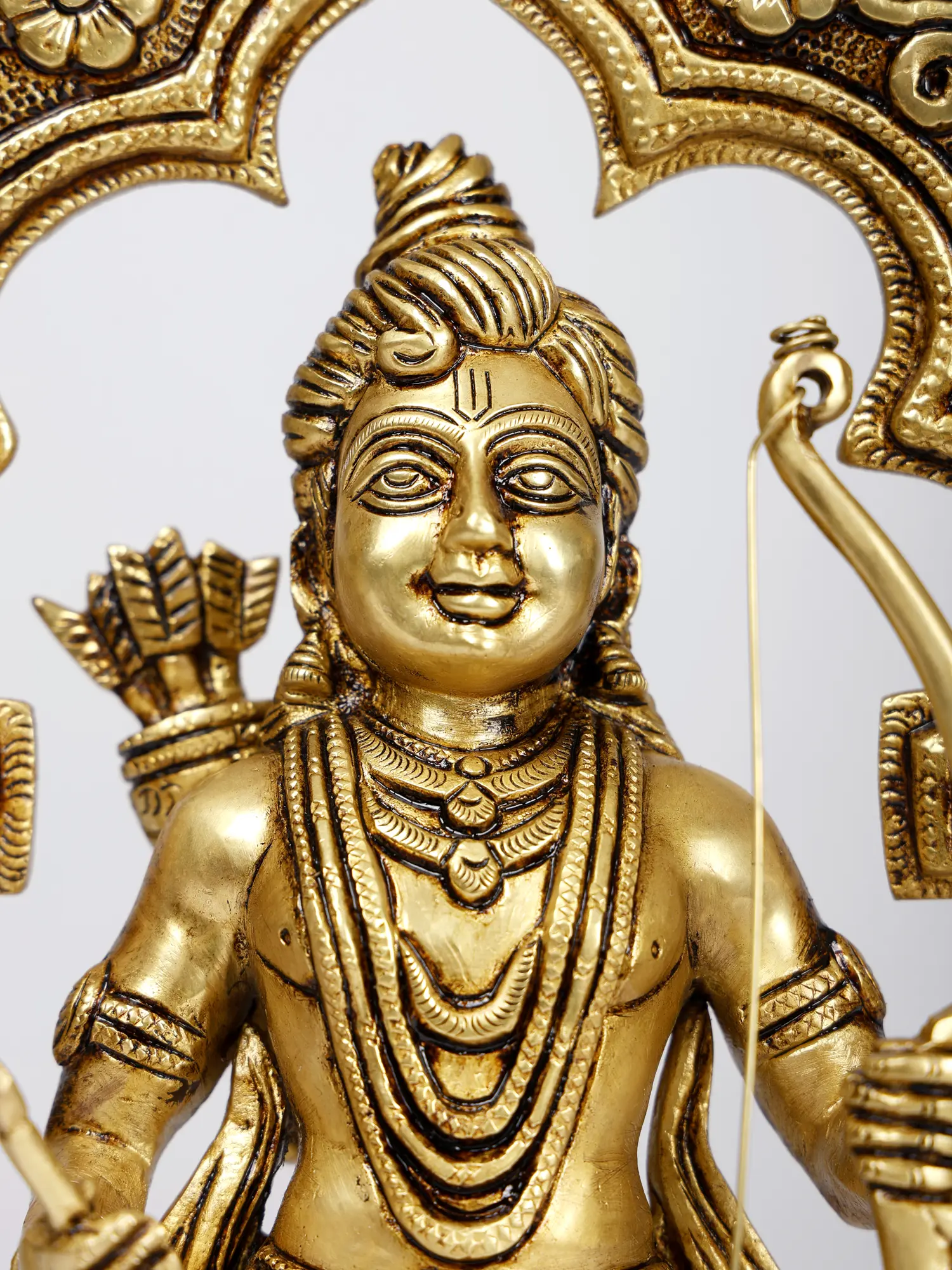 A simplified representation of the Ayodhya Ram Lala statue, this brass icon of Sri Rama captures the innocence of the divine incarnation of Vishnu. On a miniature yet elaborate platform with an aureole decorated by images of Namaskar Anjaneya (Hanuman with hands folded), rising from pillars, Ram Lala stands holding his bow and arrow.
