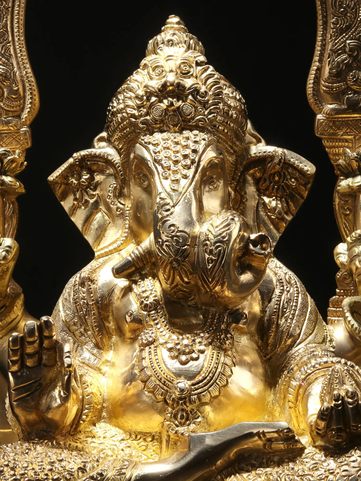 Chaturbhuja Ganesha is regarded as the deity of prosperity. This traditional brass statue of Lord Ganesha sitting on a Kirtimukha throne expresses the heavenly presence of Lord Ganesha as well as the concept of positive progress in life. The key feature of this wonderful statue is a magnificent image of Lord Ganesha in his Chaturbhuja form, depicted with four arms. His two arms blessing and holding a modak each. His two remaining hands hold a noose and a goad, symbolising his ability to control and remove barriers from his followers' pathways. His iconic broken tusk is clutched in one hand, while the other blesses. The throne with a Kirtimukha head in the centre is another wonderful touch that adds to the piece's auspiciousness.
