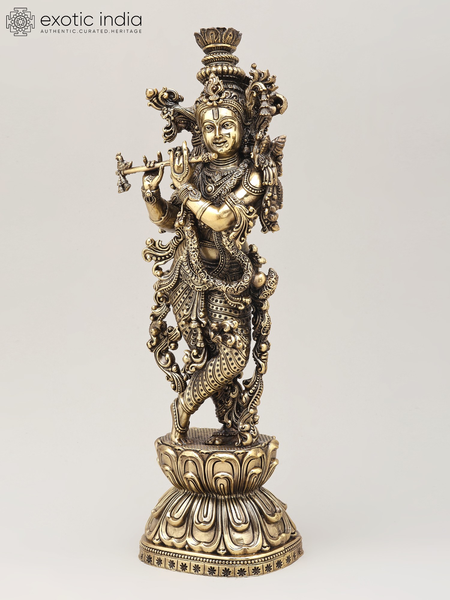 36" Large Krishna Brass Statue Playing Flute | Home Temple Religious Figurine