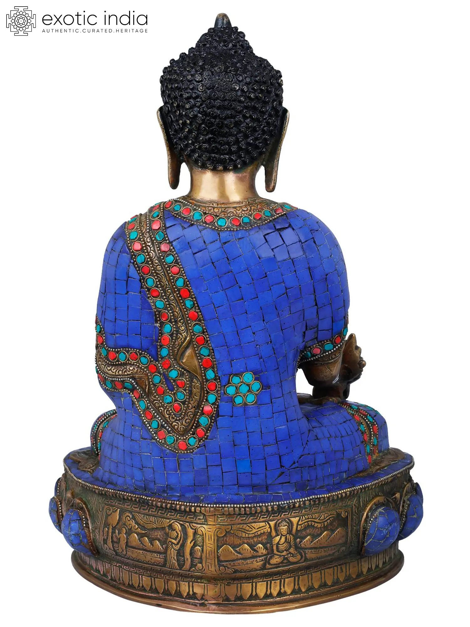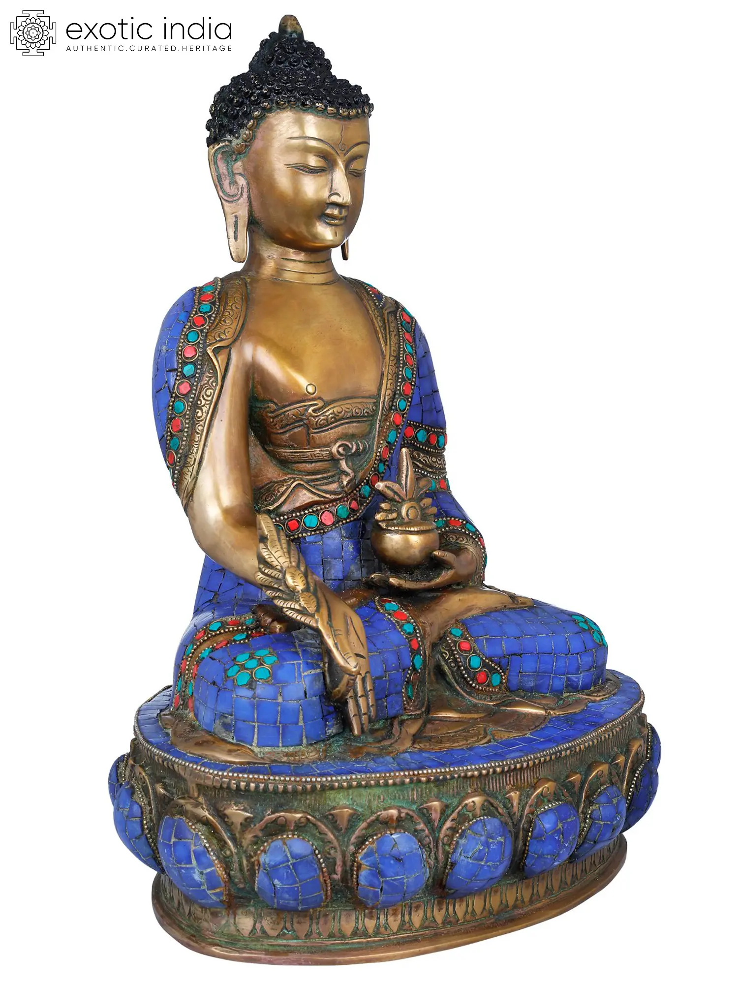 The craftsmanship of this statue is exceptional, a testament to the skill of the artisans in India. The brass has been meticulously worked to capture the delicate nuances of the Buddha's form, from the gentle folds of his monastic robe to the serene expression on his face. The robe itself is a marvel, encrusted with a mosaic of precisely cut lapis lazuli tiles, accented by vibrant red coral and turquoise chips. This detailed application of gemstones not only enhances the visual appeal but also symbolizes the adornments of celestial beings and the richness of spiritual merit. The base of the statue is equally impressive, designed to resemble a lotus pedestal, a universal symbol of spiritual awakening and purity. The lotus, which grows from muddy waters but blooms unstained, represents the Buddha's ability to transcend the defilements of the world and attain enlightenment. The detailed metalwork around the lotus petals further accentuates the grandeur of the piece, creating a harmonious and powerful presence. This statue is more than just an object of art; it is a focal point for meditation and a tangible connection to the teachings of compassion, healing, and wisdom that have guided millions for centuries. It serves as a constant reminder of the potential for inner peace and the alleviation of suffering.