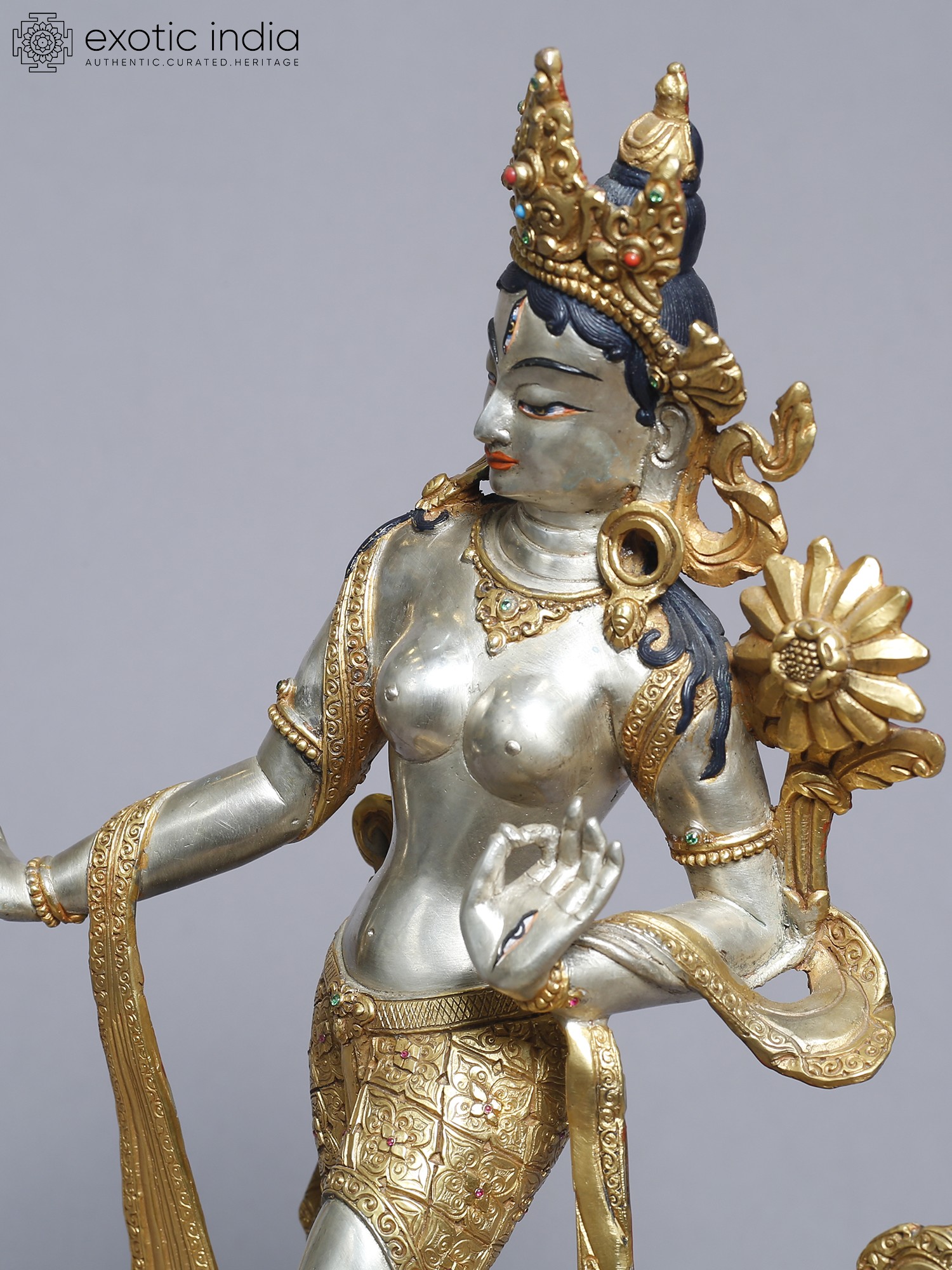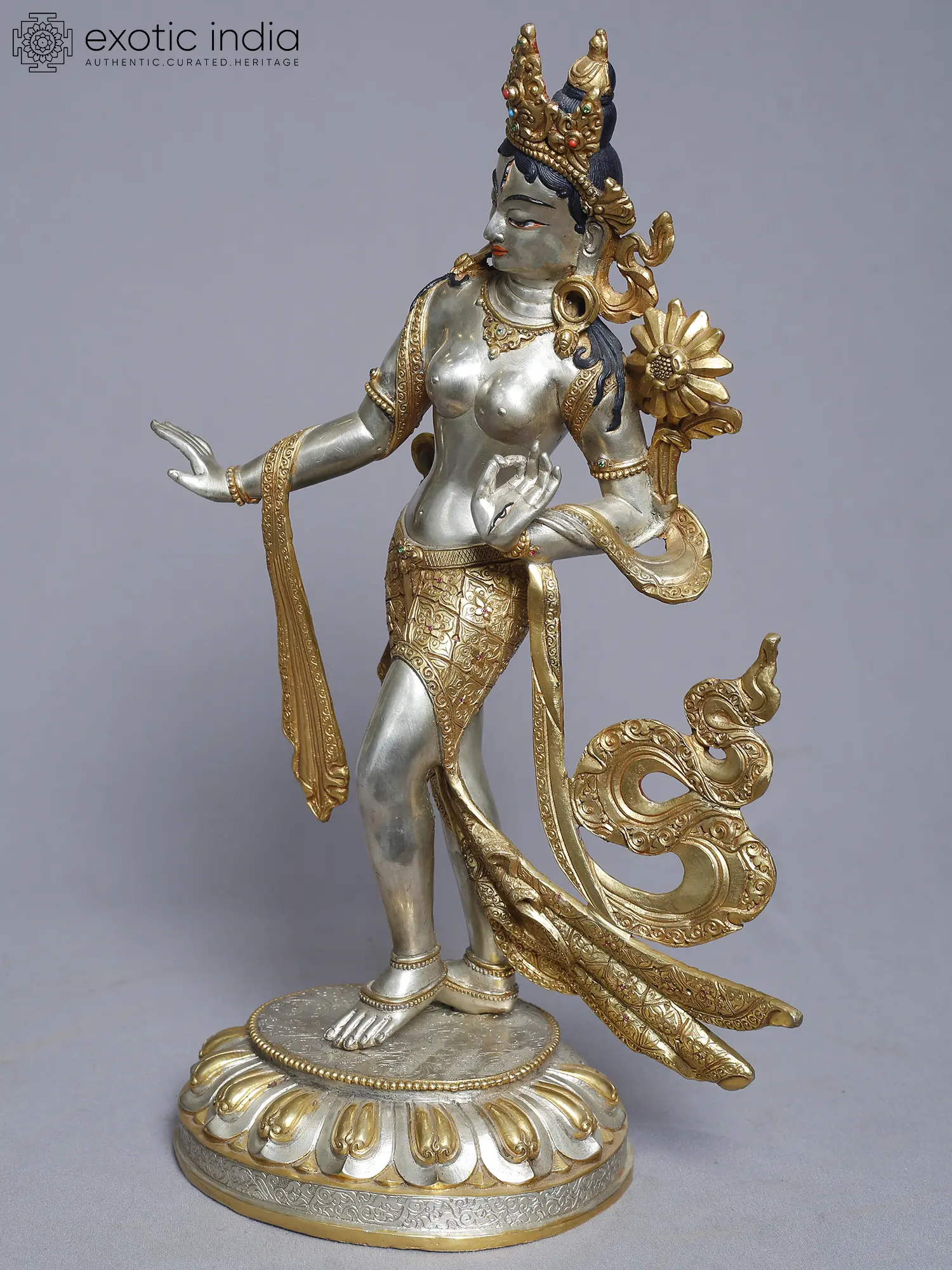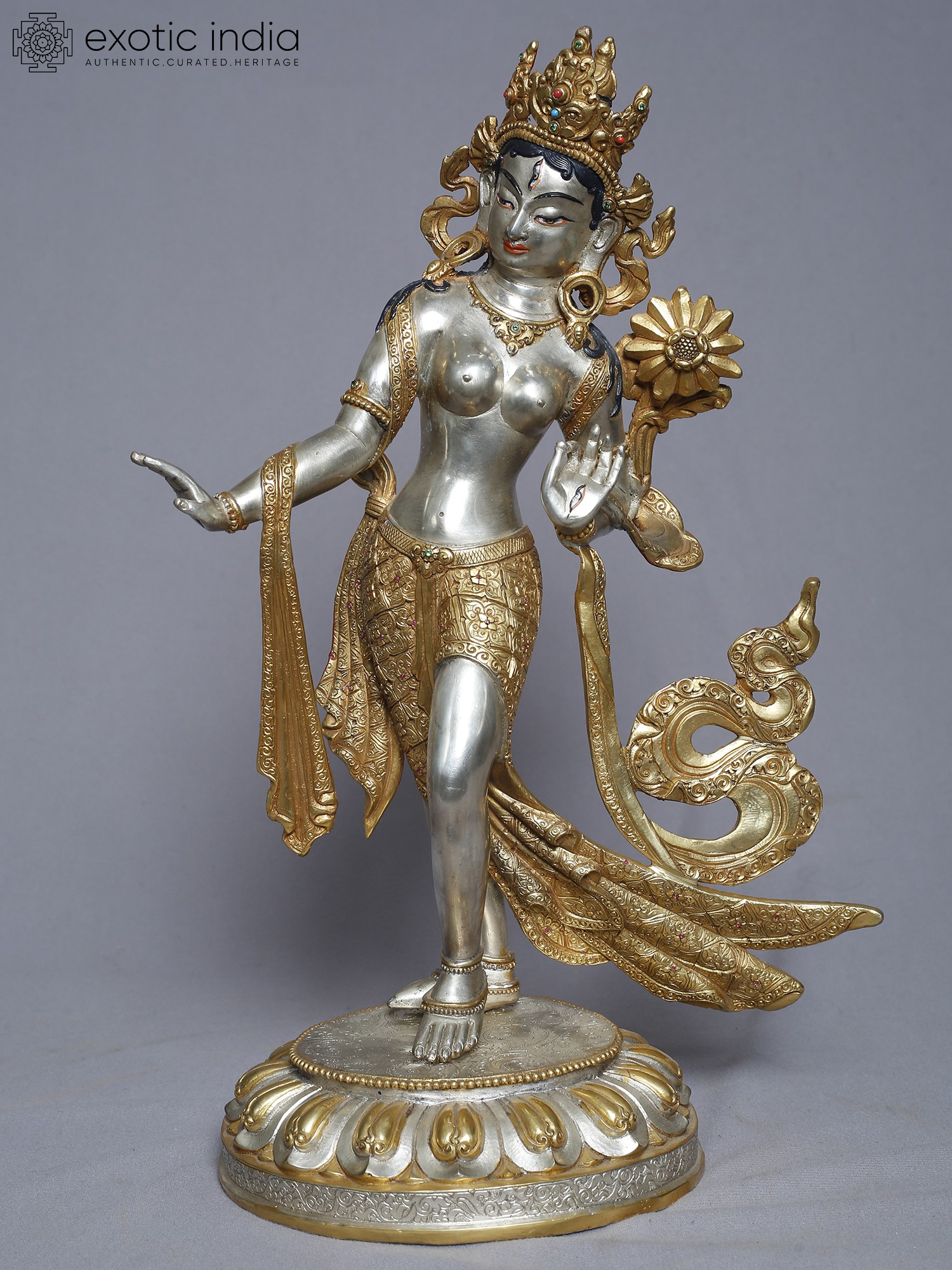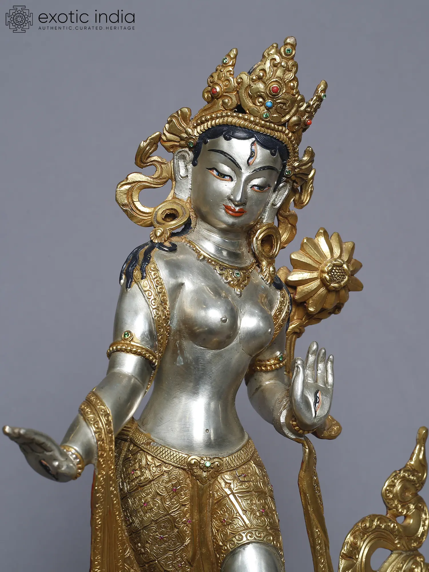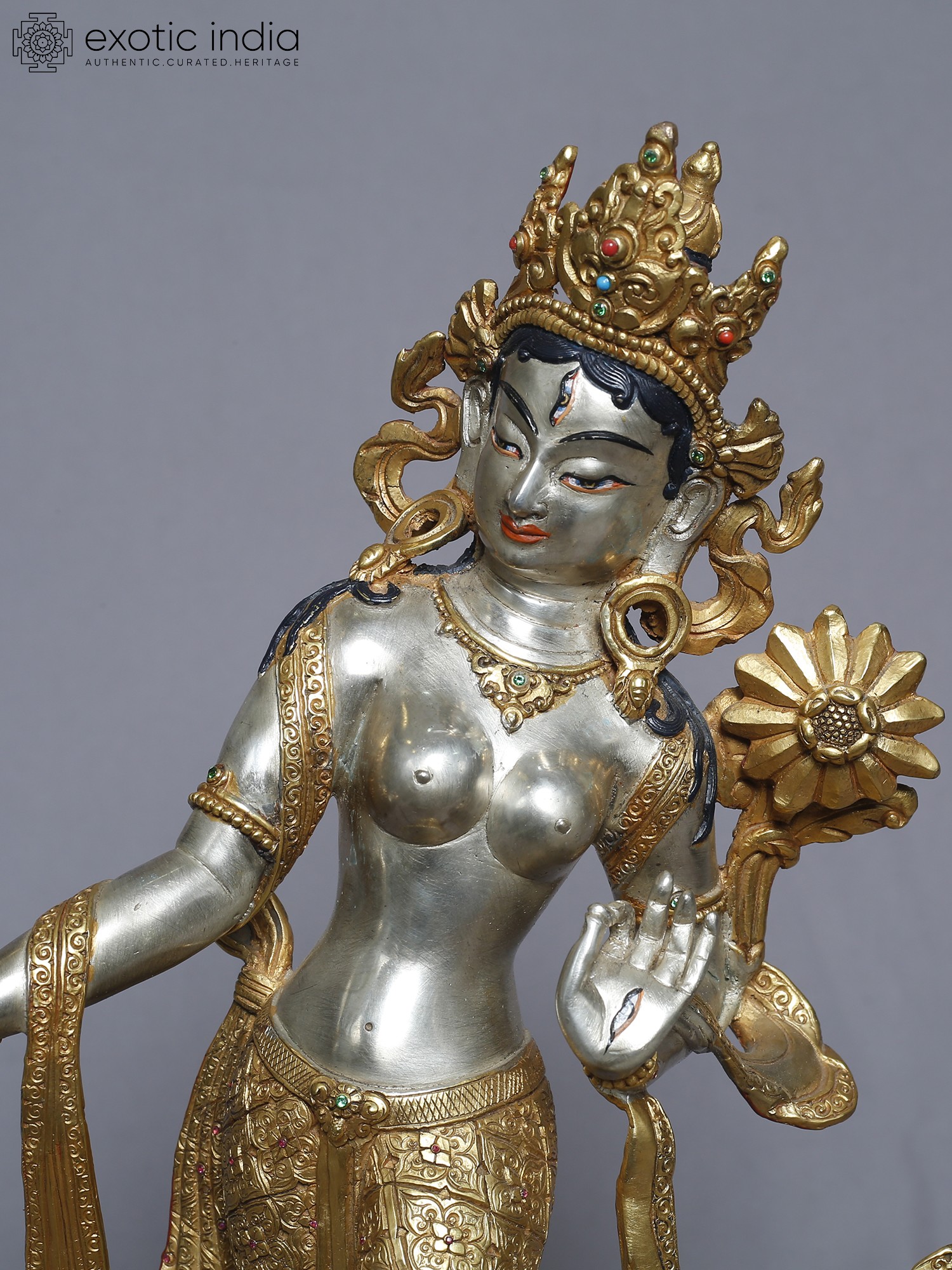 This meticulously crafted statue presents a standing depiction of Tara, a central figure in Tibetan Buddhism revered as the "Mother of Liberation." She embodies compassion, active and readily available to all beings in need. With one foot gracefully extended as if about to step down from her lotus throne, she signifies her readiness to assist those who call upon her. Her hand is often depicted in the gesture of granting wishes, offering protection and fulfilling spiritual aspirations. Tara's story is woven into the rich tapestry of Buddhist lore. She is said to have been born from the tears of Avalokiteśvara, the Bodhisattva of Compassion, who wept at the suffering of the world. From these tears sprang a lotus, and from the lotus emerged Tara, vowing to always work tirelessly for the liberation of all beings. This is why she is often seen holding a lotus flower, a symbol of purity and enlightenment.