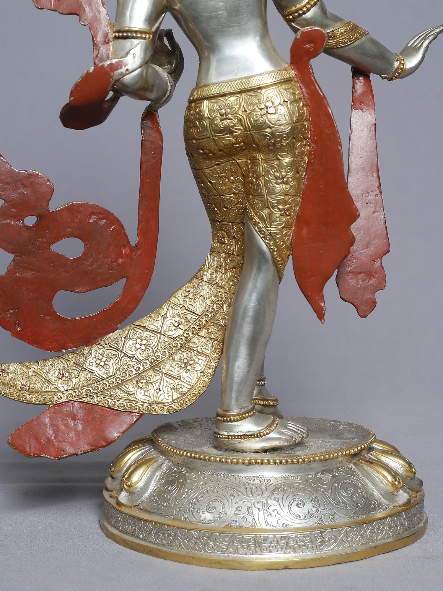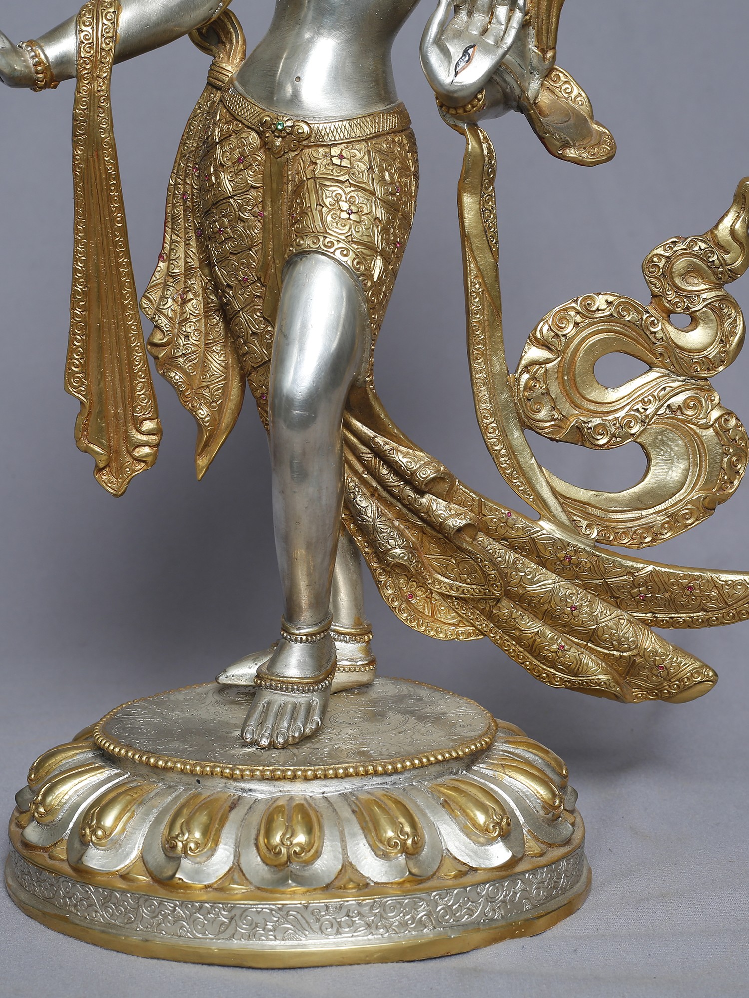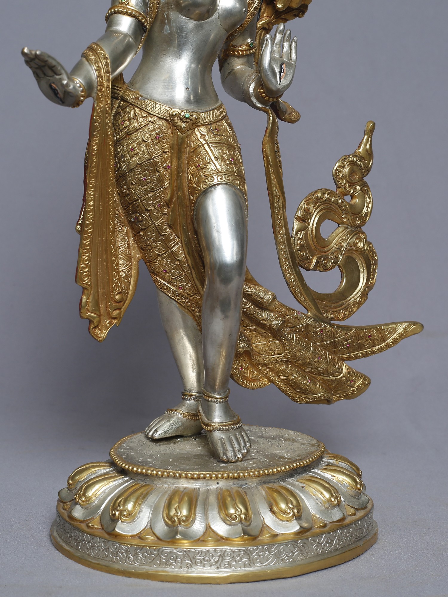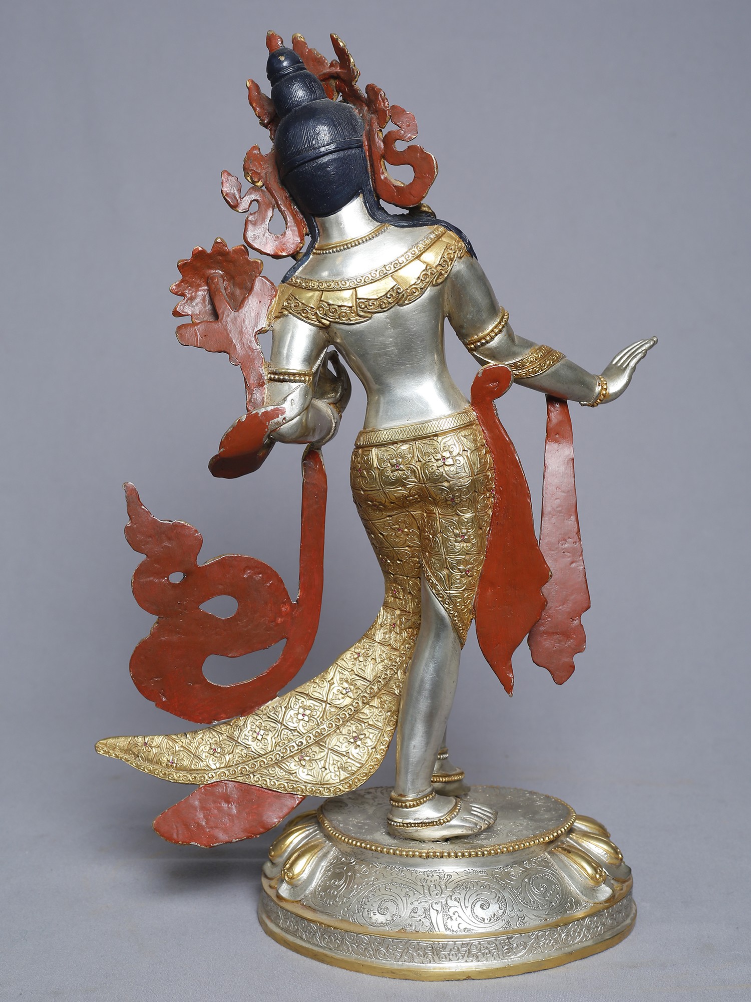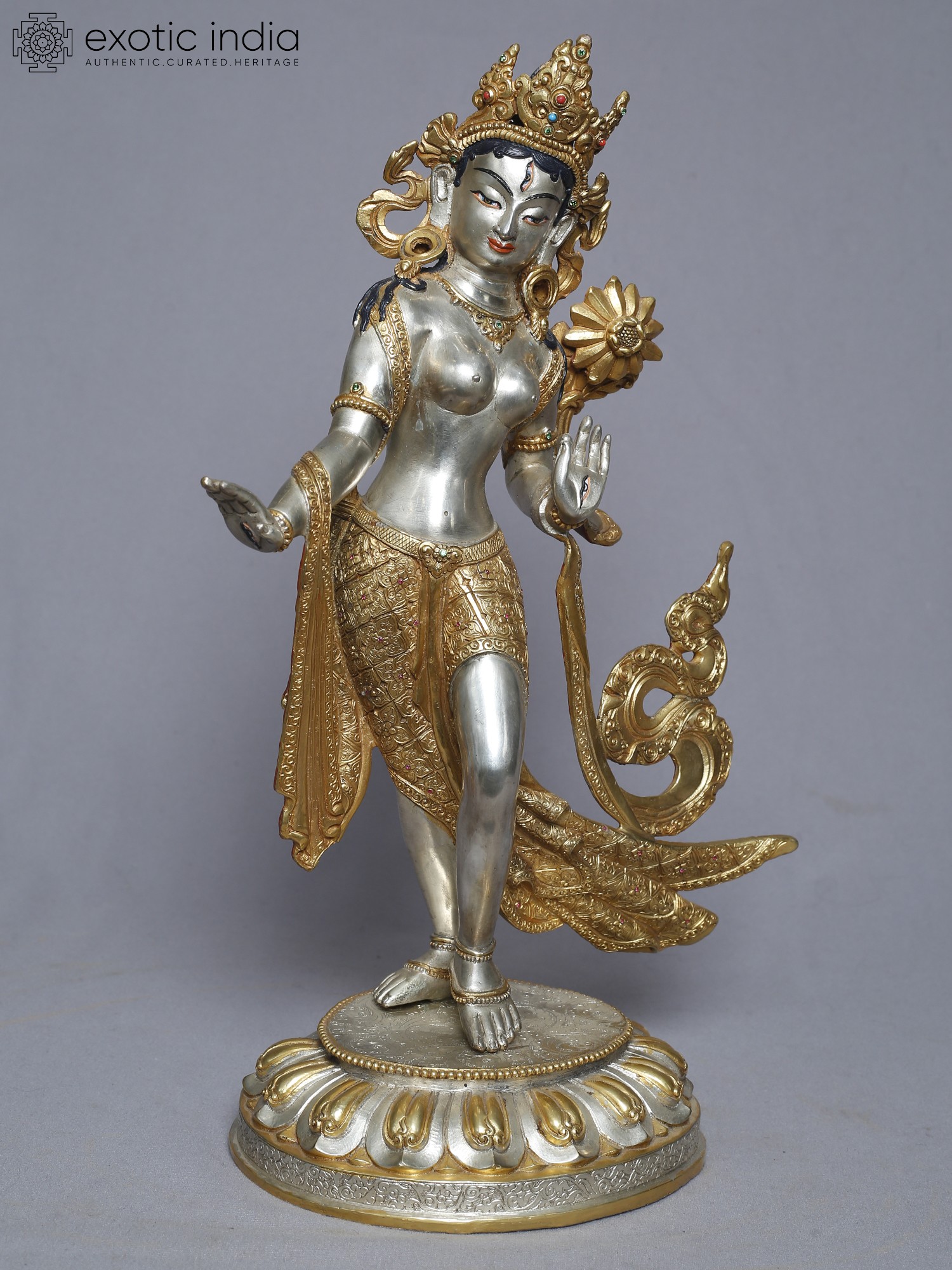 This meticulously crafted statue presents a standing depiction of Tara, a central figure in Tibetan Buddhism revered as the "Mother of Liberation." She embodies compassion, active and readily available to all beings in need. With one foot gracefully extended as if about to step down from her lotus throne, she signifies her readiness to assist those who call upon her. Her hand is often depicted in the gesture of granting wishes, offering protection and fulfilling spiritual aspirations. Tara's story is woven into the rich tapestry of Buddhist lore. She is said to have been born from the tears of Avalokiteśvara, the Bodhisattva of Compassion, who wept at the suffering of the world. From these tears sprang a lotus, and from the lotus emerged Tara, vowing to always work tirelessly for the liberation of all beings. This is why she is often seen holding a lotus flower, a symbol of purity and enlightenment.