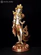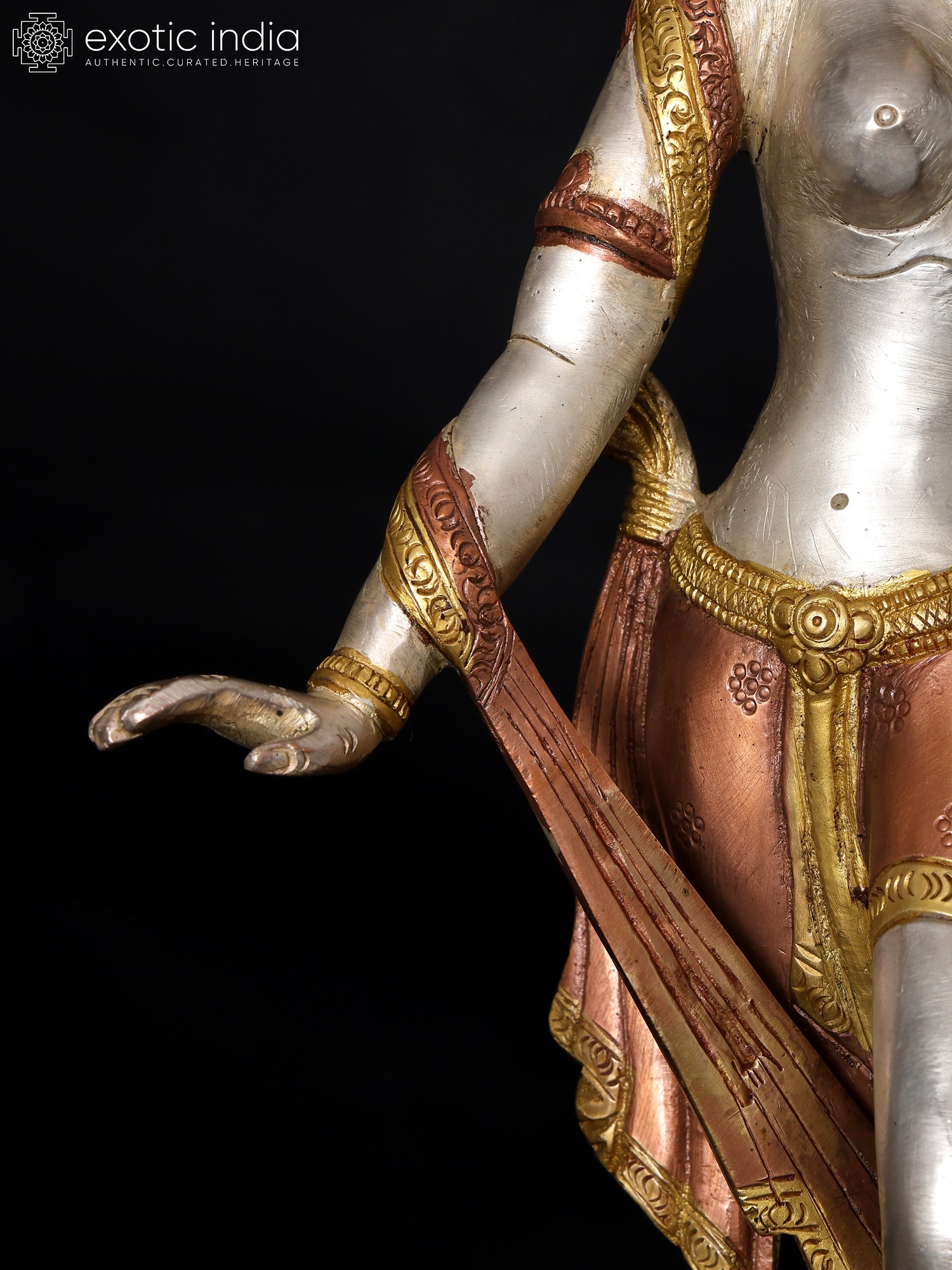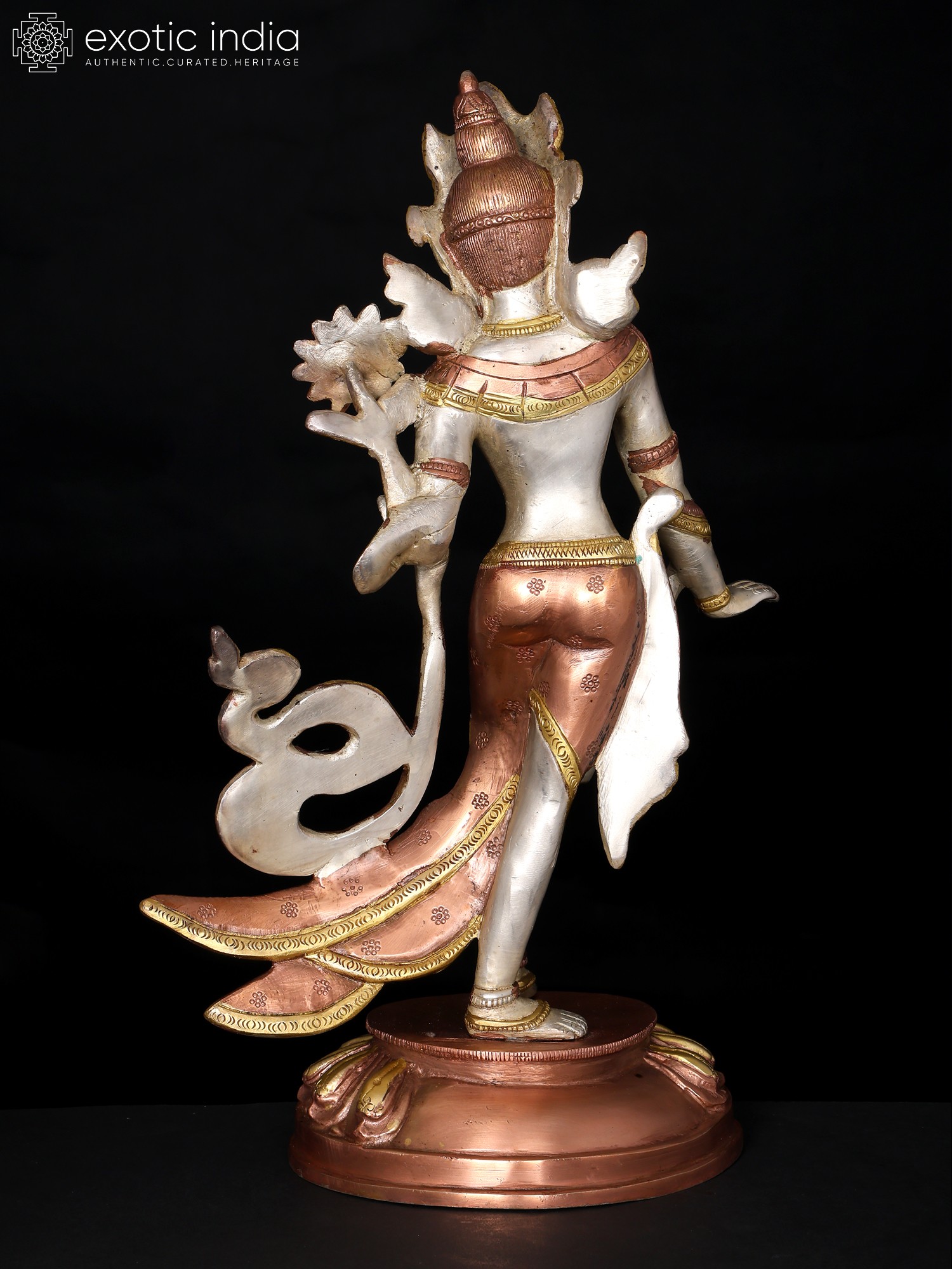 This exquisite brass statue captures the divine essence of Tara, a revered figure in Tibetan Buddhism, embodying compassion, protection, and swift action. Crafted with meticulous detail by skilled artisans in India, this impressive 15-inch depiction of the goddess is a testament to centuries of artistic tradition and spiritual devotion. The contrasting silver and copper hues of the brass, polished to a radiant sheen, highlight the intricate sculpting, bringing forth a sense of ethereal beauty and powerful grace. Tara, often referred to as the "Mother of Liberation," is a Bodhisattva who chose to manifest as a female Buddha to effectively aid beings in their spiritual journey. Legends tell of her arising from a tear shed by Avalokiteshvara, the Bodhisattva of Compassion, as he wept for the suffering of the world. Her immediate appearance as a fully enlightened being underscores her active and responsive nature. She is the embodiment of enlightened activity, appearing in various forms to protect devotees from fear and to guide them towards enlightenment. This particular standing depiction, with her gentle gaze and outstretched hand, is suggestive of her benevolent presence, ever ready to offer solace and assistance. ––––––––––––––––––