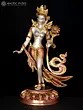 The artist has masterfully rendered Tara with flowing robes, adorned with delicate patterns that suggest the richness of spiritual adornment. Her regal crown and ornate jewelry speak to her divine status, while the lotus flower she holds in her left hand is a potent symbol of purity, enlightenment, and spiritual awakening, blooming beautifully from the muddy waters of worldly existence. The right hand is held in a gesture of offering or blessing, extending her boundless grace to all sentient beings. The swirling drapery that trails from her form and the stylized cloud-like motifs at her base evoke a sense of movement and cosmic energy, suggesting her omnipresence and her ability to traverse realms effortlessly. The robust brass medium provides a tangible permanence to this spiritual representation, making it a lasting object of veneration and a focal point for meditation. ––––––––––––––––––