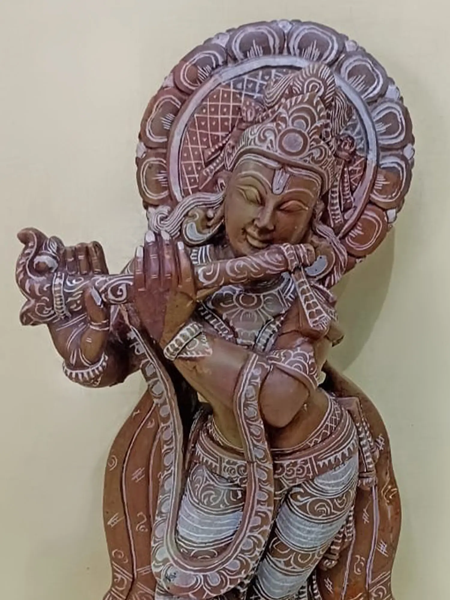 In this enchanting representation, Lord Krishna stands in the Tribhanga pose, a classic stance in Indian art where the body gracefully bends in three places - the head, torso, and leg. This pose creates a gentle S-shaped curve, radiating a sense of fluidity and elegance. The Tribhanga position emphasizes Krishna's divine beauty and eternal charm, captivating the hearts of devotees. Carved with precision and reverence, this Statue positions itself as a timeless symbol of Krishna's enchanting presence and eternal allure.