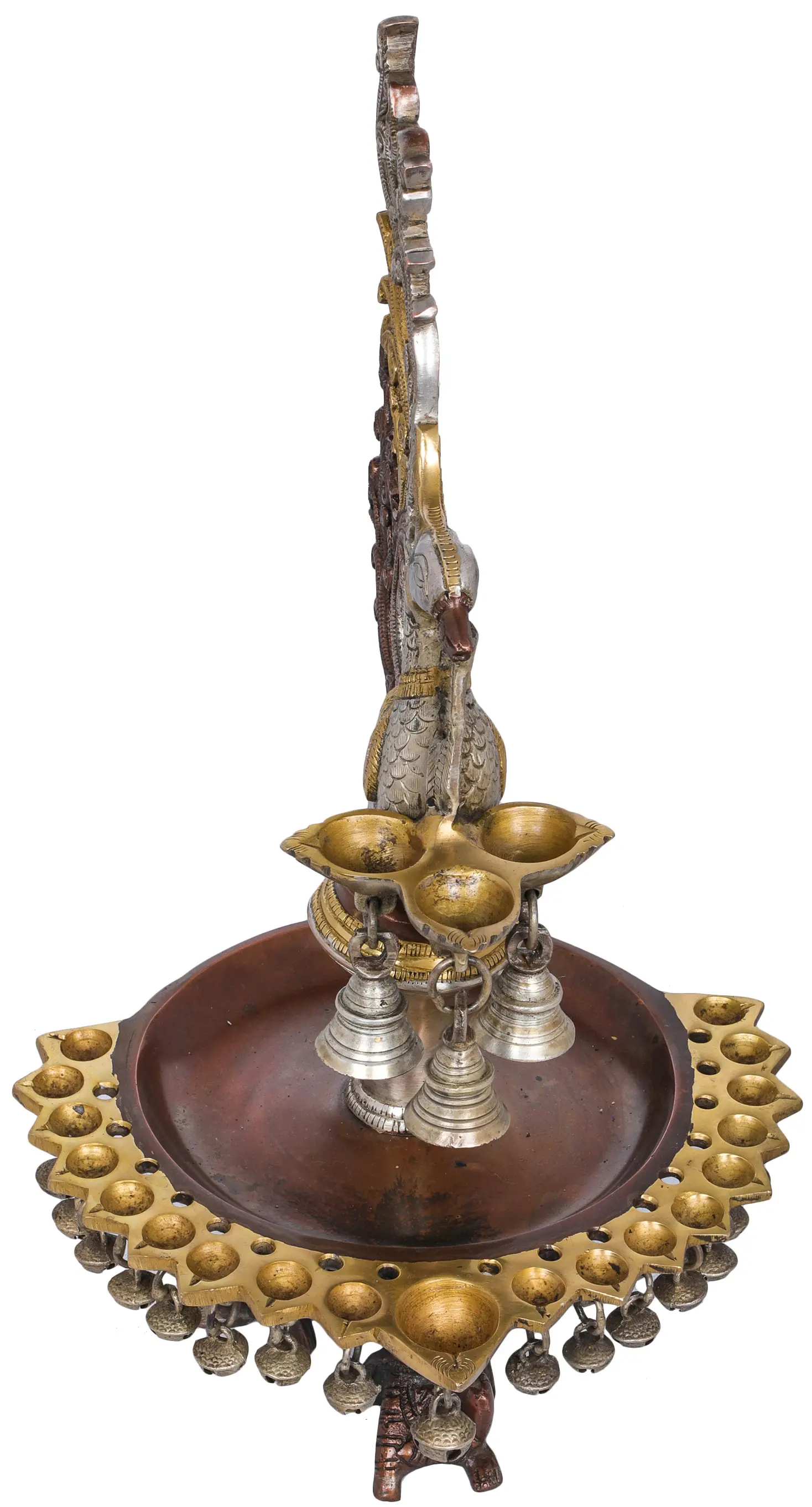 As the Skanda Purana bestows the title of the most beautiful light to the light of a lamp, the lamp throughout history has been one of the most beautiful pieces of art. They have been decorated with sacred images and ornamentations like metal bells, vines, and Jaal work. This brass lamp with an exquisite peacock motif and twenty-two wicks is one of those creations that is made by the infusion of art, craft, and philosophy. The twenty-two wicks celebrate the beautiful image of twinkling stars, the peacock motif is associated with prosperity and the lamp as a whole is a symbol of wisdom and intellectual growth. The brown, silver, and gold hues are placed intelligently to increase the beauty of the lamp and make it a perfect choice for art lovers.