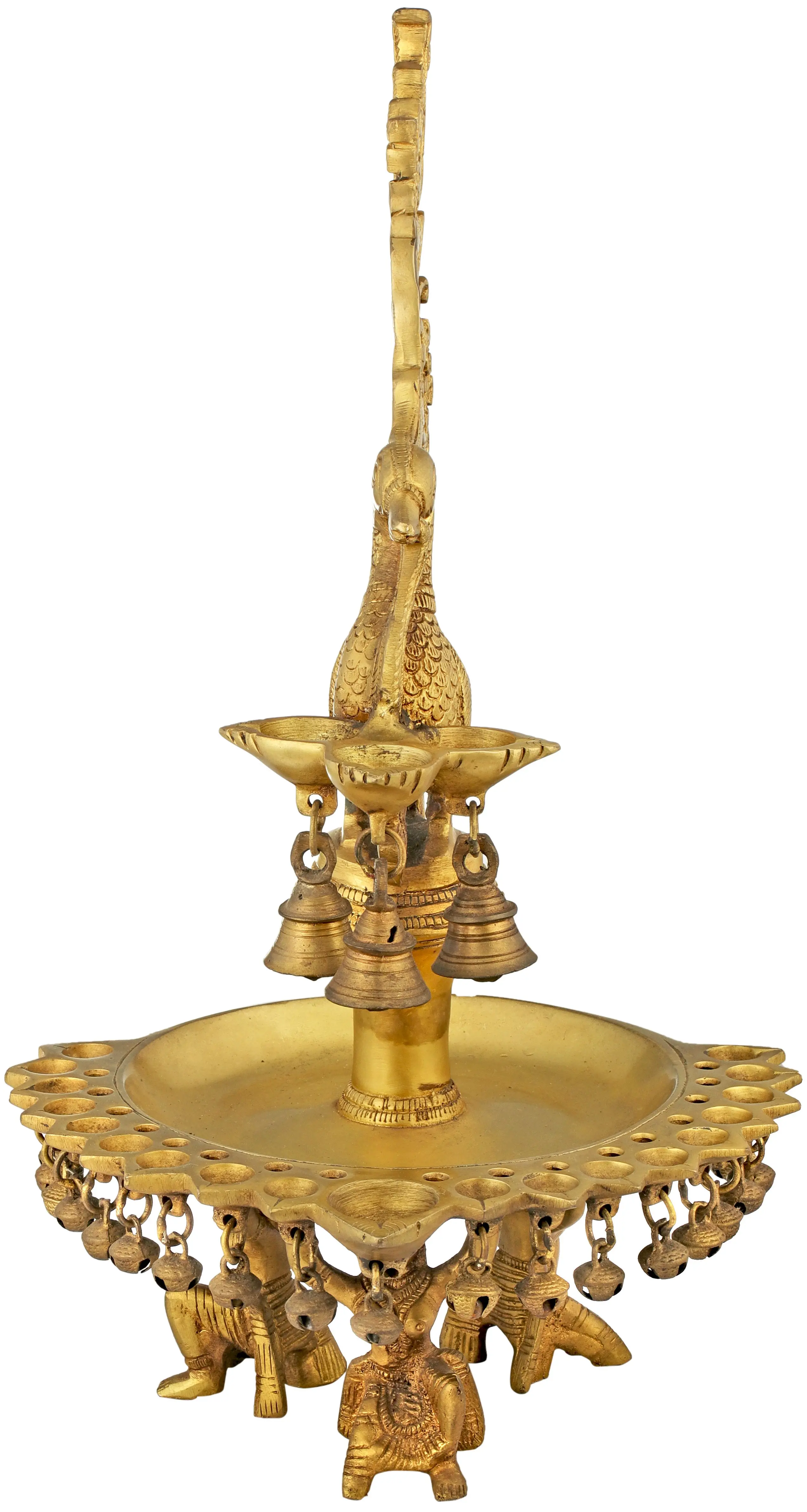 As the Skanda Purana bestows the title of the most beautiful light to the light of a lamp, the lamp throughout history has been one of the most beautiful pieces of art. They have been decorated with sacred images and ornamentations like metal bells, vines, and Jaal work. This brass lamp with an exquisite peacock motif and twenty-two wicks is one of those creations that is made by the infusion of art, craft, and philosophy. The twenty-two wicks celebrate the beautiful image of twinkling stars, the peacock motif is associated with prosperity and the lamp as a whole is a symbol of wisdom and intellectual growth. The brown, silver, and gold hues are placed intelligently to increase the beauty of the lamp and make it a perfect choice for art lovers.