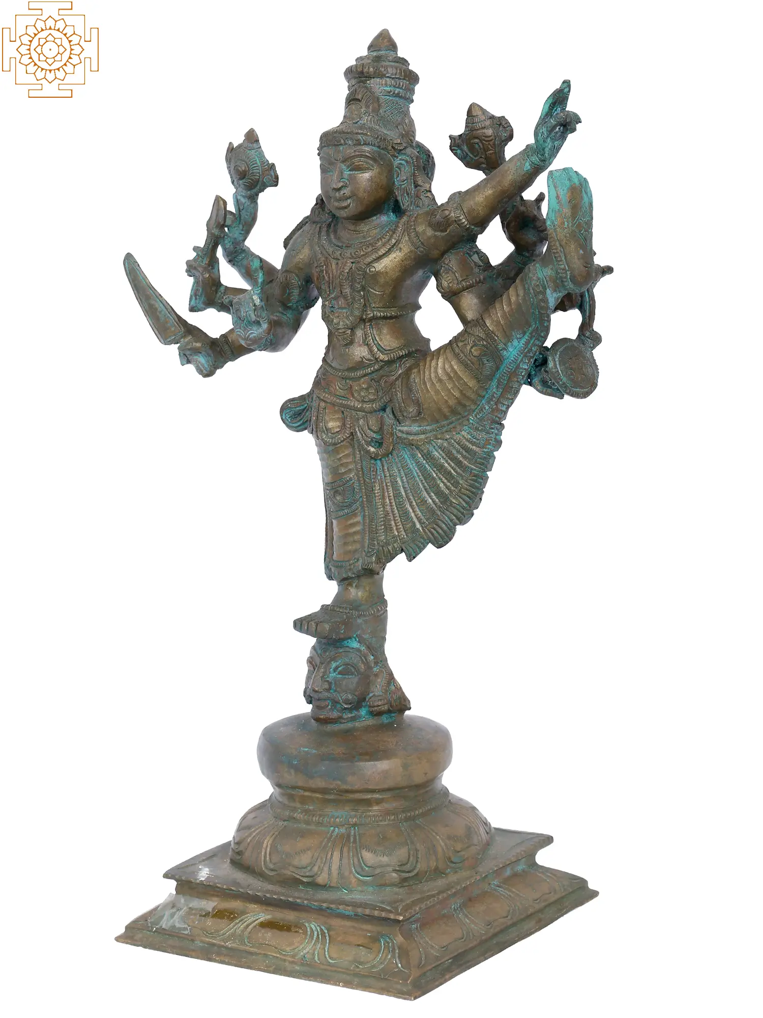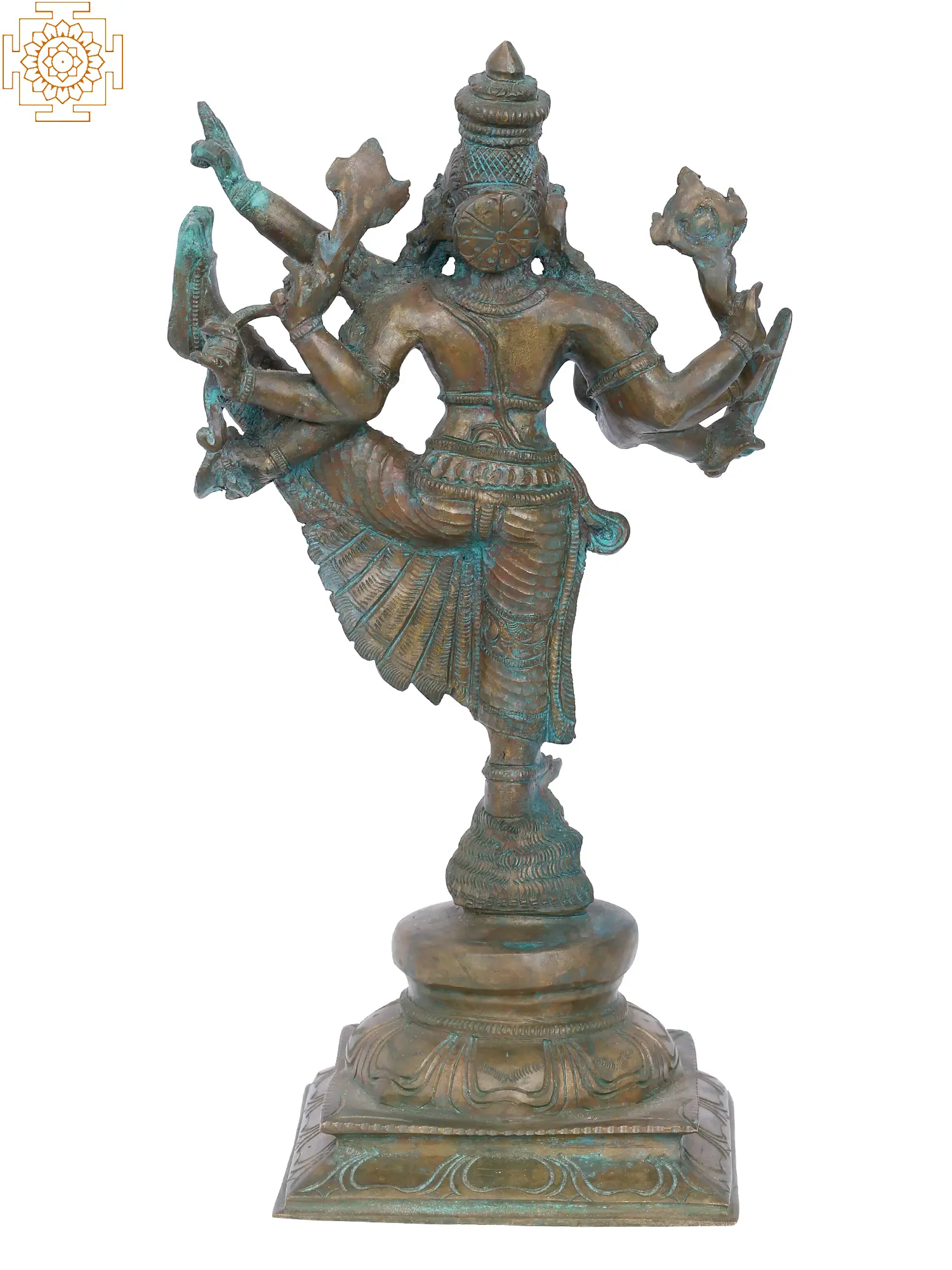 This statue depicts Ulagalantha Perumal in a magnificent pose, one leg extended upwards, symbolizing his all-encompassing reach, while the other leg is planted firmly on the ground, representing his mastery over the earthly plane. The multiple arms, characteristic of Vishnu, hold various divine attributes, though in this representation, they are dynamically positioned, conveying movement and immense power. The intricate detailing on the headdress, the divine garments, and the subtle facial expression speak volumes of the artisan's skill. The patina that graces the bronze adds depth and a sense of antiquity, hinting at the spiritual energies it has absorbed over time. The vibrant turquoise patina in certain areas, a natural occurrence in aged bronze, further enhances its aesthetic appeal and evokes a sense of timelessness.