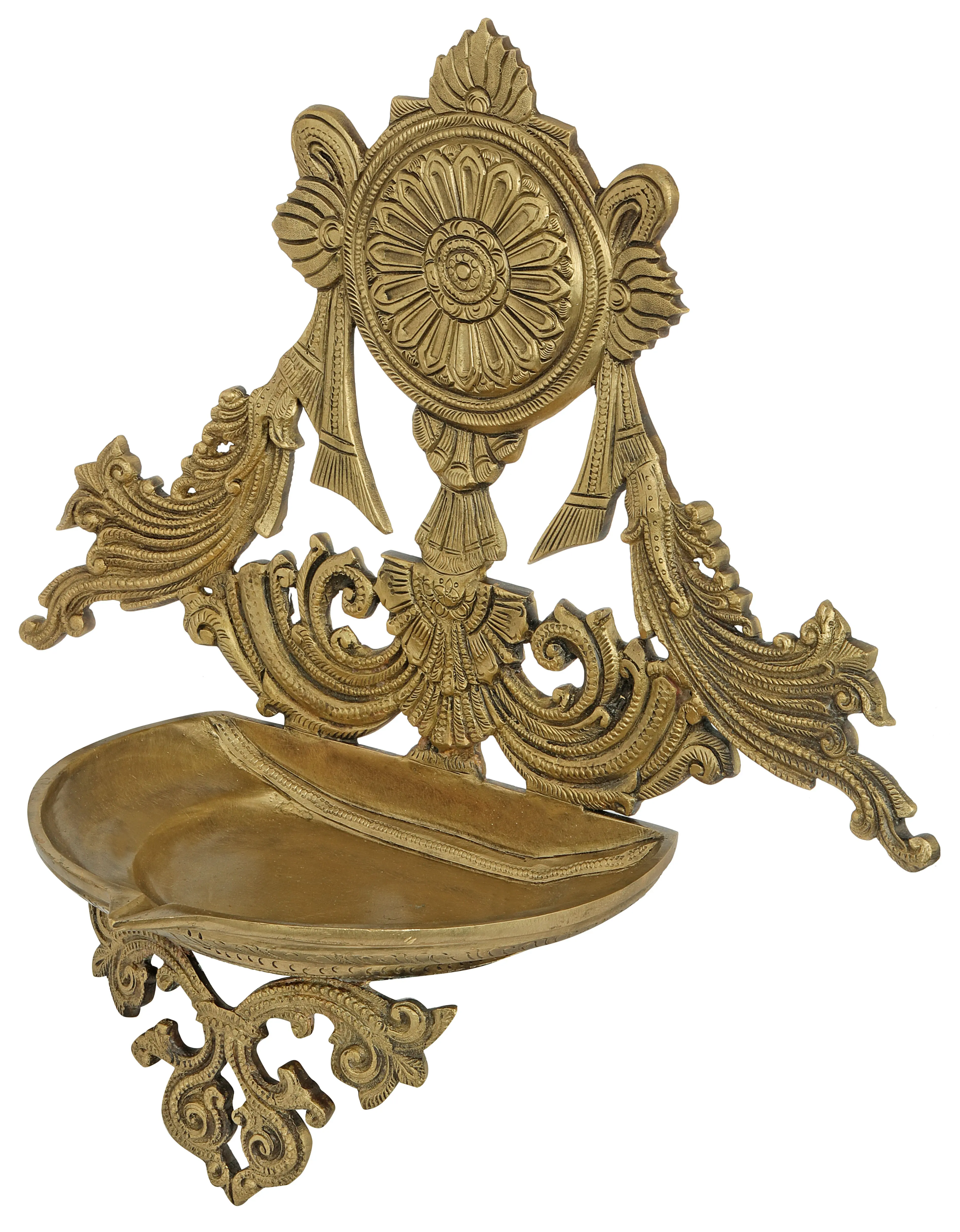 Sudarshan Chakra is Lord Vishnu's holy Chakra, and his worshippers worship it with total devotion and as a picture of the Lord himself. The weapon features two wheels and a plethora of sharp edges and gleams. This gold-colored bronze wall mount lamp in Hoysala style is devoted to the splendor and majesty of the Sudarshan Chakra. The lamp has a center depiction of the Sudarshan Chakra, followed by the standard one-wick oil bowl. The lamp also has an embellishment at the bottom. This lamp is intended to bring the energy of the Sudarshan Chakra into your house, dispel any bad energies and impediments, and assist the seer in attaining a higher level of living.