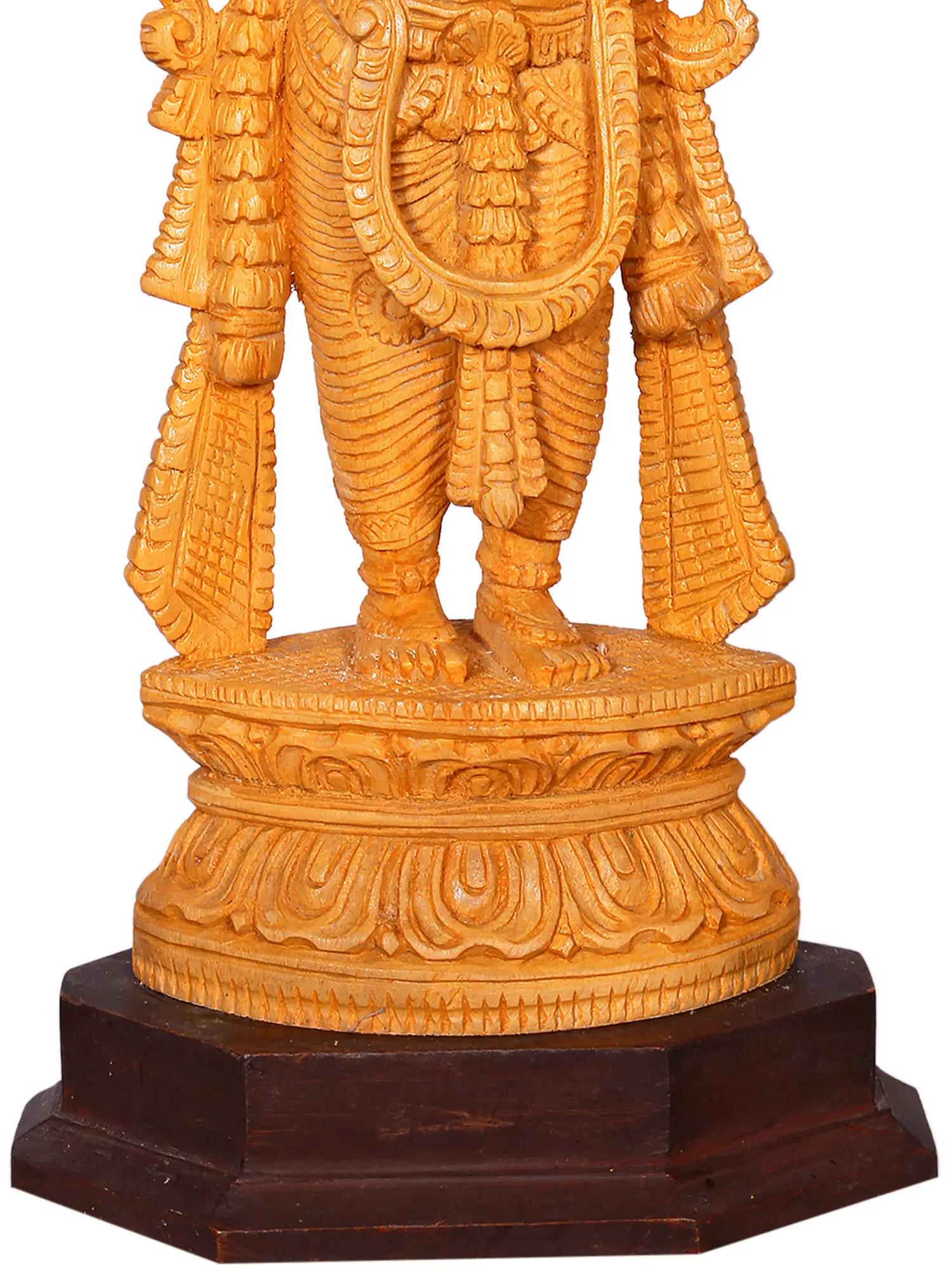 This statue is more than just an object of decoration; it is a conduit for spiritual connection. Krishna's effervescent spirit and his role as the eighth avatar of Vishnu are deeply revered. His tales, particularly those from the Srimad Bhagavatam and the Bhagavad Gita, offer profound philosophical and ethical guidance. This wooden depiction is an invitation to reflect on these timeless teachings and to embrace the divine qualities that Krishna embodies. The choice of wood as a medium itself carries cultural weight, often associated with natural beauty and purity in various spiritual traditions. Each grain and contour of the wood has been shaped by skilled hands to evoke the divine aura of the deity. This piece is perfect for those seeking to deepen their spiritual practice, enhance their home decor with a touch of sacred art, or as a thoughtful gift for loved ones who cherish Hindu culture and spirituality. It is a tangible representation of an intangible divinity, a piece that resonates with devotion, artistry, and the eternal melody of the divine.