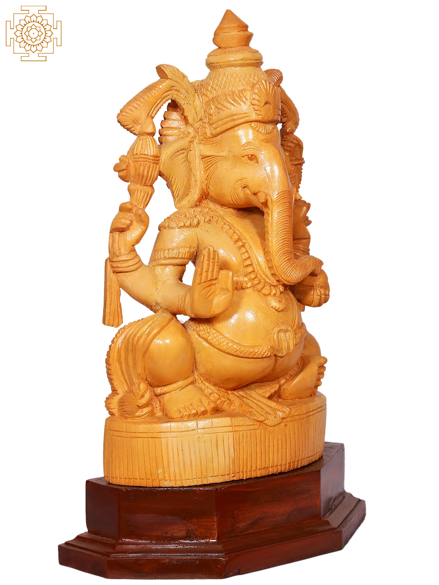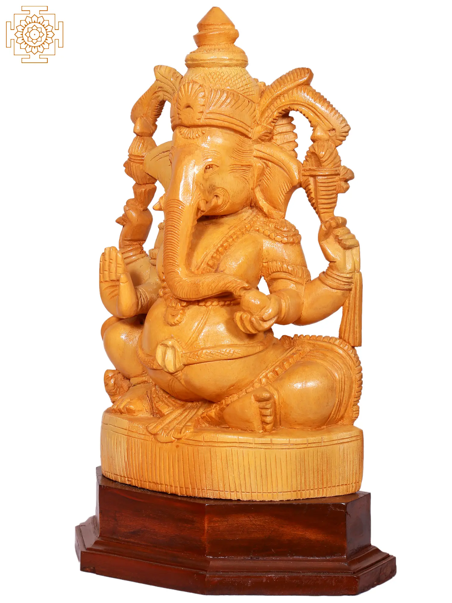 Invite the divine presence of Lord Ganesha into your home with this exquisite wooden carving. Lord Ganesha, the beloved elephant-headed deity, is revered as the remover of obstacles, the patron of arts and sciences, and the intellect of wisdom. This beautifully crafted statue captures his benevolent essence, making it a powerful focal point for devotion, meditation, or simply as a symbol of good fortune. Crafted from fine wood, this 15-inch statue showcases the intricate artistry and traditional craftsmanship that goes into creating such sacred objects. Each curve and detail is meticulously carved, from the majestic tusks and wise, large ears to the gentle smile that graces Ganesha's face. The rich, warm tones of the wood evoke a sense of natural beauty and spiritual serenity, while the smooth finish invites a tactile connection to the divine. Ganesha sits in a contemplative posture, his iconic four arms gracefully holding various symbolic items that represent his divine attributes – often including an axe to sever attachments, a noose to capture desires, a bowl of sweets for the rewards of devotion, and his own broken tusk, a testament to his sacrifice and dedication to wisdom. ––––––––––––––––––