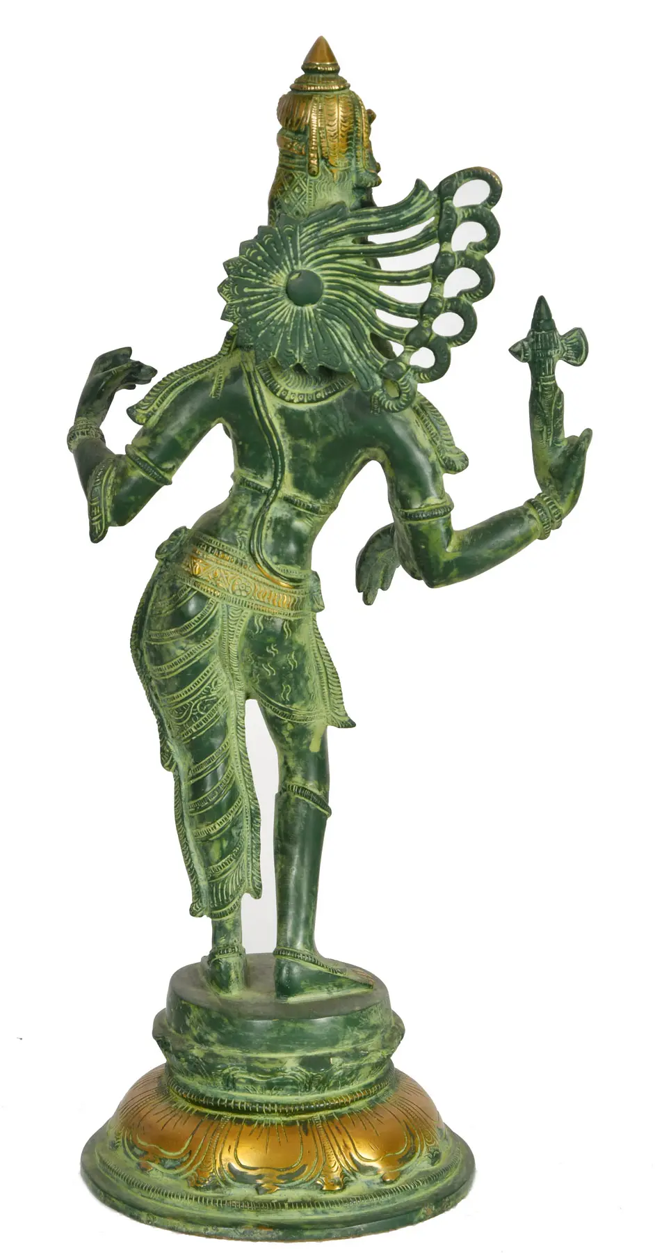 Discover the exquisite Ardhanarishvara, a divine embodiment that harmonises spiritual asceticism and materialistic household life. This mesmerising brass sculpture portrays the divine union of Shiva and Parvati, symbolising their interdependence and balance. Ardhanarishvara's graceful form captures the Tribhanga posture, with the right half representing masculine traits like logic and valour, while the left embodies feminine qualities like intuition and creativity, located at the heart. This sculpture exudes a captivating divine presence, offering a beautiful fusion of spirituality and materialism.
