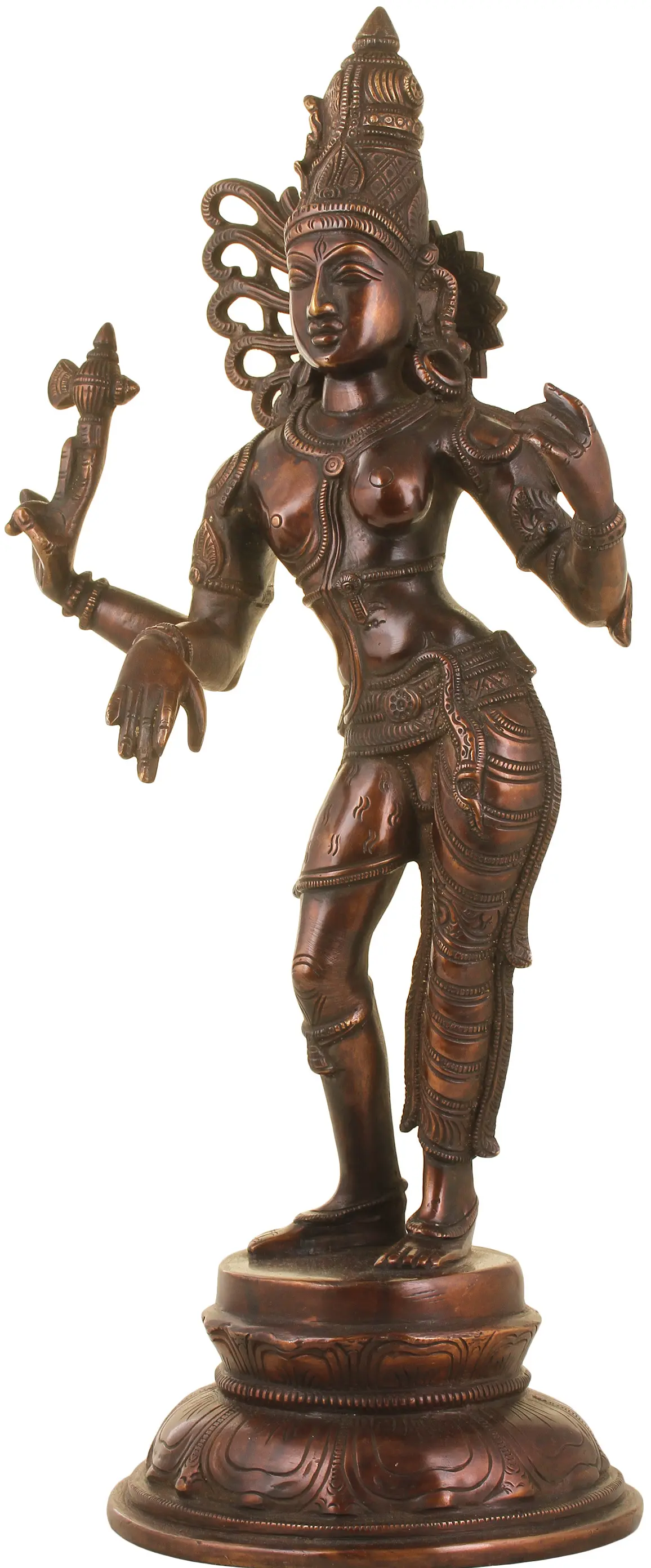 This magnificent brass statue captures the profound essence of Ardhanarishvara, a divine composite deity formed by the union of the Hindu deities Shiva and his consort Parvati (Shakti). Ardhanarishvara symbolizes the fundamental oneness of masculine and feminine energies that pervade the entire universe. The left half of the idol represents Parvati, embodying feminine power, creation, nurturing, and love, while the right half represents Shiva, signifying masculine power, destruction, transformation, and cosmic consciousness. Together, they illustrate that neither can exist without the other, representing the ultimate balance and interdependence of all forces.