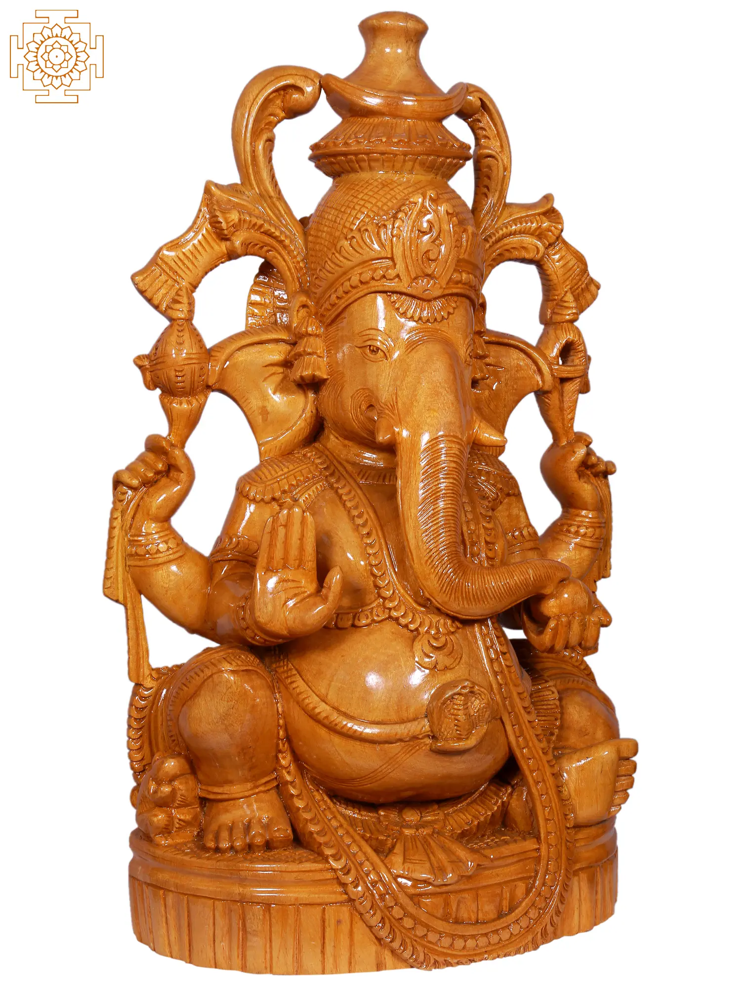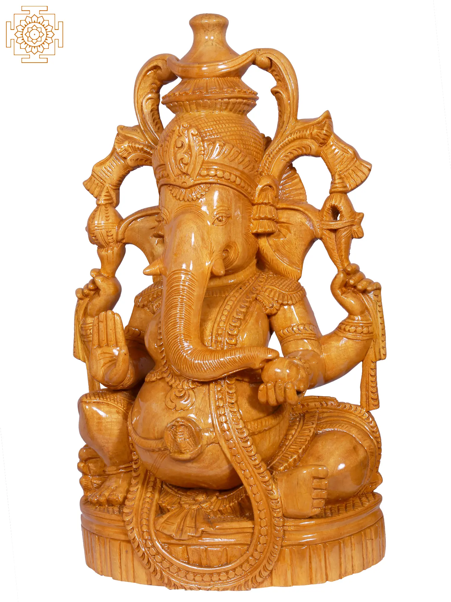 The whitewood medium gives this seated Ganapati murti a glaze that would look good in any home or office space. It is a compact, moderately symmetrical structure, designed to fit a small temple.