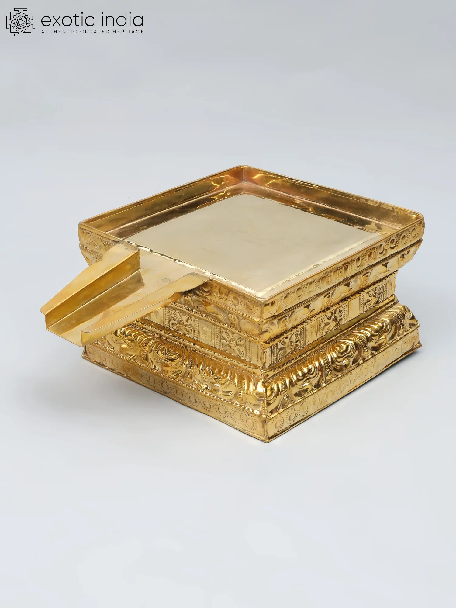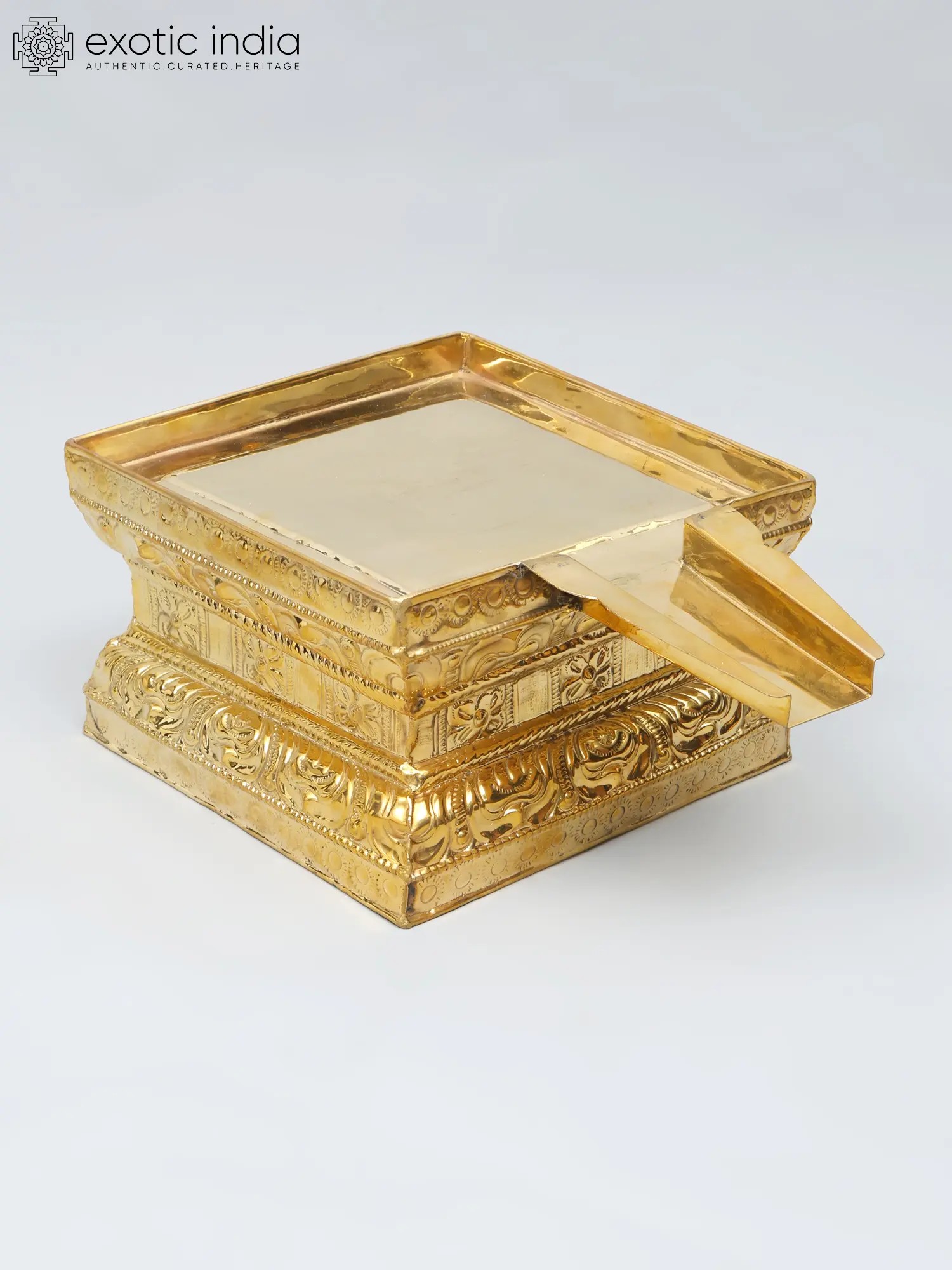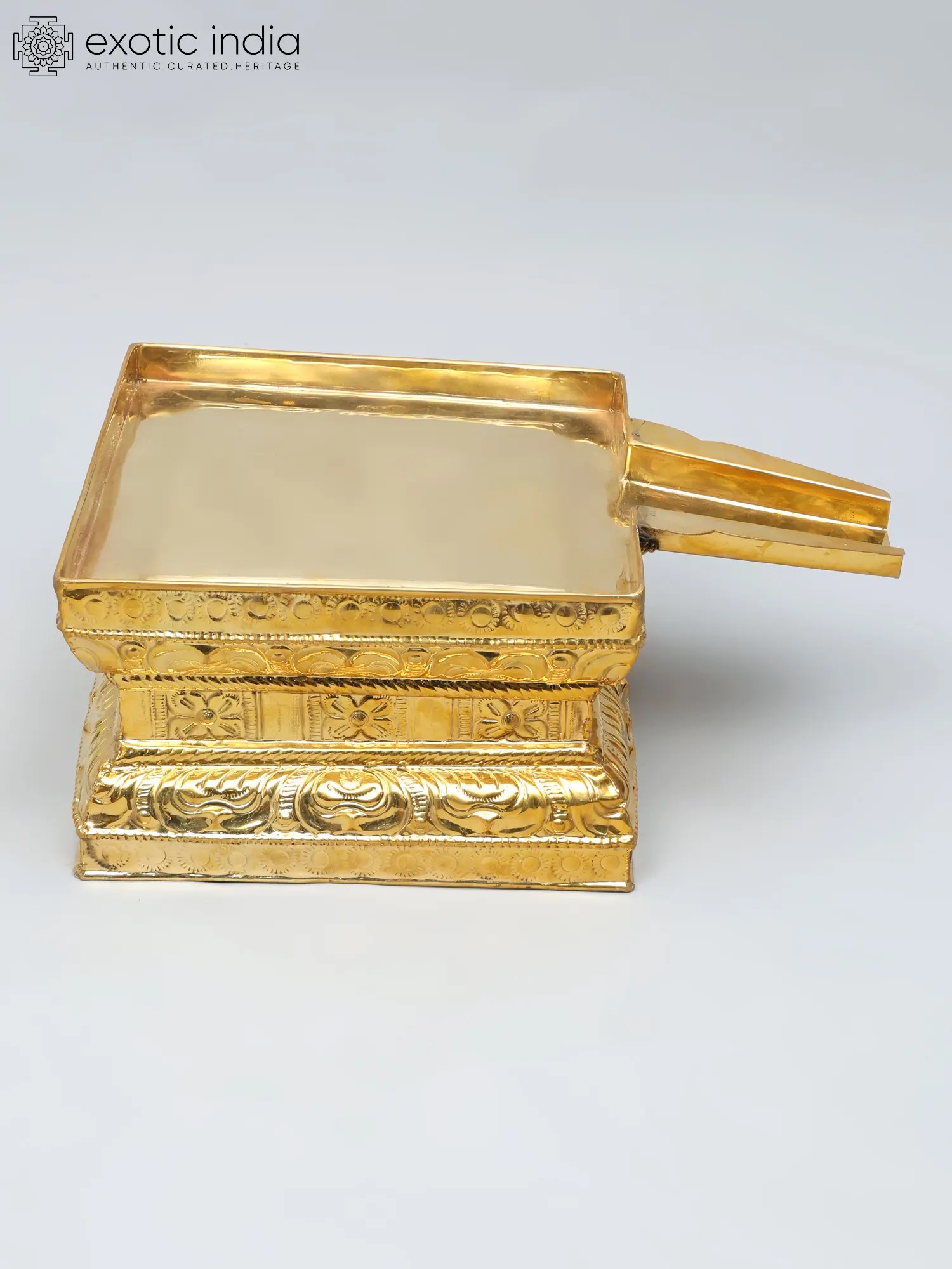 Abhishek is integral to the Shringara rituals for the Gods and Goddesses. This brass Abhishek Patra is designed to facilitate the bathing rituals of the deities. The object is designed as a square pedestal with a nozzle-like slide attached to it. Technically, the slide allows the curd, milk, water, or other sacred liquid to flow down while the deities are bathed with them. The square pedestal is where the statues are placed. This Abhishek Patra is designed with beautiful carvings on the stand and looks magnificent. It can quickly become one object with high ritualistic value and also grab the onlookers' attention.