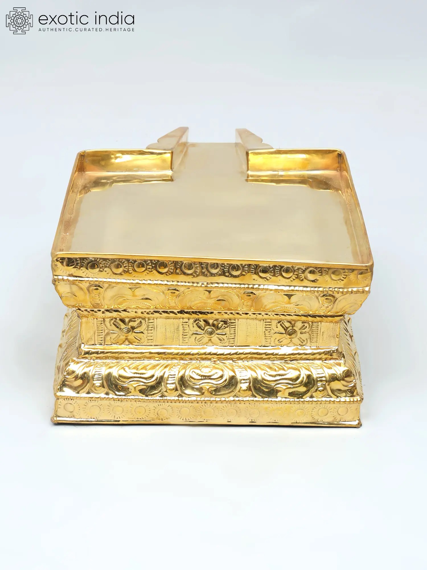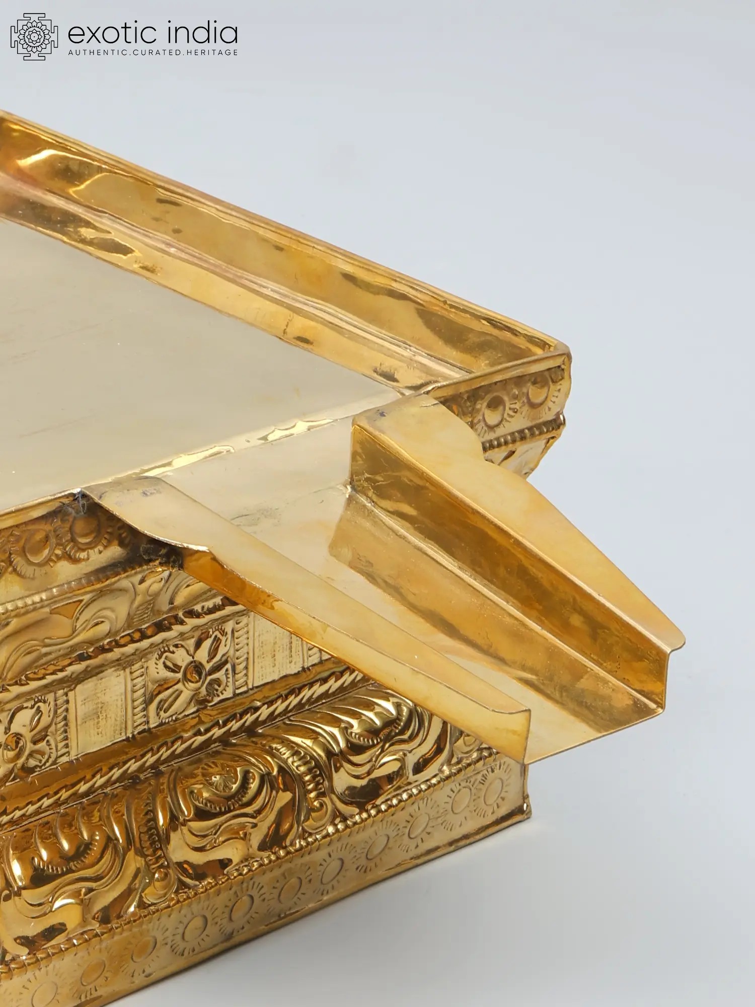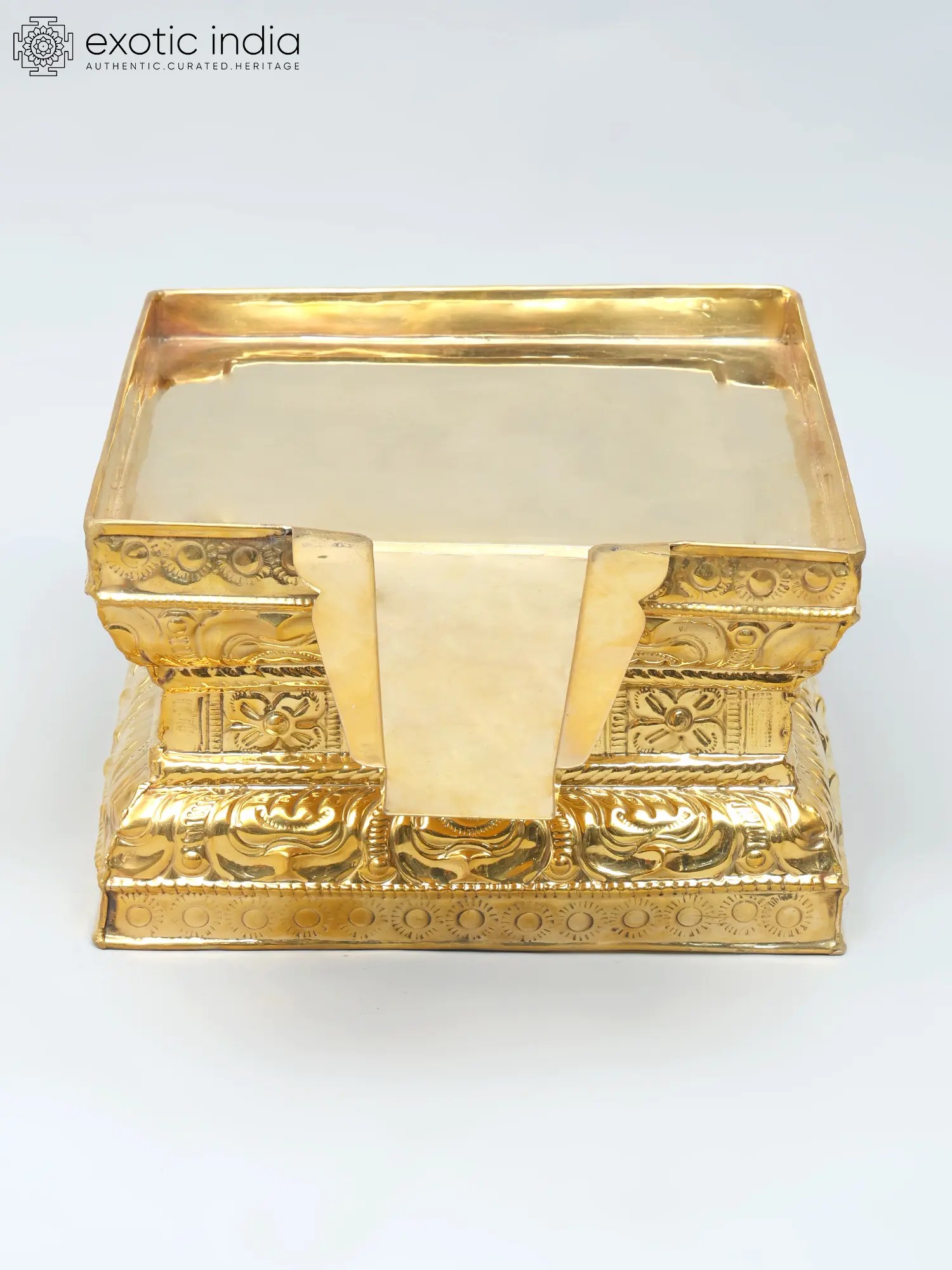 Abhishek is integral to the Shringara rituals for the Gods and Goddesses. This brass Abhishek Patra is designed to facilitate the bathing rituals of the deities. The object is designed as a square pedestal with a nozzle-like slide attached to it. Technically, the slide allows the curd, milk, water, or other sacred liquid to flow down while the deities are bathed with them. The square pedestal is where the statues are placed. This Abhishek Patra is designed with beautiful carvings on the stand and looks magnificent. It can quickly become one object with high ritualistic value and also grab the onlookers' attention.