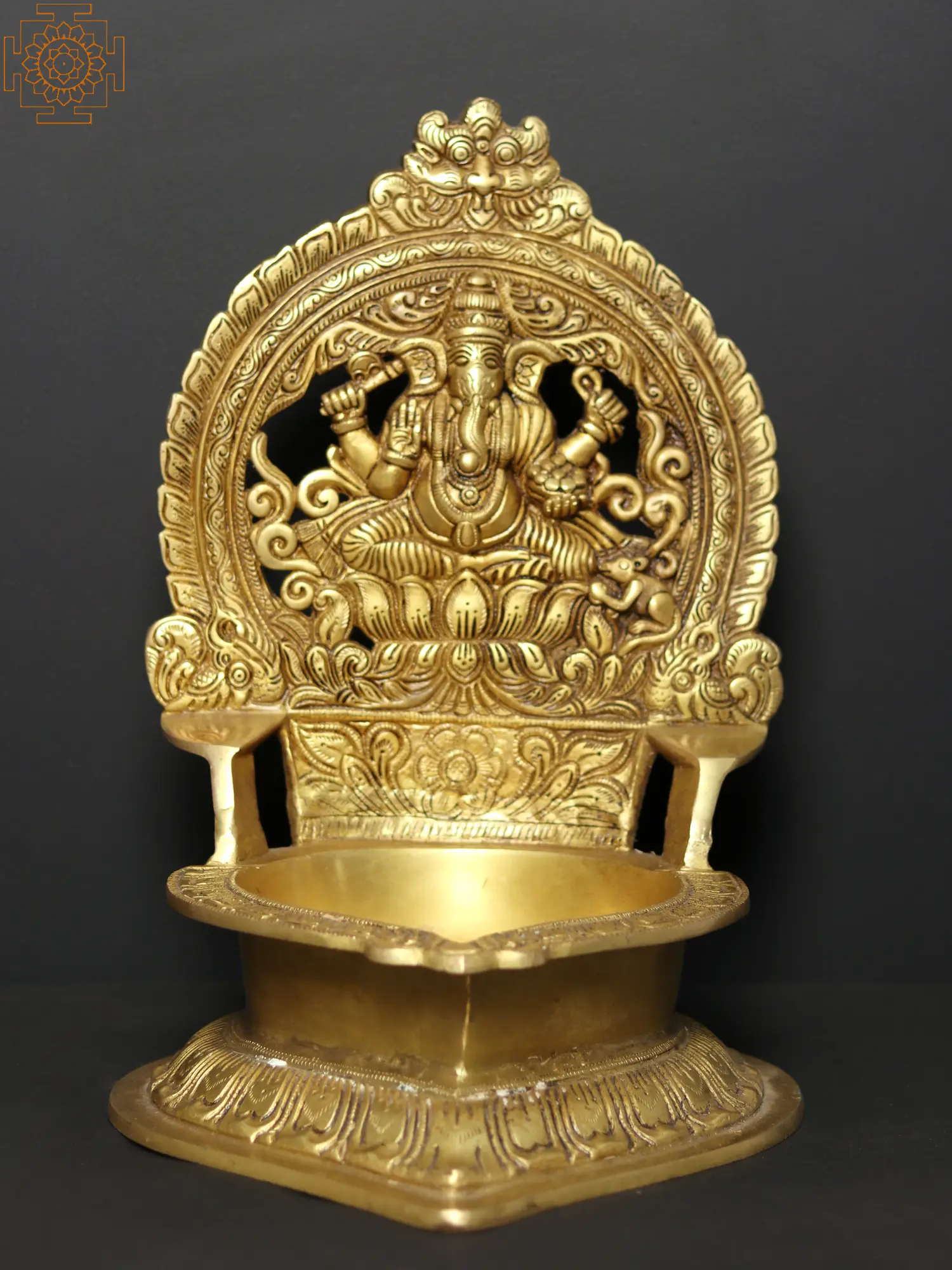 This beautiful deepam is an intricate piece to have for your Mandir\Pooja Ghar, made with careful detailing in the durability of brass. The plate with his deepam depicts Lord Ganapati, the emobidment of wisdom seated in a Padmasana holding an Ankusha, Pasa, and Laddoo while his final hand grants the devotees in Varada mudra as the Jyoti is lit to the ritual of worship.