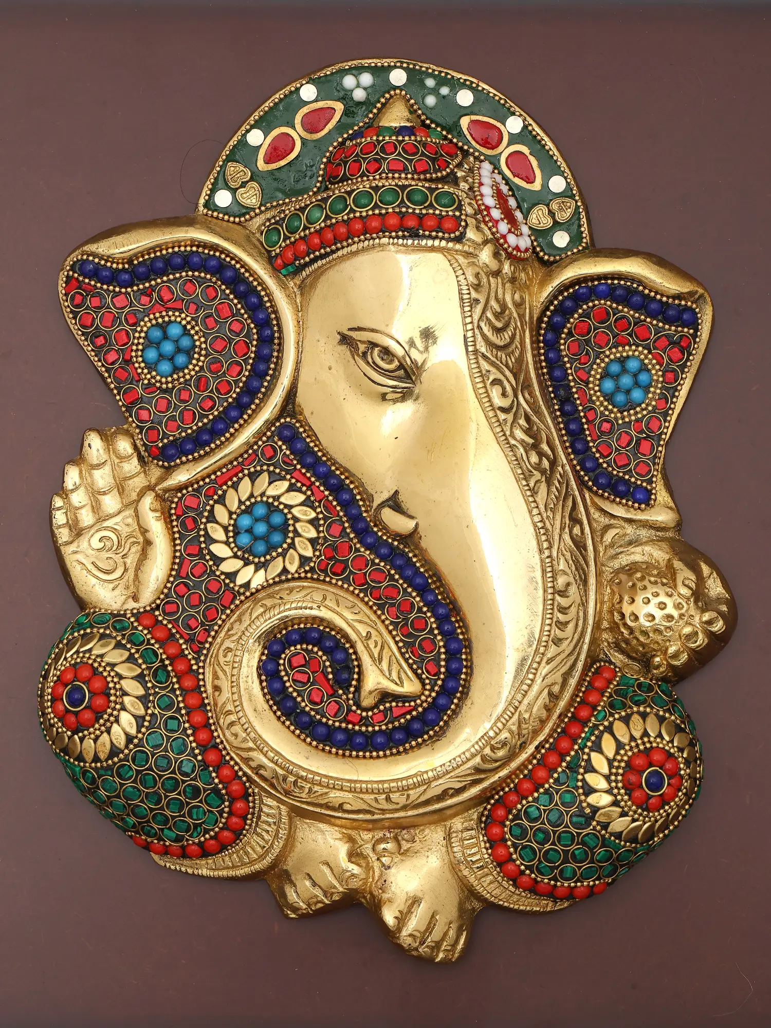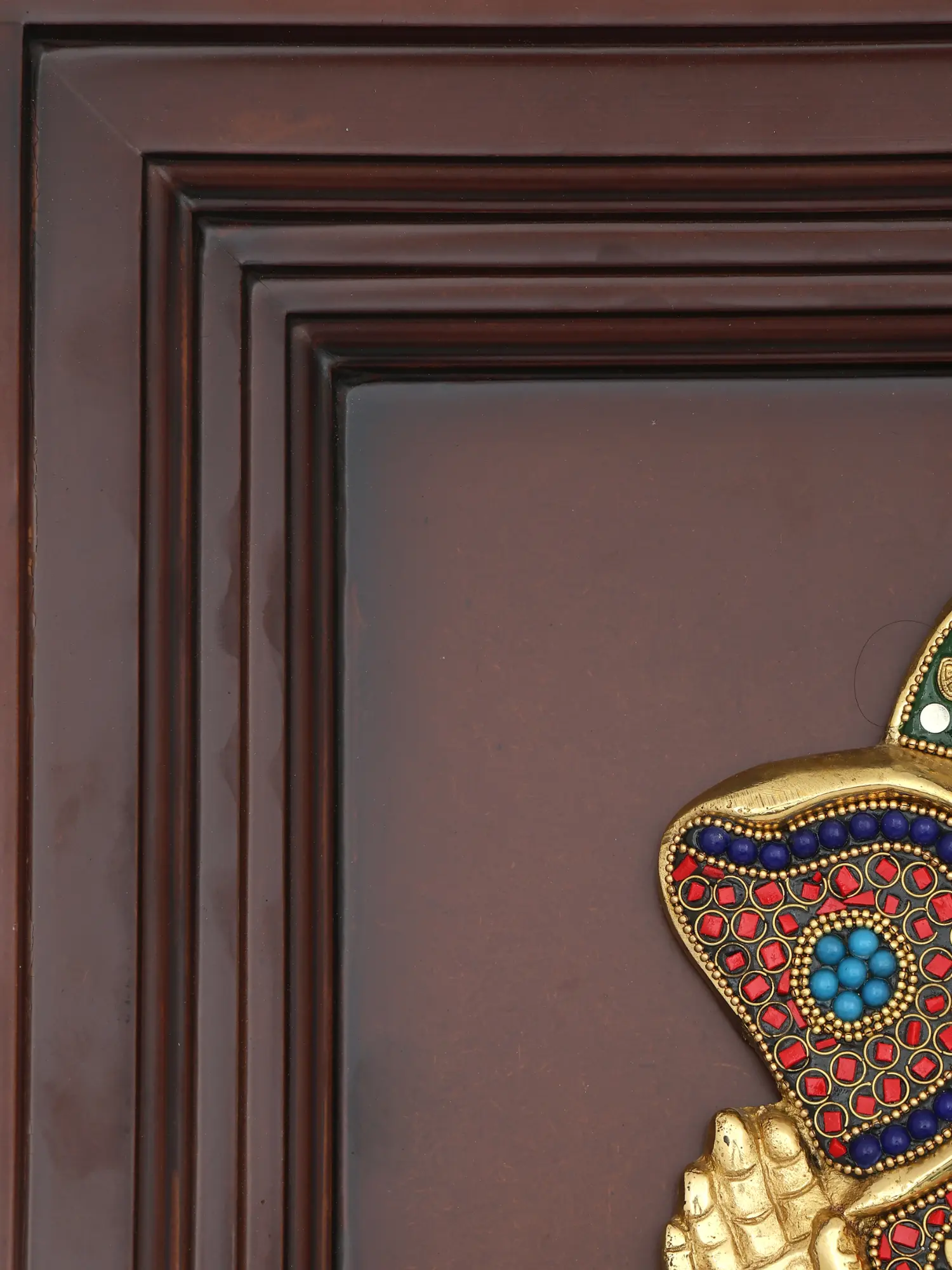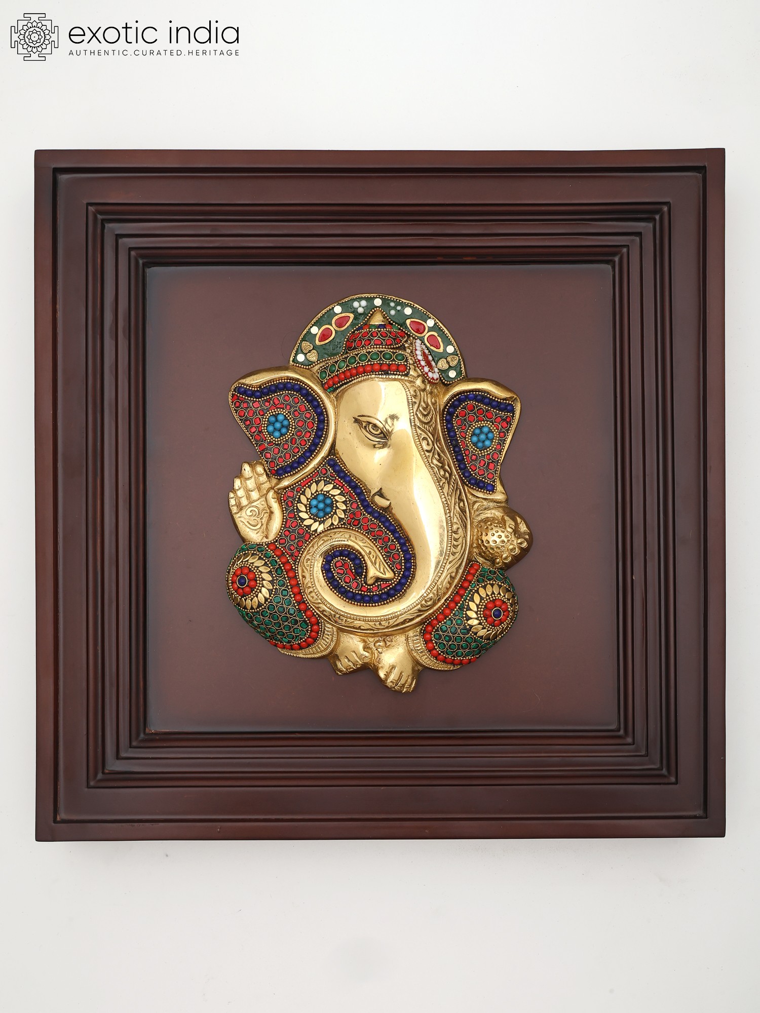 15" Stylized Lord Ganesha | Wood Framed Brass Sculpture | Wall Hanging