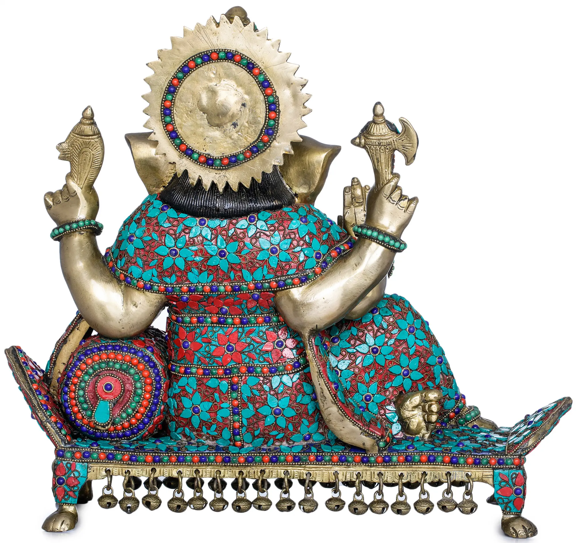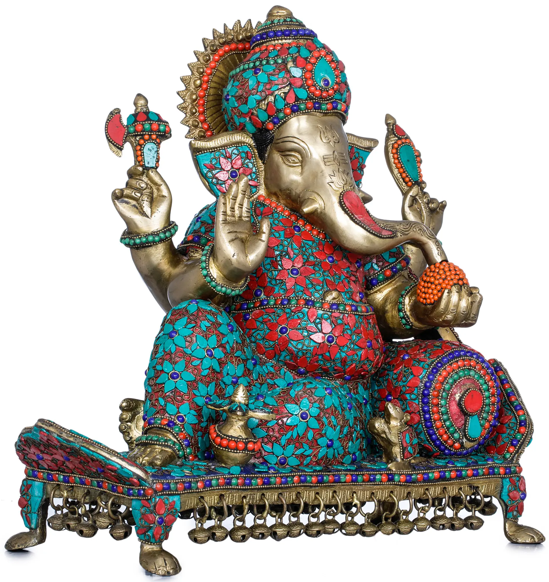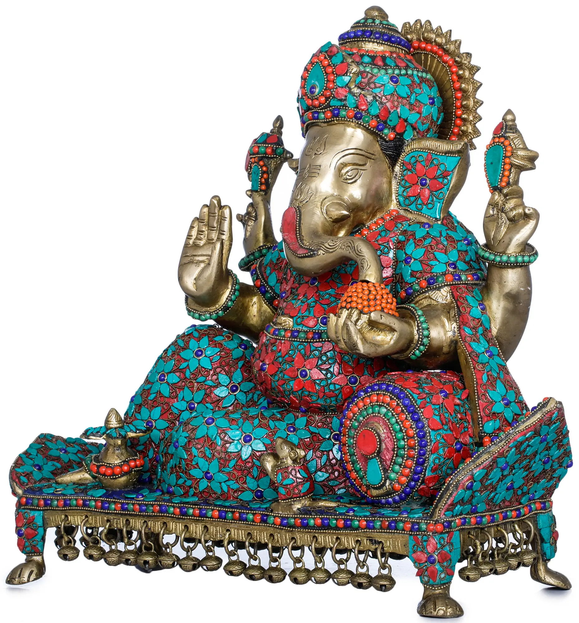 Invite the presence of wisdom, prosperity, and good fortune into your home with this magnificent brass Ganesha idol, meticulously handcrafted in India. Ganesha, the beloved elephant-headed deity, is revered as the remover of obstacles and the lord of beginnings. This particular depiction captures him in a posture of profound relaxation and contemplation, seated upon an ornate recliner. The intricate inlay work adorning the idol, featuring vibrant hues of red and turquoise interspersed with accents of blue and gold, brings the divine form to life, radiating an aura of peace and opulence.