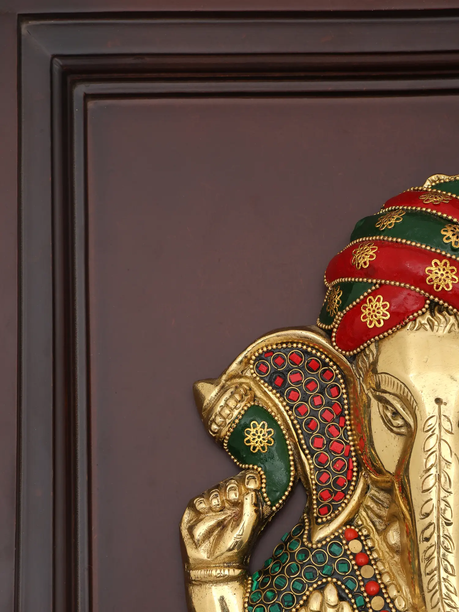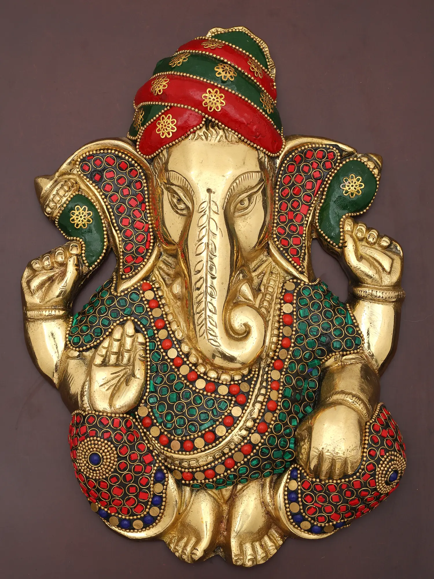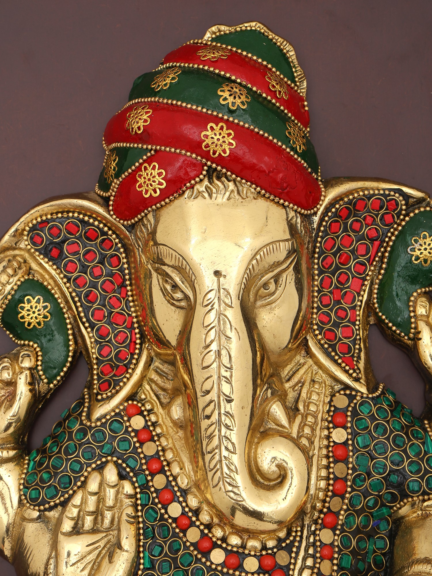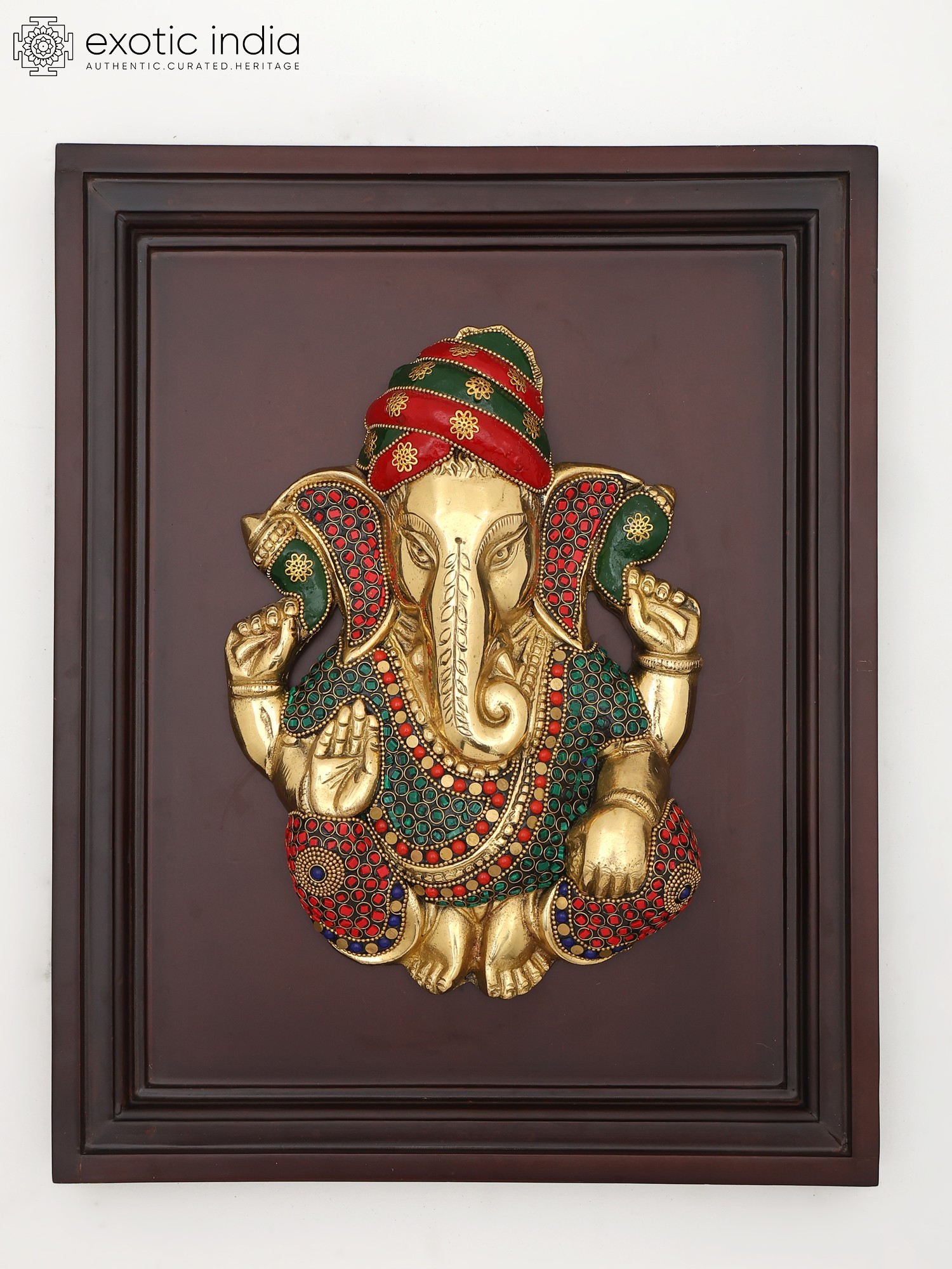 16" Blessing Pagadi Ganesha | Wall Hanging | Wood Framed Brass Sculpture with Inlay Work