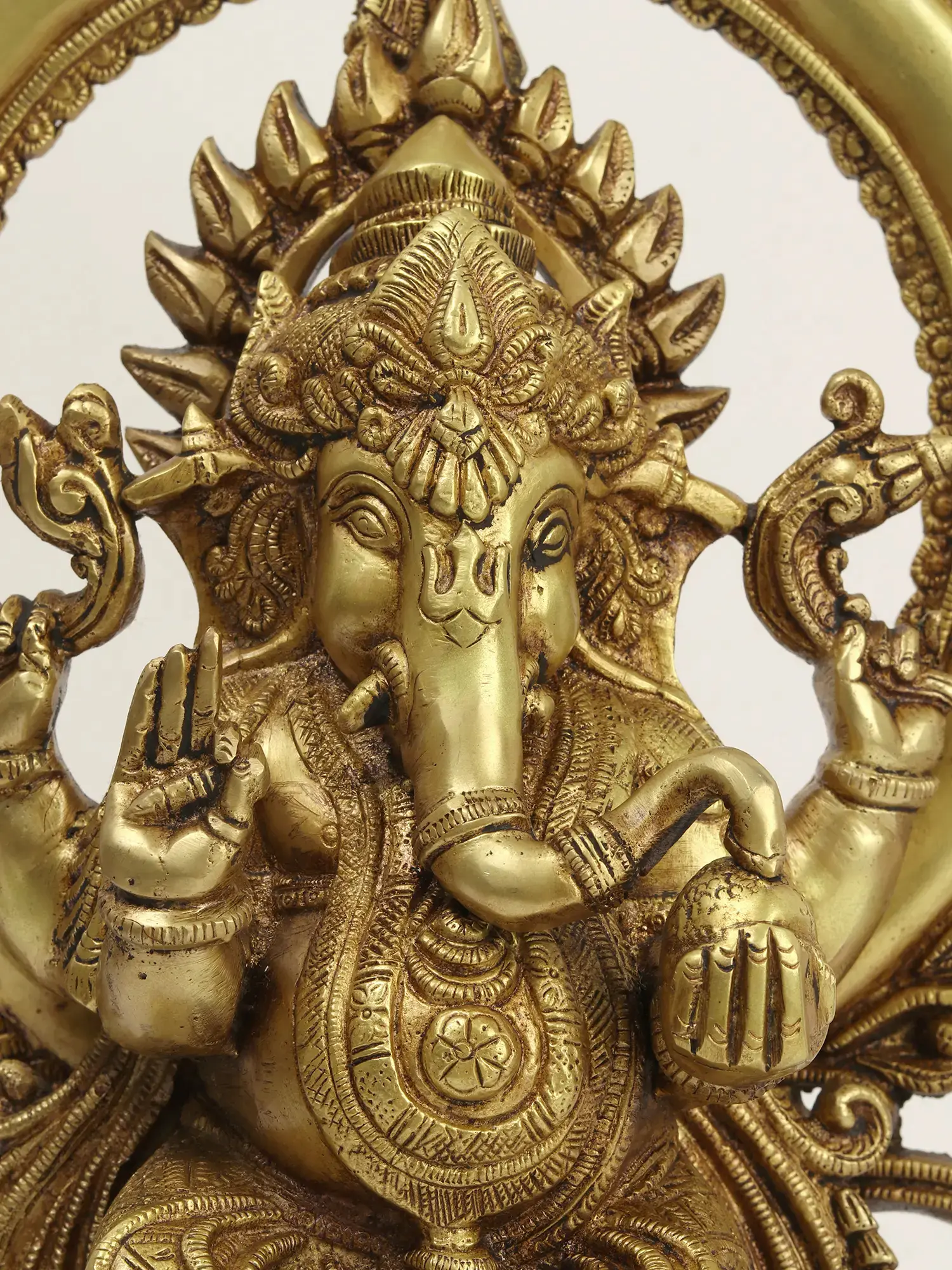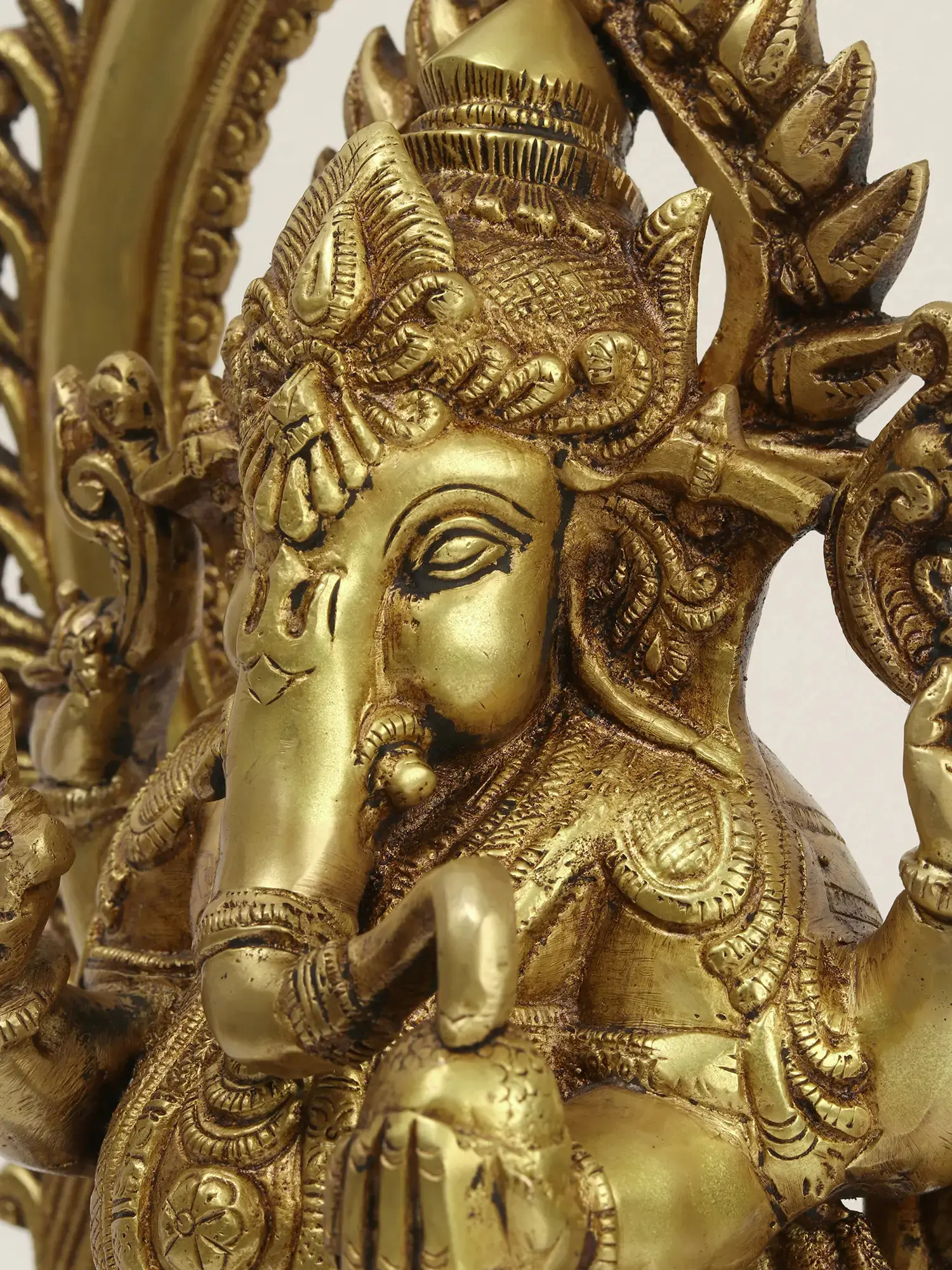 Lord Ganesha is seated upon a truly regal throne, a striking Kirtimukha arch. The Kirtimukha, meaning "face of glory," is a mythical creature often depicted as a lion or demon face with gaping jaws, from which foliage and floral motifs emerge. In Hindu iconography, the Kirtimukha symbolizes cosmic power, protection, and the devouring of ego. It is often seen as guarding sacred spaces and warding off negative influences. This elaborately carved arch frames the divine form of Ganesha, creating a powerful visual statement of his supreme status and protective embrace. The intricate detailing within the arch, from the swirling decorative elements to the fearsome yet benevolent visage at its apex, speaks to the depth of traditional craftsmanship.