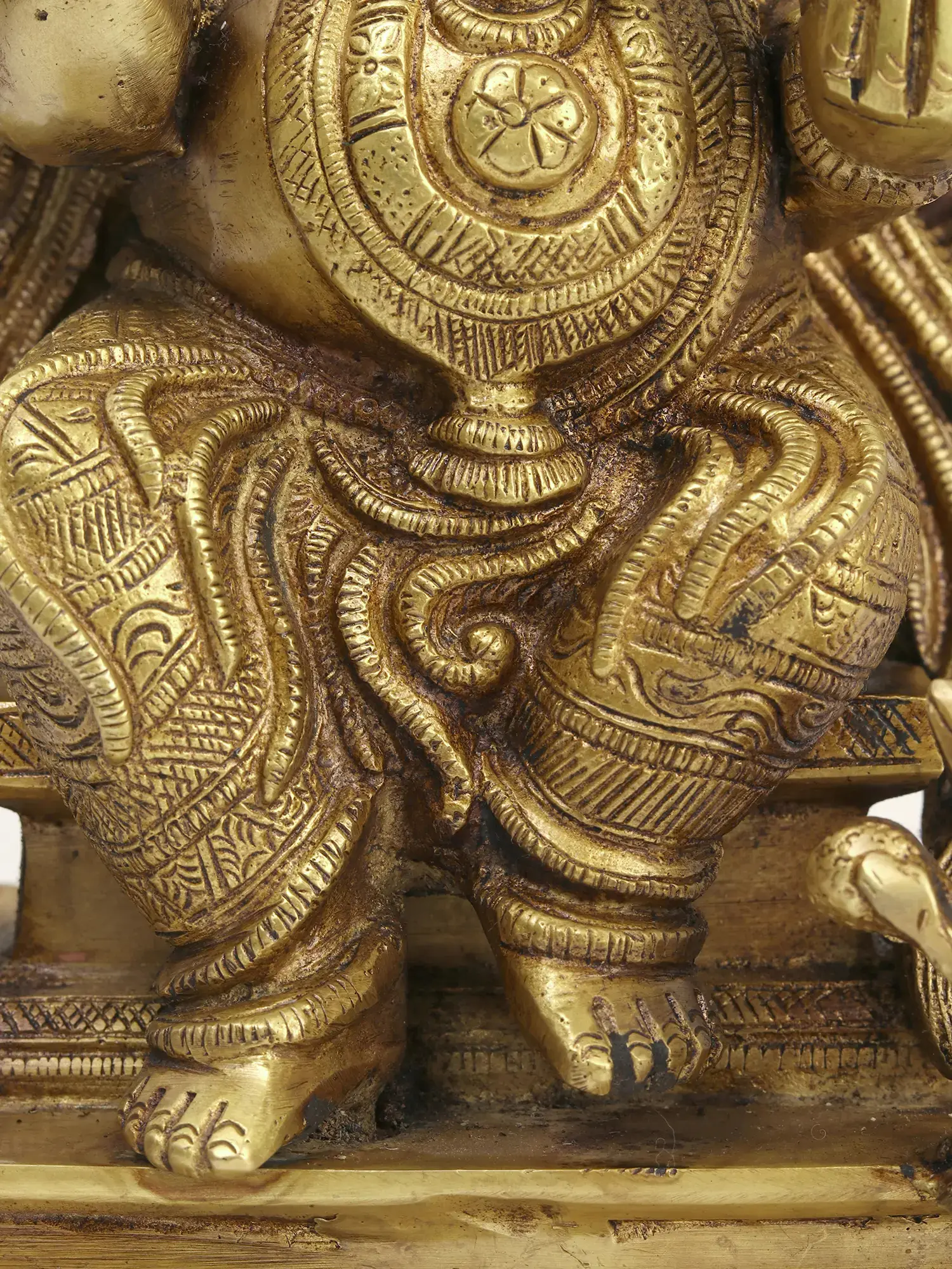 Every element of this sculpture is imbued with meaning. Ganesha’s multiple arms, each often carrying a symbolic item like an axe, a noose, or a modak (his favorite sweet), represent his multifaceted powers and his ability to manage the complexities of existence. His gentle eyes, often depicted with a subtle smile, invite devotion and offer solace. The presence of his vehicle, the Mushika (mouse), at his feet is also significant. The mouse, representing worldly desires and the ability to navigate through them with agility, is subservient to Ganesha, signifying his mastery over all aspects of life, both material and spiritual. This brass sculpture is not merely an object of art; it is an invitation to connect with the divine, to seek guidance, and to invoke blessings for prosperity, success, and the removal of all hindrances. It is a piece that resonates with centuries of devotion and cultural heritage, designed to be a cherished centerpiece in any sacred or contemplative space.