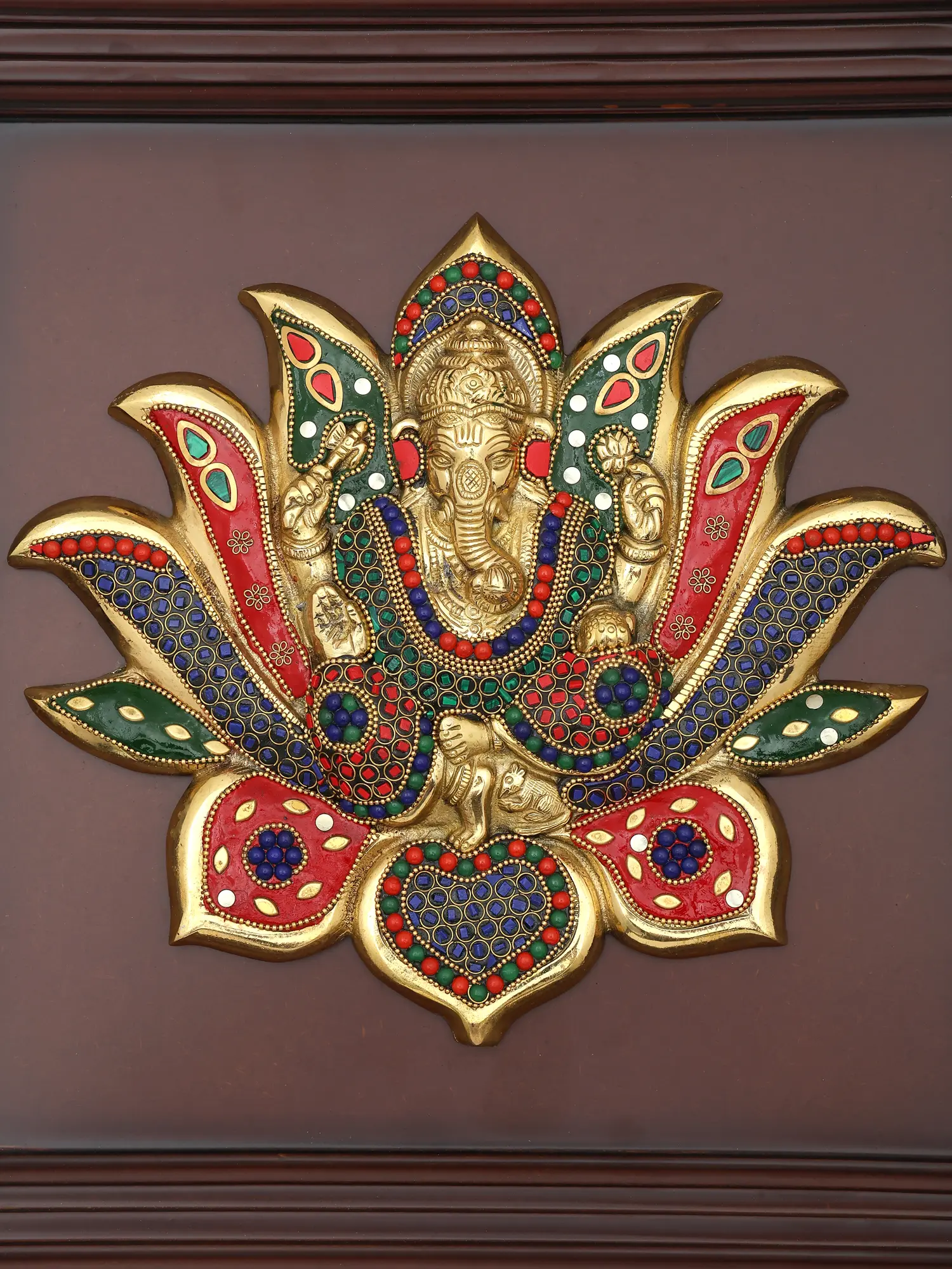 12" Blessing Lord Ganesha | Wood Framed Brass Sculpture | Wall Hanging