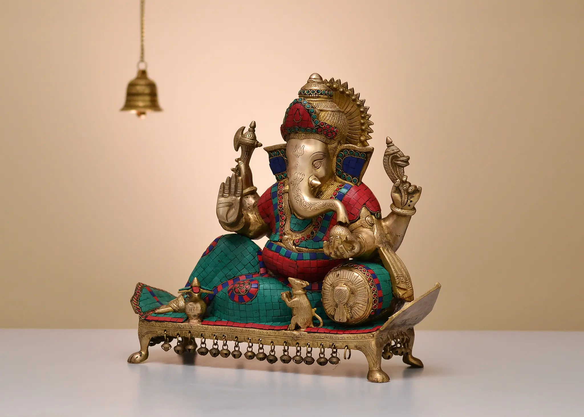 Every element of this idol speaks to the skill of the artisan. The brass has been meticulously shaped to form the beloved figure of Ganesha, from the gentle curve of his trunk to the serene expression on his face. The surrounding pedestal is equally detailed, adorned with a pattern that suggests the flowing drapery of a royal couch. The inlay work, a hallmark of traditional Indian craftsmanship, uses stones of contrasting colors, creating a captivating visual texture that draws the eye and highlights the deity's divine attire. The small, dangling bells on the underside of the pedestal add a subtle, melodic charm, reminiscent of temple bells that announce the arrival of the sacred. This idol is more than just a decorative object; it is a conduit for spiritual energy and a testament to the enduring beauty of devotional art. Whether placed in your living room, study, or meditation space, it serves as a constant reminder of Ganesha's blessings – wisdom, good fortune, and the removal of all impediments. It makes for a thoughtful and revered gift for housewarmings, festivals, or any occasion that calls for the bestowing of good luck and blessings. Allow the divine artistry and the serene form of this Ganesha idol to fill your space with peace and prosperity.