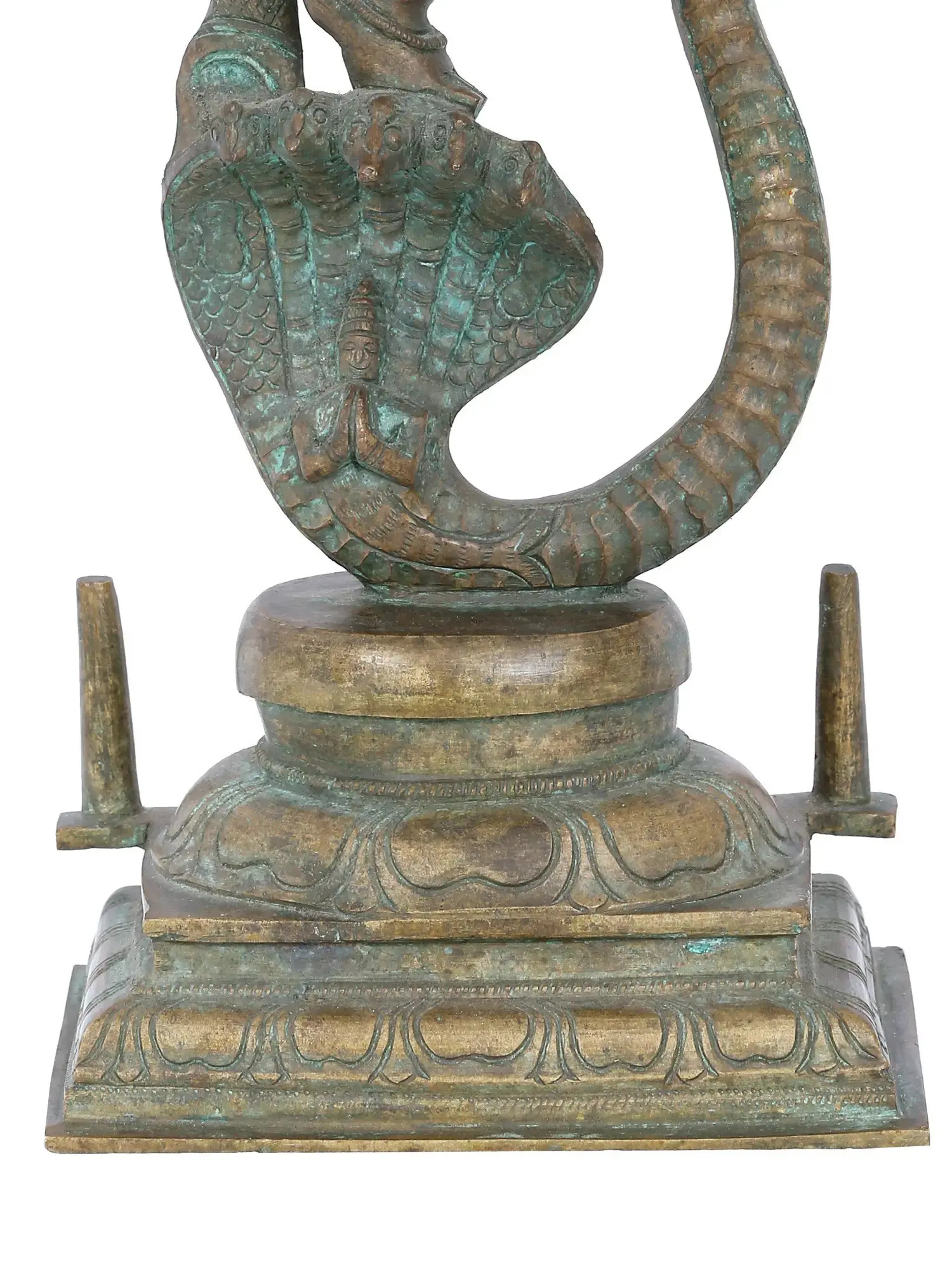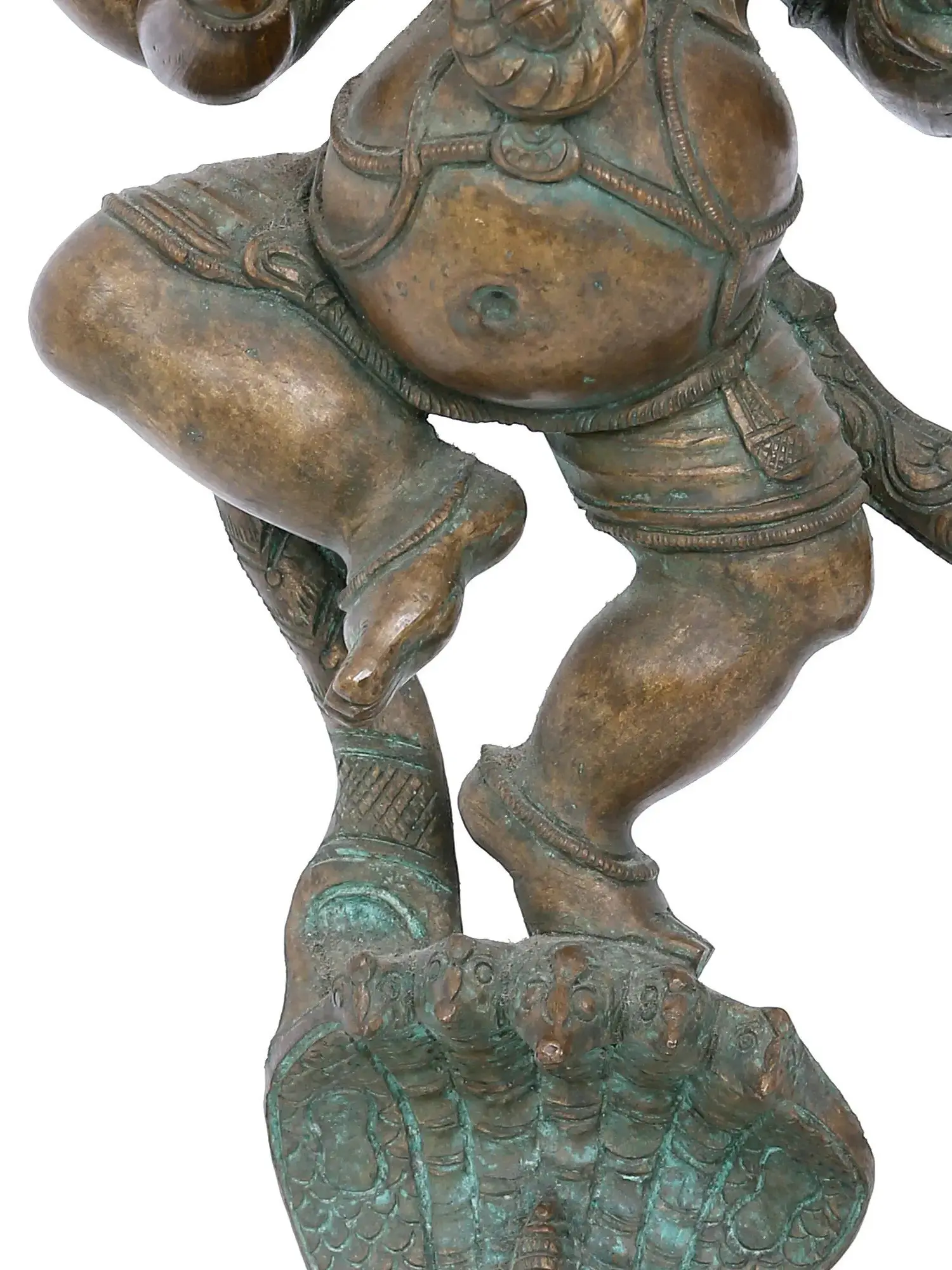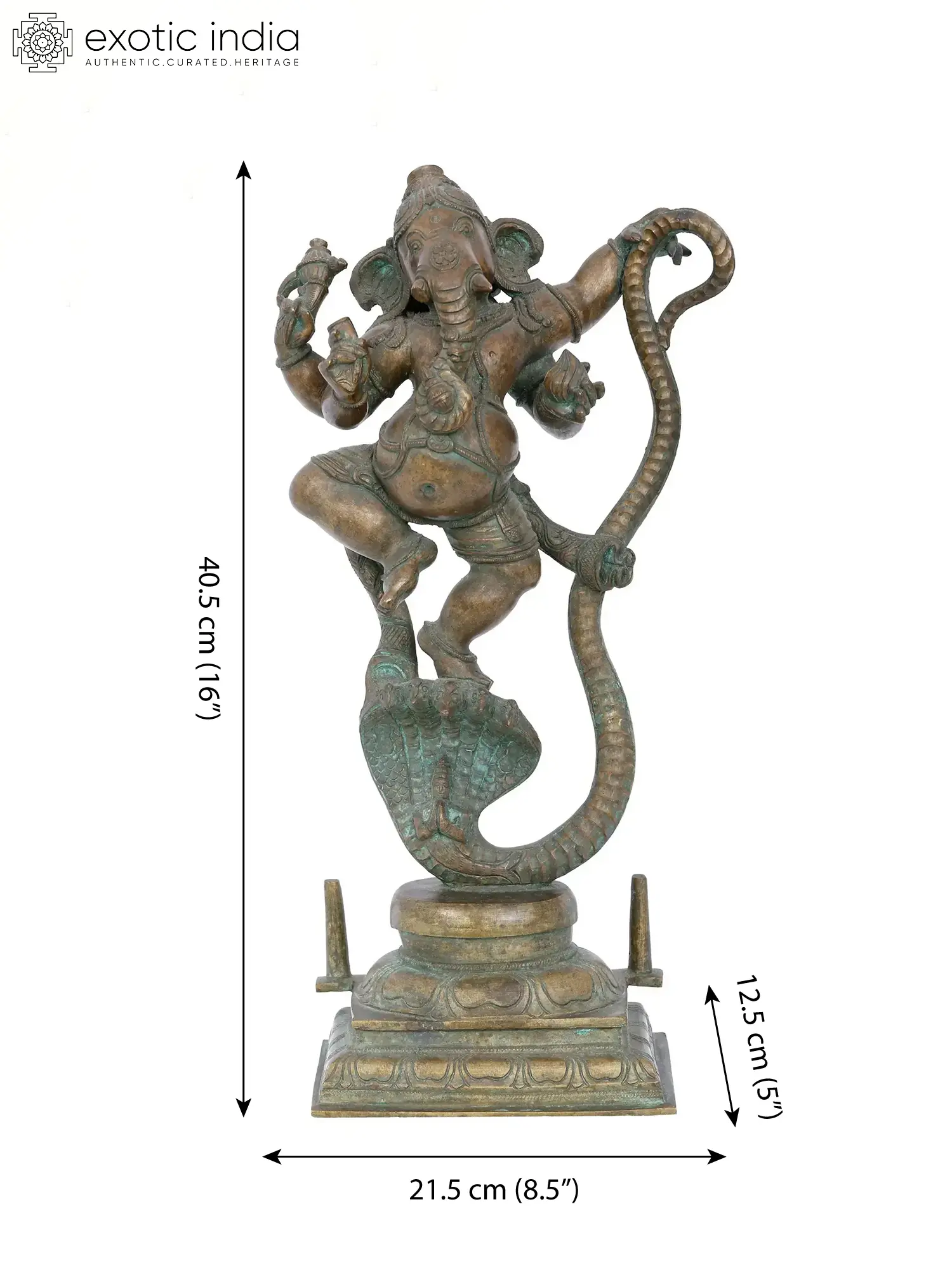 This mesmerising statue, crafted in Panchaloha Bronze from Swamimalai, using the ancient “Madhuchista Vidhana (Lost-Wax) technique”, captures Lord Ganesha, “the harbinger of auspicious beginnings”, in a cosmic dance upon a five-hooded serpent, embodying divine ecstasy. With a blend of elegance and power, Ganesha, “the Lord of the Lords”, wields a goad, the symbol of wisdom, his broken tusk, and a Modak, a sweet offering to the universe. The swirling dance becomes a cosmic ballet, each movement an ode to creation and destruction. This form of Ganesha signifies the harmonious balance of life’s dualities, the dance of joy within challenges, and the eternal rhythm of the universe conducted by the benevolent Lord.