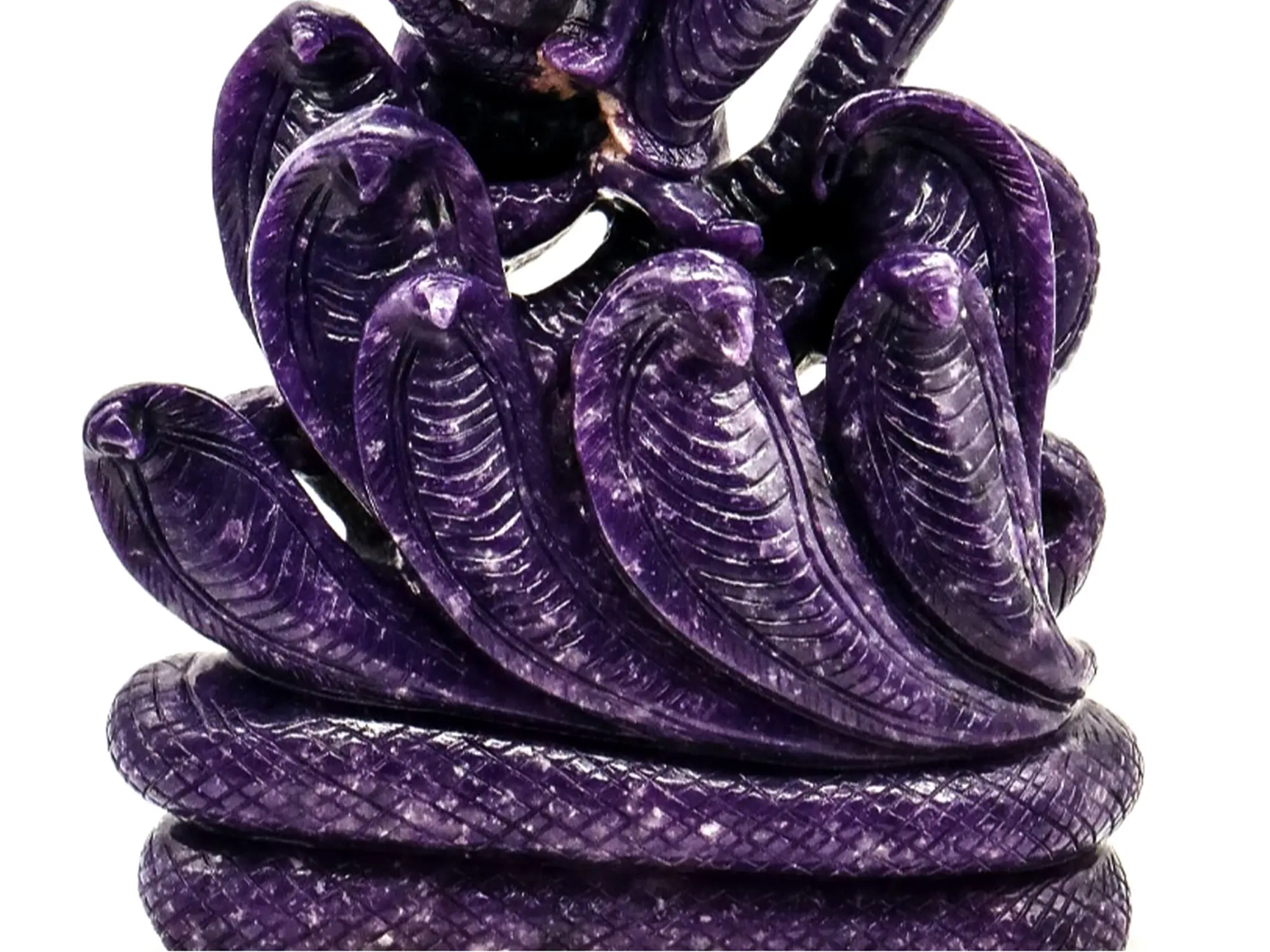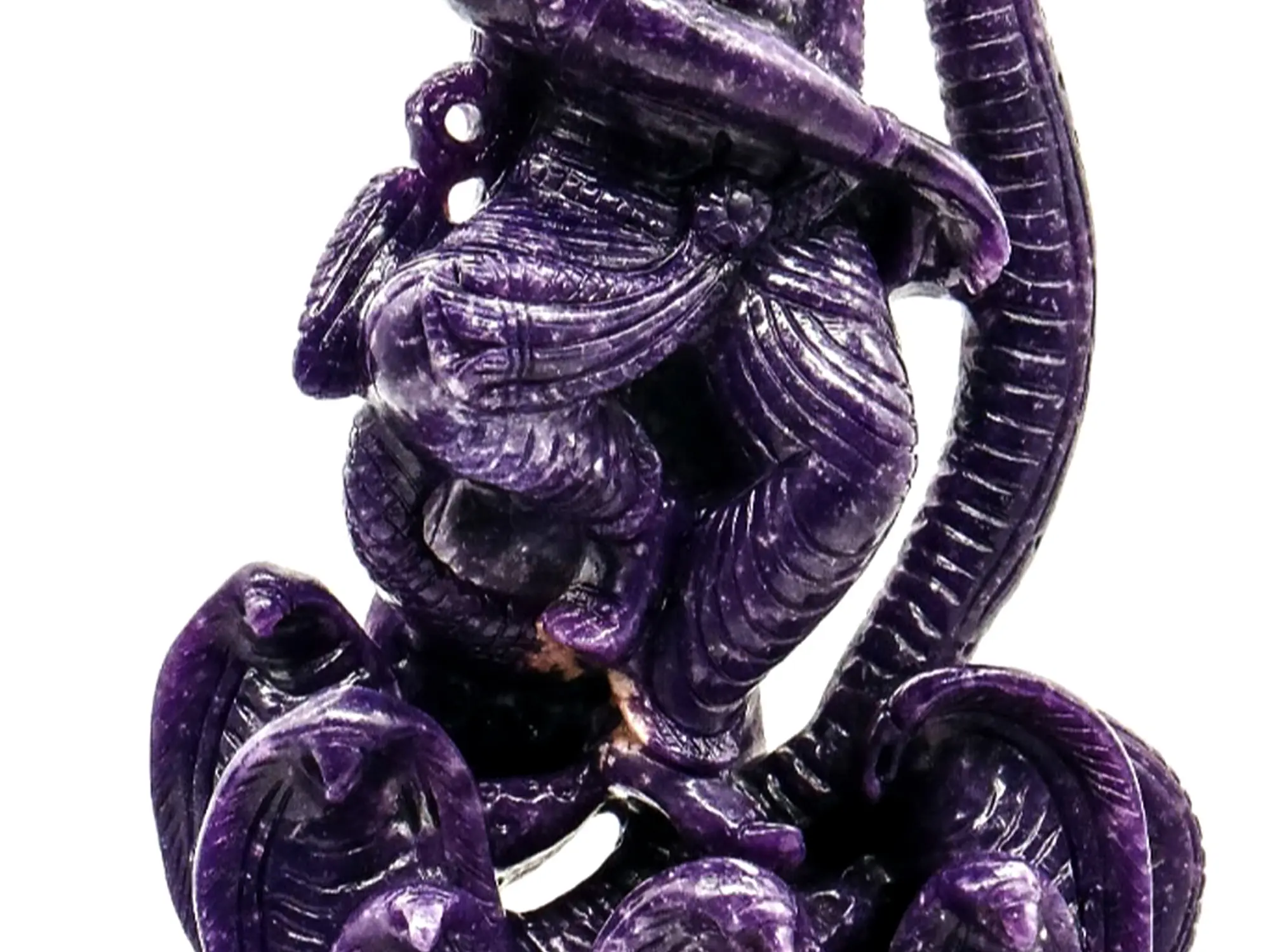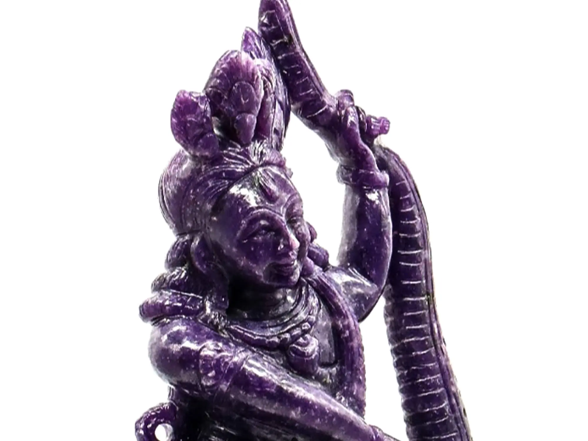 Lepidolite is a class of mica. The block of mineral from which this Krishna is carved is characterised by dense natural colour (deep purple). A great deal of detail and expression has been introduced into the mineral medium, especially in the serpentine musculature of Sheshanaga.