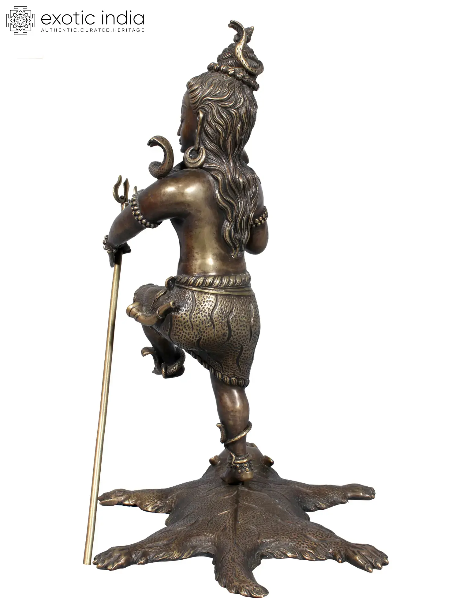 Pure brass medium; dark, solemn colour finish. A stance that is dynamic and expressive. Left foot raised in the air. The dancing figure balances on the trishoola in His left hand. From the damroo in His right hand emanates an ominous, all-annihilating music. The right foot is balanced on the skin of a tiger the Lord had vanquished.