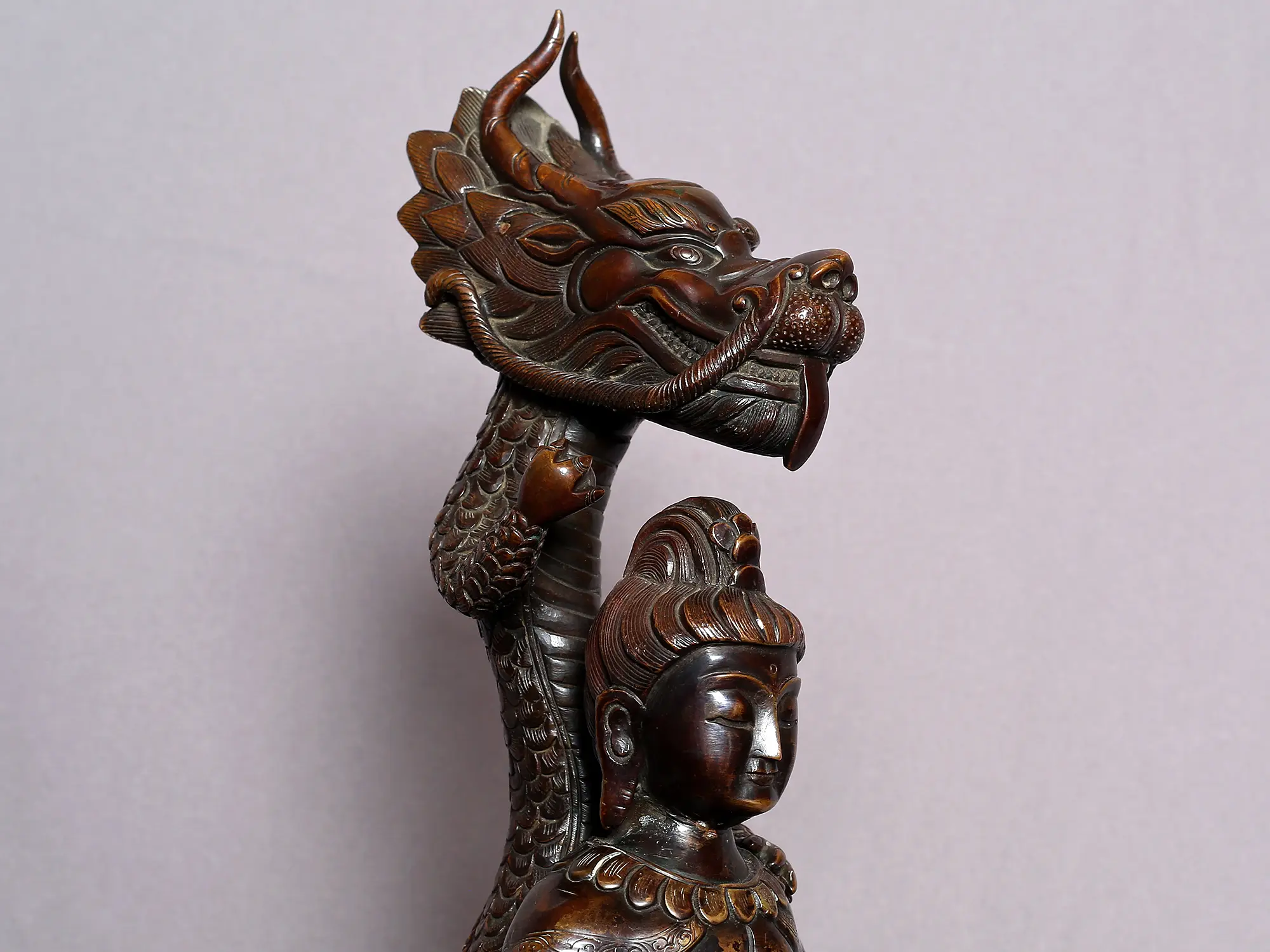 The dragon king murti that you see on this page is a gilded copper composition. Copper, which as a medium features heavily in the upper echelons of Nepalese sculptural tradition, is superior to brass and comes with pure metallic gilding such as in this one. It is to be found in the superb bone structure of Sagara’s face and details of His flowing robes.