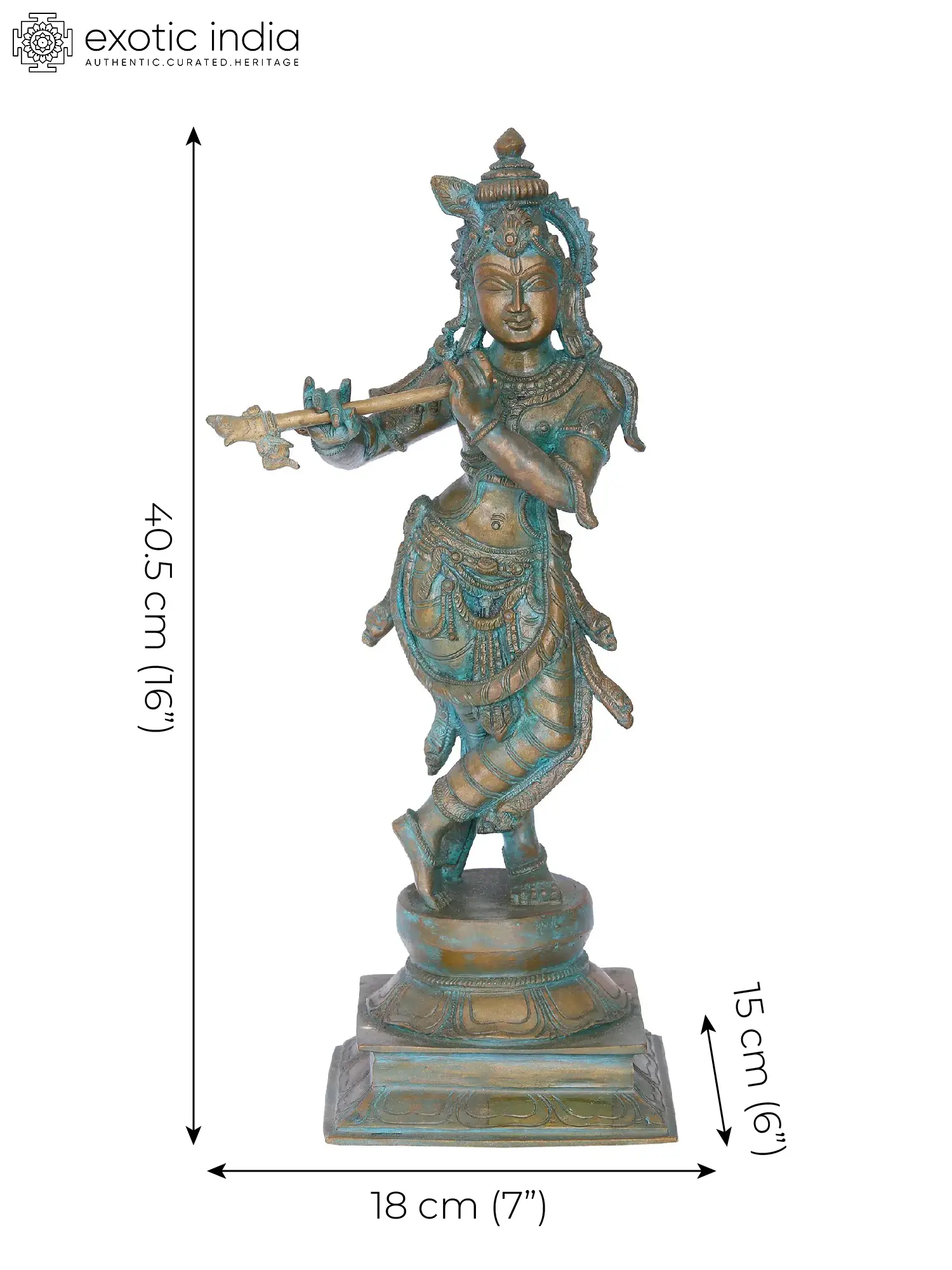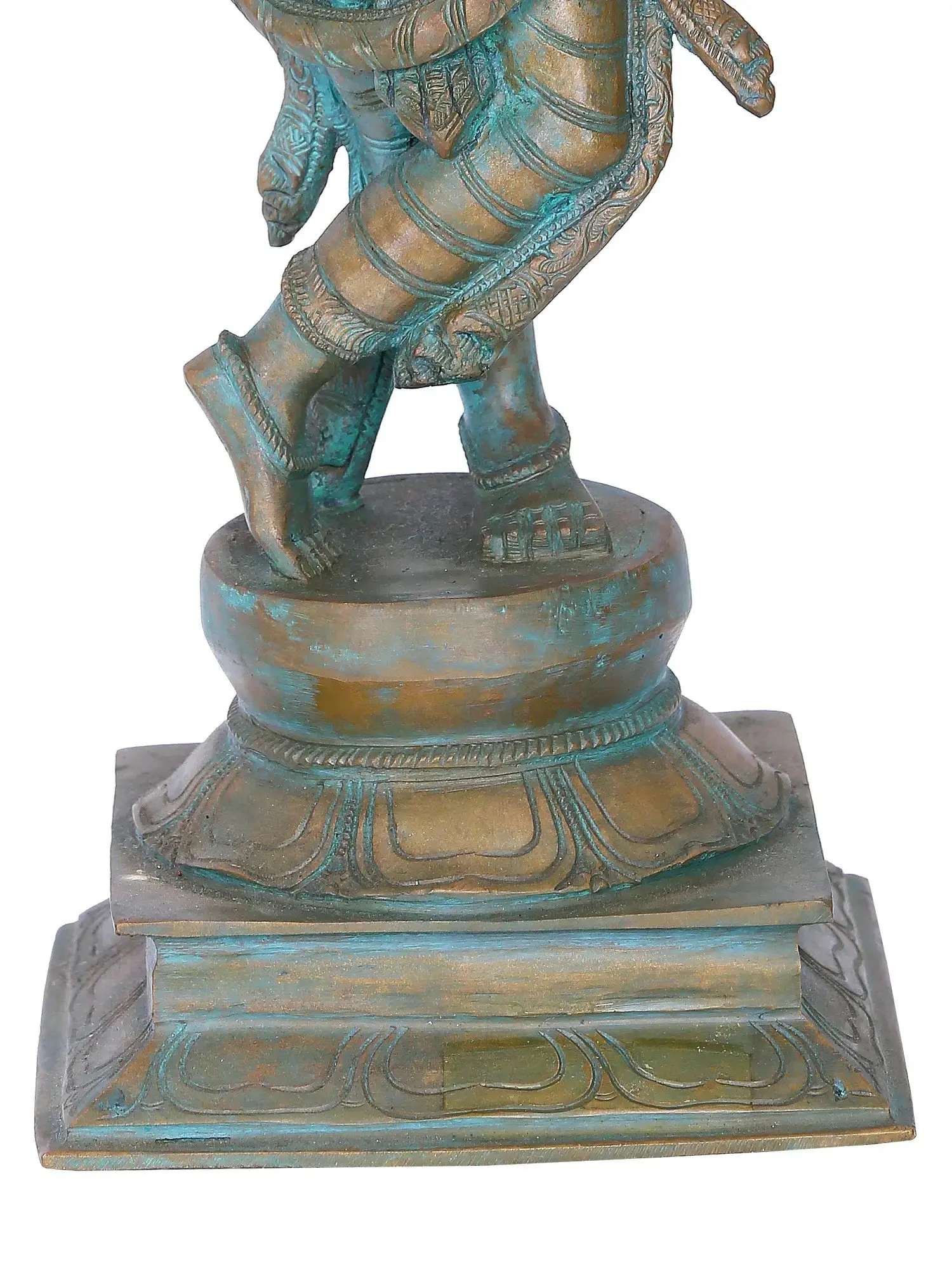 Enchant your space with the Fluting Murari sculpture, a divine creation through Madhuchista Vidhanam in Swamimalai's Panchaloha Bronze. This piece beautifully portrays Lord Krishna in the act of playing his divine flute. Beyond its artistic allure, the sculpture embodies the Hindu philosophical concept of 'Divine Melody,' signifying Krishna's divine music that resonates throughout the cosmos. The lost-wax technique intricately captures the details, inviting you to immerse yourself in the celestial melody and experience the divine harmony that transcends worldly boundaries.