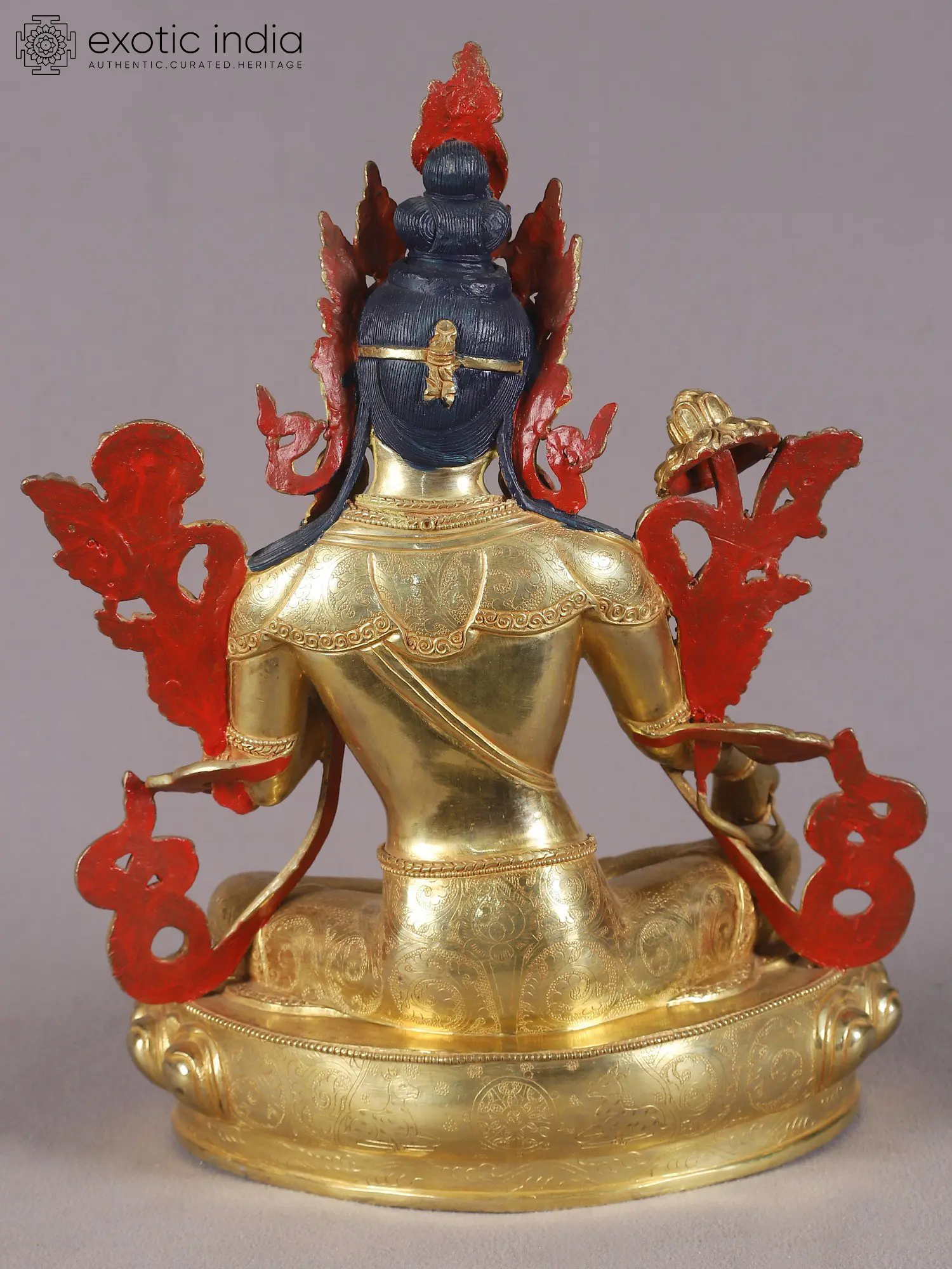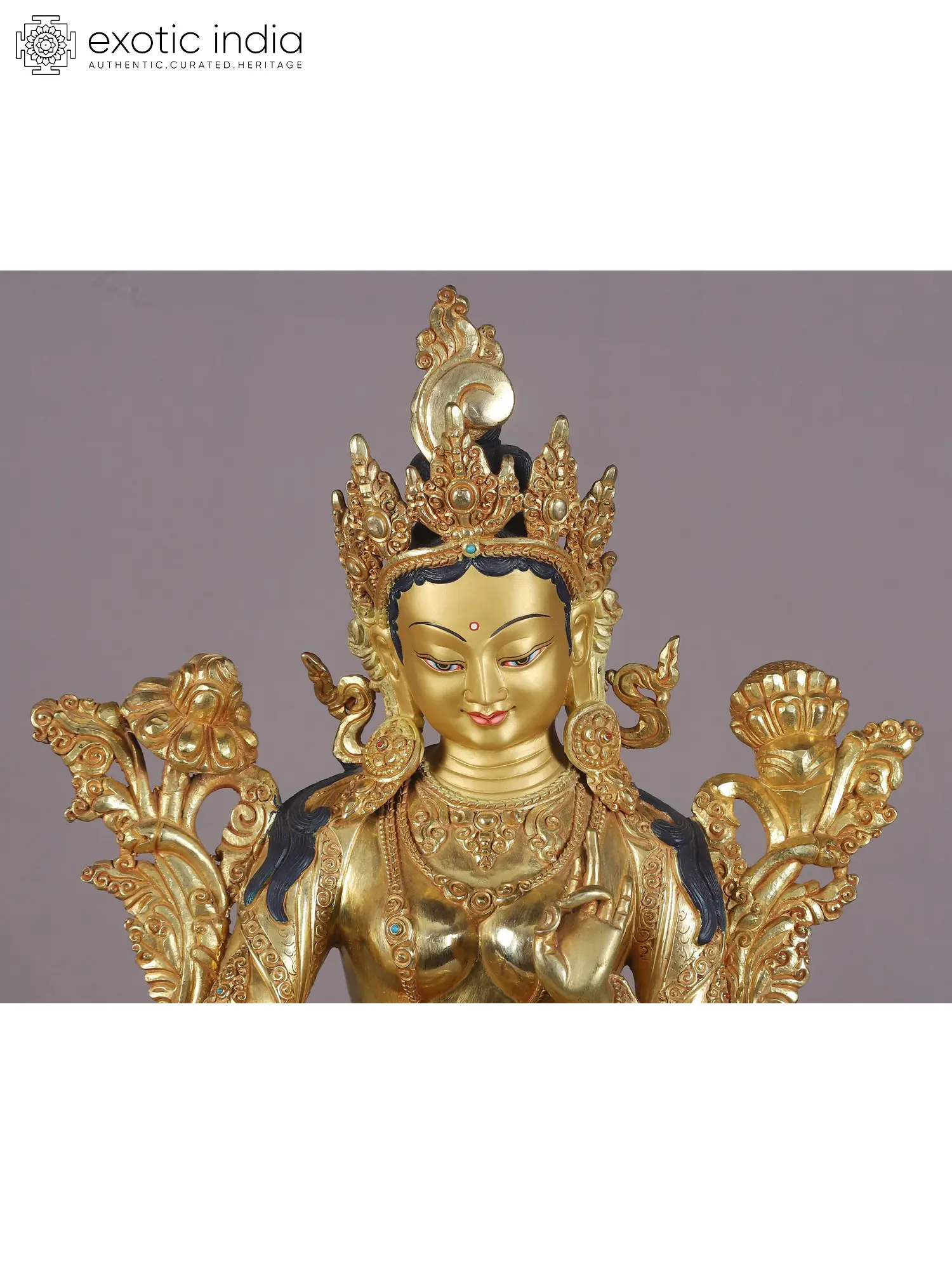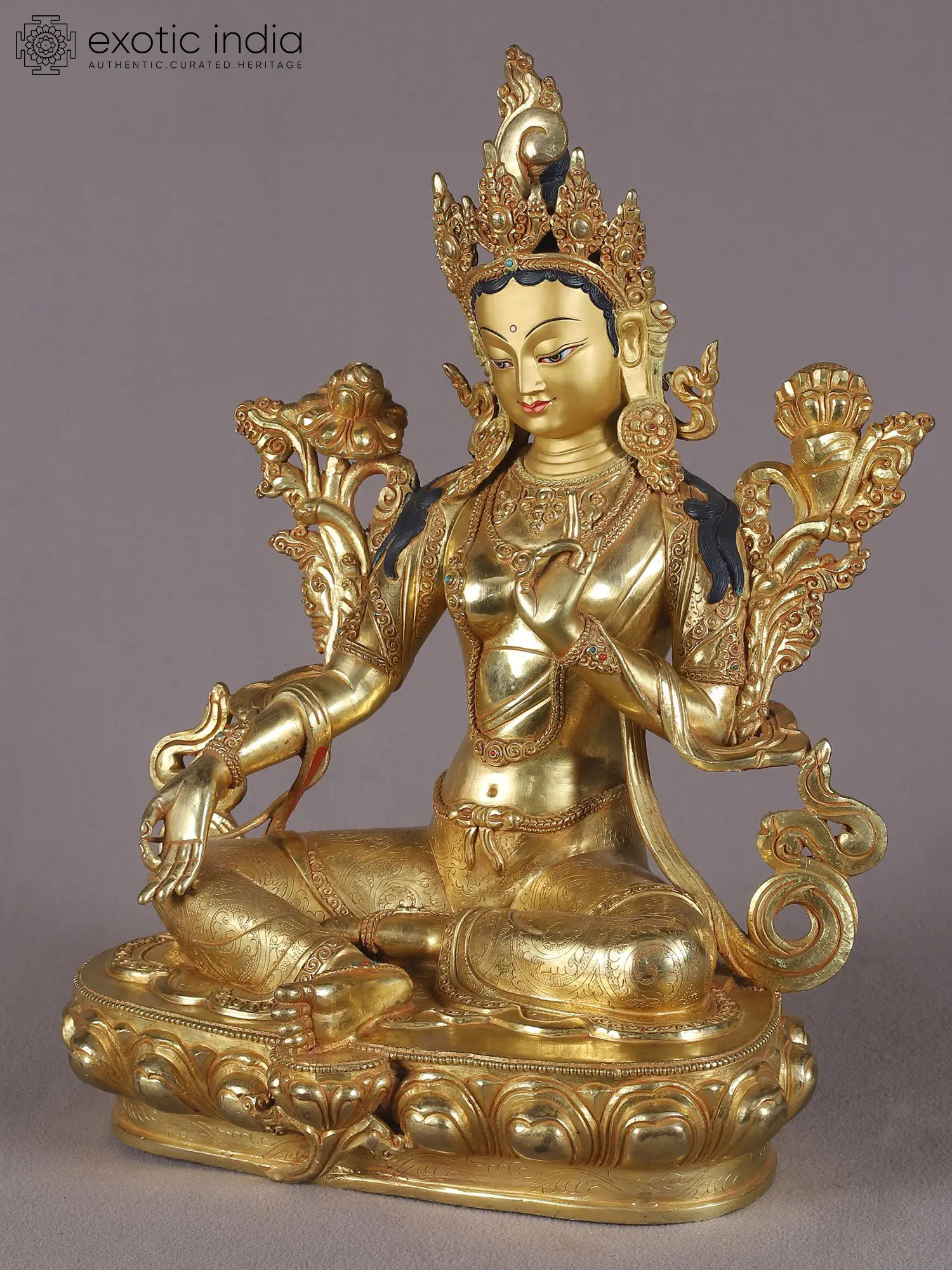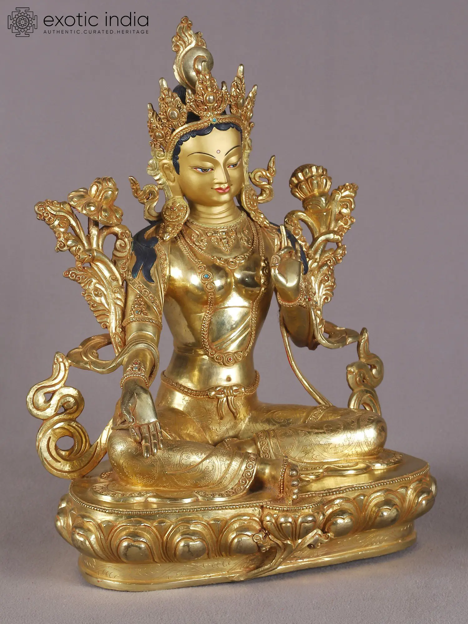 Dynamism in her flowing attire, mystically swaying frills of the golden crown and a stillness held in her blissful facial expressions, Goddess Tara is a source of soothing serenity for the devotee. Her both hands are gracefully posed in the Vitarka mudra, which embodies the granting of heartfelt wishes. Her Utpala rises up to both shoulders, which is a sign of wisdom. Her crown is adorned with precious jewels, symbolizing her spiritual wealth and spiritual power. The deity is seated on a lotus throne and her presence exudes an air of stillness that harmonizes her beauty.