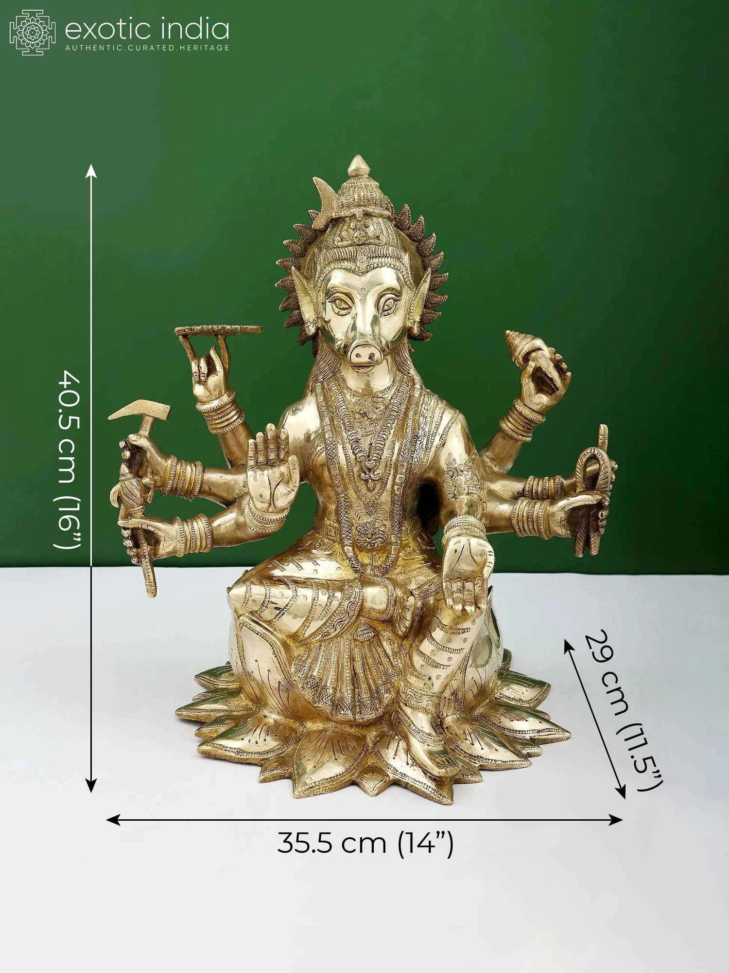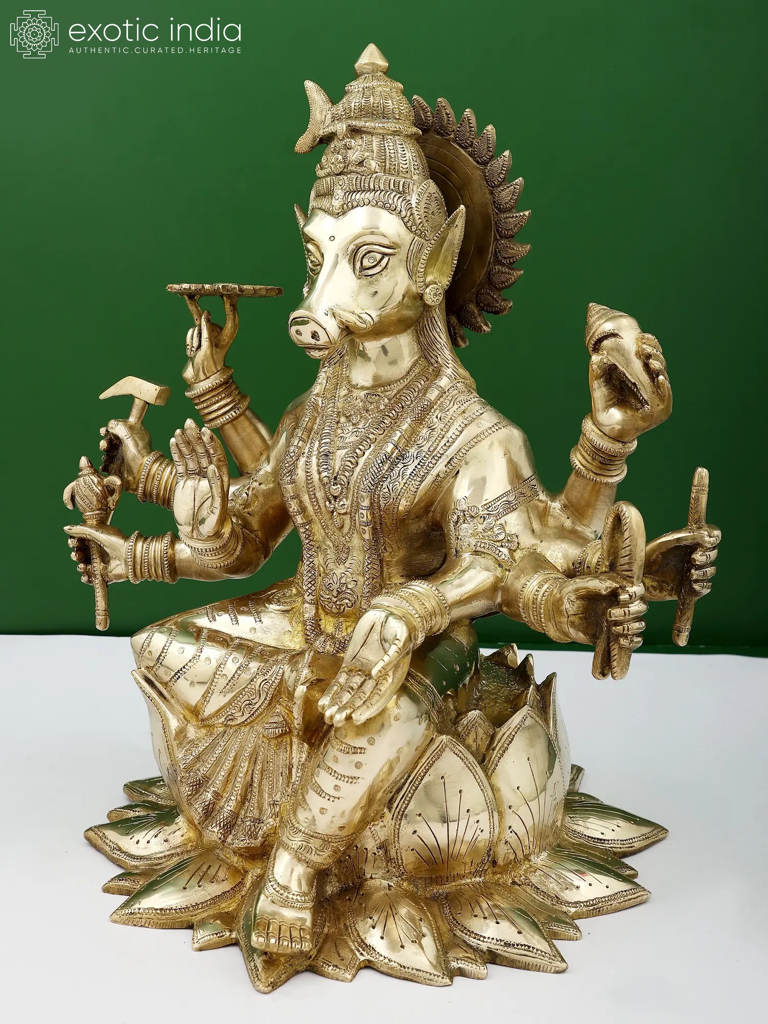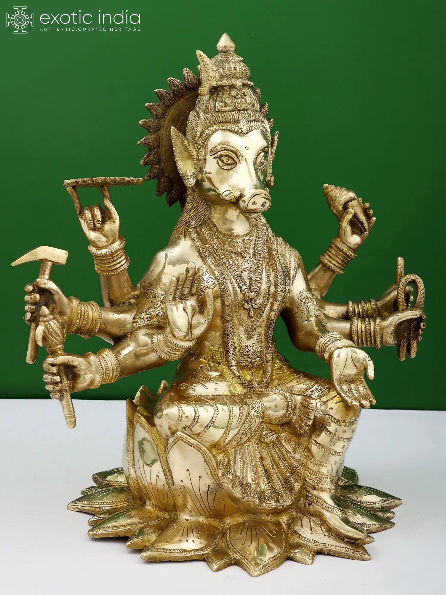 She is the ashtabhujadhari (eight-armed) maternal manifestation of Lord Varaha, the boar incarnation of Lord Vishnu. The unusual aspect of Her throne, a gigantic lotus bloom, is how the base layer of the lotus petals spread about on the floor beneath. Note how one of the flattened petals cradles the tender foot of Her pendant left leg.